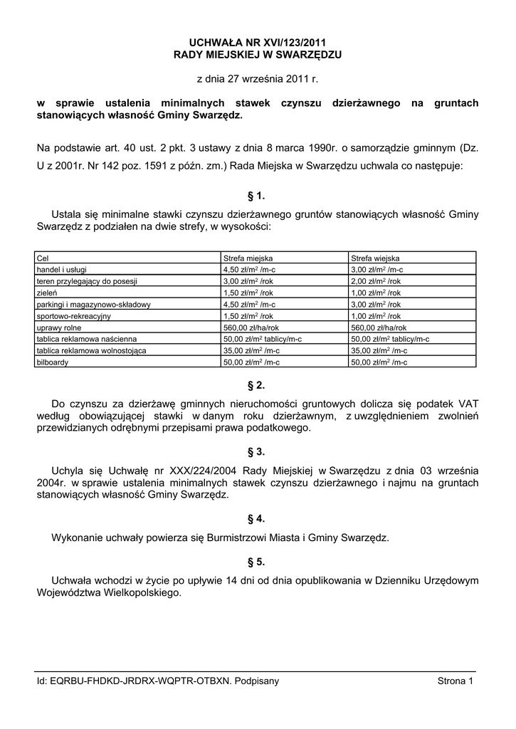 UCHWAŁA NR XVI/123/2011 RADY MIEJSKIEJ W SWARZĘDZU z dnia 27 września 2011 r. w sprawie ustalenia minimalnych stawek czynszu dzierżawnego na gruntach stanowiących własność Gminy Swarzędz. Na podstawie art. 40 ust. 2 pkt. 3 ustawy z dnia 8 marca 1990r. o samorządzie gminnym (Dz. U z 2001r. Nr 142 poz. 1591 z późn. zm.) Rada Miejska w Swarzędzu uchwala co następuje: § 1. Ustala się minimalne stawki czynszu dzierżawnego gruntów stanowiących własność Gminy Swarzędz z podziałen na dwie strefy, w wysokości: Cel handel i usługi teren przylegający do posesji zieleń parkingi i magazynowoskładowy sportoworekreacyjny uprawy rolne tablica reklamowa naścienna tablica reklamowa wolnostojąca bilboardy Strefa miejska 4,50 zł/m2 /mc 3,00 zł/m2 /rok 1,50 zł/m2 /rok 4,50 zł/m2 /mc 1,50 zł/m2 /rok 560,00 zł/ha/rok 50,00 zł/m2 tablicy/mc 35,00 zł/m2 /mc 50,00 zł/m2 /mc Strefa wiejska 3,00 zł/m2 /mc 2,00 zł/m2 /rok 1,00 zł/m2 /rok 3,00 zł/m2 /rok 1,00 zł/m2 /rok 560,00 zł/ha/rok 50,00 zł/m2 tablicy/mc 35,00 zł/m2 /mc 50,00 zł/m2 /mc § 2. Do czynszu za dzierżawę gminnych nieruchomości gruntowych dolicza się podatek VAT według obowiązującej stawki w danym roku dzierżawnym, z uwzględnieniem zwolnień przewidzianych odrębnymi przepisami prawa podatkowego. § 3. Uchyla się Uchwałę nr XXX/224/2004 Rady Miejskiej w Swarzędzu z dnia 03 września 2004r. w sprawie ustalenia minimalnych stawek czynszu dzierżawnego i najmu na gruntach stanowiących własność Gminy Swarzędz. § 4. Wykonanie uchwały powierza się Burmistrzowi Miasta i Gminy Swarzędz. § 5. Uchwała wchodzi w życie po upływie 14 dni od dnia opublikowania w Dzienniku Urzędowym Województwa Wielkopolskiego. Id: EQRBUFHDKDJRDRXWQPTROTBXN. Podpisany Strona 1 Uzasadnienie Analiza rynku nieruchomości miasta i gminy Swarzędz wyrażona w opinii szacunkowej dotyczącej określenia wysokości stawek czynszów dzierżawionych gruntów będących własnością Gminy Swarzędz, przeznaczonych do dzierżawy, wykazała konieczność ich uaktualnienia. Tabela stawek czynszów dzierżawnych i celów, na jakie przewiduje się oddawanie w dzierżawę została poszerzona o nowy cel: teren przylegający do posesji. Wymieniony cel dzierżawy będzie dotyczył terenów, które są zagospodarowane zielenią, ogrodzone i przyłączone do nieruchomości sąsiednich stanowiących własność prywatną, tym samym poprawiające warunki ich zagospodarowania. Zagospodarowanie tych terenów jest zgodne z zapisami miejscowego planu zagospodarowania przestrzennego bądź w przypadku braku jego obowiązywania ze Studium uwarunkowań i kierunków zagospodarowania przestrzennego, co powoduje, że mogłyby zostać zbyte, jako tereny mogące poprawić warunki zagospodarowania nieruchomości przyległych, natomiast z powodu braku zainteresowania nabyciem przez osoby uprawnione muszą zostać przeznaczone do wydzierżawienia. Wskazana stawka jest wyższa od stawki czynszu za dzierżawę gruntu na cel: zieleń, przez co zrekompensuje częściowo brak zainteresowania nabyciem tych terenów. Jednocześnie przy określeniu stawek czynszów dzierzawnych wprowadzono podział na dwie strefy: miejską i wiejską, który ma za zadanie zróżnicowanie poziomu stawek ze względu na położenie gruntu przeznaczonego do dzierżawy. W związku z tym, podjęcie niniejszej uchwały, która jednocześnie uchyla Uchwałę Nr XXX/224/2004 Rady Miejskiej z 3 wrzesnia 2004r. i wprowadza, nowe, aktualne stawki czynszów dzierżawnych na poziomie minimalnym jest w pełni uzasadnione. Id: EQRBUFHDKDJRDRXWQPTROTBXN. Podpisany Strona 1