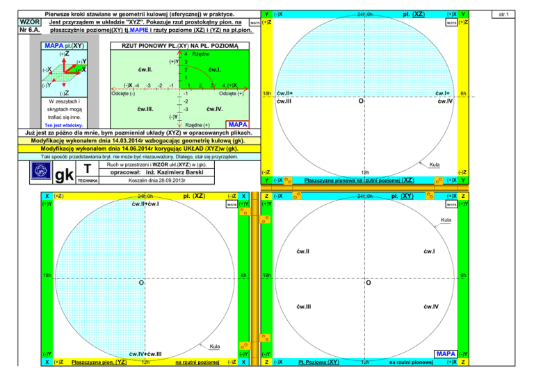 Pierwsze kroki stawiane w geometrii kulowej (sferycznej) w praktyce. Y (-)X Jest przyrządem w układzie "XYZ". Pokazuje rzut prostokątny pion. na Nr4/15 (+)Z płaszczyźnie poziomej(XY) tj.MAPIE i rzuty poziome (XZ) i (YZ) na pł.pion. WZÓR Nr 6.A. MAPA pł.(XY) (+)Z (+)Y (-)X (+)X 24h;0h pł. (XZ) (+)X Y Nr2/16 (+)Z RZUT PIONOWY PŁ.(XY) NA PŁ. POZIOMĄ 4 (+)Y ćw.II. Rzędne 3 ćw.I. 2 1 (-)Y (-)X -4 (-)Z -3 -2 -1 1 2 W zeszytach i 4 (+)X 3 -1 Odcięte (-) Odcięte (+) 18h -2 ćw.III. skryptach mogą -3 ćw.II+ ćw.III ćw.I+ ćw.IV O 6h ćw.IV. (-)Y trafiać się inne. MAPA Rzędne (+) Ten jest właściwy. Już jest za późno dla mnie, bym pozmieniał układy (XYZ) w opracowanych plikach. Modyfikację wykonałem dnia 14.03.2014r wzbogacając geometrię kulową (gk). Modyfikację wykonałem dnia 14.06.2014r korygując UKŁAD (XYZ)w (gk). Taki sposób przedstawiania brył, nie może być niezauważony. Dlatego, stał się przyrządem. skrypt Romany (R) gk dla wszystkich ludzi świata gk T Ruch w przestrzeni i WZÓR ukł.(XYZ) w (gk). opracował: inż. Kazimierz Barski (-)Z TECHNIKA Koszalin dnia 28.09.2013r Y X (+Z) (+)Y 24h;0h Kula pł. (XZ) (-)Z ćw.II+ćw.I Nr3/16 X (+)Y (-)Z 12h (-)X Płaszczyzna pionowa na rzutni poziomej (XZ) Z (-)X (+)Y 24h;0h (+)X Y pł. (XY) (+)X Nr1/15 Z (+)Y Kula ćw.II 18h 6h ćw.I 18h 6h O O ćw.III ćw.IV Kula ćw.IV+ćw.III (-)Y X (+)Z Płaszczyzna pion. (YZ) 12h na rzutni poziomej (-)Z (-)Y (-)Y X Z MAPA (-)X Pł. Pozioma (XY) 12h na rzutni pionowej (+)X (-)Y Z str.1 Pierwsze kroki stawiane w geometrii kulowej (sferycznej) w praktyce. PRZYRZĄD: UKŁAD: (XYZ) Nr4/16 Y (-)X (+)Z 24h;0h pł. (XZ) (+)X Y Nr2/16 (+)Z POWIĄZANIA WIDZIANE W SPOSÓB OBRAZOWY WG PŁASZCZYZN: X→(XZ) X Z X Z (XY) (YZ) MAPA Ma dodatkowo nr4. Może Y→(YZ) Y Y Y 18h być inna płaszczyzna lub Z inny rysunek np. pomocniczy, ćw.II+ ćw.III ćw.I+ ćw.IV O 6h szczegół itp. MODYFIKACJA ZWIĄZANA Z REORIENTACJĄ UKŁADU (XYZ). DN.14.06.2014 ZAMIENIAM POŁOŻENIE OSI (X) Z OSIĄ (Y). skrypt Romany (R) gk dla wszystkich ludzi świata gk T Ruch w przestrzeni i WZÓR ukł.(XYZ) w (gk). opracował: inż. Kazimierz Barski (-)Z TECHNIKA Koszalin dnia 28.09.2013r Y X (+Z) (+)Y 24h;0h pł. (YZ) ćw.II+ćw.I (-)Z Nr3/16 X (+)Y Płaszczyzna pionowa na rzutni poziomej (XZ) Z (-)X (+)Y 24h;0h 6h 12h Z (+)Y 6h O ćw.IV+ćw.III Płaszczyzna pion. (YZ) (+)X ćw.I ćw.III X (+)Z pł. (XY) 18h O (-)Y (+)X Y Nr1/16 ćw.II 18h (-)Z 12h (-)X na rzutni poziomej (-)Z (-)Y (-)Y X Z ćw.IV (-)Y (-)X Pł. Pozioma (XY) 12h MAPA (+)X Z str.2 DODATKOWY OBRAZ UKŁADU (XYZ) POKAZANY Z UKOSA W KULI I SZEŚCIANIE. str.3 Z → (±) Wysokość Y → (±) Głębokość; Rzędne X → (±) Szerokość; Odcięte 24h;0h (+)Z (+)Z ćw.I.górna (+)Y kuli (+)Y MAPA ćw.II. MAPA ćw.I. 18h (-)X (+)X 6h O MAPA ćw.III. MAPA ćw.II. MAPA ćw.I. MAPA ćw.IV. (-)X (+)X O MAPA ćw.III. MAPA ćw.IV. ćw.I.dolna kuli (-)Y (-)Y 12h XZ → Obroty na tej płaszczyźnie nazywam równoleżnikowe YZ → Obroty na tej płaszczyźnie nazywam południkowe Z → Obrót wokół osi (Z) od godz.0h w prawo wg uznania i strzałki zegara (24h). (-)Z W KULI i SZEŚCIANIE centralne miejsce w UKŁADZIE (XYZ) zajmuje punkt "O". skrypt Romany (R) gk dla wszystkich ludzi świata gk T Ruch w przestrzeni i WZÓR ukł.(XYZ) w (gk). TECHNIKA Koszalin dnia 14.06.2013r opracował: inż. Kazimierz Barski