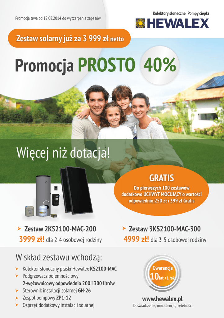 Kolektory słoneczne Pompy ciepła Promocja trwa od 12.08.2014 do wyczerpania zapasów Zestaw solarny już za 3 999 zł netto Promocja PROSTO 40% Więcej niż dotacja! GRATIS Do pierwszych 100 zestawów dodatkowo UCHWYT MOCUJĄCY o wartości odpowiednio:250 zł i 399 zł Gratis Zestaw 2KS2100-MAC-200 Zestaw 3KS2100-MAC-300 3999 zł! dla 2-4 osobowej rodziny 4999 zł! dla 3-5 osobowej rodziny W skład zestawu wchodzą: Kolektor słoneczny płaski Hewalex KS2100-MAC Podgrzewacz pojemnościowy 2-wężownicowy odpowiednio 200 i 300 litrów Sterownik instalacji solarnej GH-26 Zespół pompowy ZP1-12 Osprzęt dodatkowy instalacji solarnej Gwarancja 10lat +1 rok www.hewalex.pl Doświadczenie, kompetencje, rzetelność Więcej niż dotacja! Spójrz jak PROSTO możesz uzyskać minimum 40% Dopłaty do zestawu Solarnego Hewalex PROSTO 40% Standardowe programy dotacji np. PROSUMENT, NFOŚiGW 1. Wybór zestawu Wybór zestawu Zestaw 2KS2100-MAC-200 Wybór operatora (banku) za 3999 zł! Dokumentacja dla operatora Zestaw 3KS2100-MAC-300 za 4999 zł! Wybór wykonawcy Wniosek i umowa na dotację/kredyt 2. Wybór wykonawcy Szybszy zysk Zakup i montaż Brak formalności, umowy kredytowej i obciążających rat Bez podatku dochodowego Protokół zdawczo-odbiorczy 3. Zakup i montaż Podatek dochodowy PIT Spłaty rat kredytowych Realna dopłata w programie Prosument wynosi ok. 10%! Oszczędność minimum 40%! Wyliczenia Hewalex PROSTO 40% Instalacja solarna z dotacją ZESTAW: 2 kolektory płaskie, 200 litrów Cena zestawu netto: 2 kolektory płaskie, podgrzewacz 200 litrów. Zestaw 2K2100-MAC-200 Koszt zestawu netto: 2KS2100-MAC-200 ZESTAW: 2 kolektory płaskie, 200 litrów 3.999,-43% 3.999,- Średnia cena zestawu netto: 2 kolektory płaskie, podgrzewacz wody użytkowej 200 litrów 7.025,- Rzeczywista kwota dotacji programu Prosument (z 20%) ~10% Koszt zestawu netto dla Klienta po odjęciu realnej kwoty dotacji 6.320,- Cennik ma charakter informacyjny i nie stanowi oferty w myśl Kodeksu Cywilnego. Do cen należy doliczyć podatek VAT. Regulamin znajduje się na www.hewalex.pl