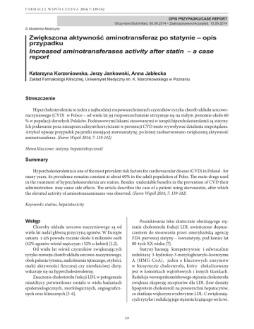 139 FA R M A C J A W S P Ó Ł C Z E S N A 2014; 7: 139-142 OPIS PRZYPADKU/CASE REPORT Otrzymano/Submitted: 08.09.2014 • Zaakceptowano/Accepted: 15.09.2014 © Akademia Medycyny Zwiększona aktywność aminotransferaz po statynie – opis przypadku Increased aminotransferases activity after statin – a case report Katarzyna Korzeniowska, Jerzy Jankowski, Anna Jabłecka Zakład Farmakologii Klinicznej, Uniwersytet Medyczny im. K. Marcinkowskiego w Poznaniu Streszczenie Hipercholesterolemia to jeden z najbardziej rozpowszechnionych czynników ryzyka chorób układu sercowonaczyniowego (CVD) w Polsce – od wielu lat jej rozpowszechnienie utrzymuje się na stałym poziomie około 60 % w populacji dorosłych Polaków. Podstawowymi lekami stosowanymi w terapii hipercholesterolemii są statyny. Ich podawanie poza niezaprzeczalnymi korzyściami w prewencji CVD może wywoływać działania niepożądane. Artykuł opisuje przypadek pacjentki stosującej atorwastatynę, po której zaobserwowano zwiększoną aktywność aminotransferaz. (Farm Współ 2014; 7: 139-142) Słowa kluczowe: statyny, hepatotoksyczność Summary Hypercholesterolemia is one of the most prevalent risk factors for cardiovascular disease (CVD) in Poland - for many years, its prevalence remains constant at about 60% in the adult population of Poles. The main drugs used in the treatment of hypercholesterolemia are statins. Besides undeniable benefits in the prevention of CVD their administration may cause side effects. The article describes the case of a patient using atorvastatin, after which the elevated activity of aminotransaminases was observed. (Farm Współ 2014; 7: 139-142) Keywords: statins, hepatotoxicity Wstęp Poszukiwania leku skutecznie obniżającego stężenie cholesterolu frakcji LDL uwieńczono dopuszczeniem do stosowania przez amerykańską agencję FDA pierwszej statyny – lowastatyny, pod koniec lat 80-tych XX wieku [7]. Statyny hamują kompetetywnie i odwracalnie reduktazę 3-hydroksy-3-metyloglutarylo-koenzymu A (HMG-CoA), jeden z kluczowych enzymów w biosyntezie cholesterolu, który zlokalizowany jest w komórkach wątrobowych i innych tkankach. Redukcja wewnątrzkomórkowego stężenia cholesterolu zwiększa ekspresję receptorów dla LDL (low-density lipoprotein cholesterol) na powierzchni hepatocytów, co skutkuje większym wychwytem LDL-C zwiększających ryzyko i redukcją jego stężenia krążącego we krwi. Choroby układu sercowo-naczyniowego są od wielu lat nadal główną przyczyną zgonów. W Europie umiera z ich powodu rocznie około 4 milionów osób (42% zgonów wśród mężczyzn i 52% u kobiet) [1,2]. Od wielu lat wśród czynników zwiększających ryzyko rozwoju chorób układu sercowo-naczyniowego, obok palenia tytoniu, nadciśnienia tętniczego, otyłości, małej aktywności fizycznej czy niewłaściwej diety, wskazuje się na hypercholesterolemię. Znaczenie cholesterolu frakcji LDL w patogenezie miażdżycy potwierdzone zostało w wielu badaniach epidemiologicznych, morfologicznych, angiograficznych oraz klinicznych [3-6]. 139 FA R M A C J A W S P Ó Ł C Z E S N A 2014; 7: 139-142 Zmniejsza się również udział LDL w lipoproteinach zawierających ApoB, w tym cząstek bogatych w trójglicerygy (TG). Poza obniżeniem stężenia LDL-C leki te zmniejszają stężenie TG, a także mogą prowadzić do wzrostu stężenia HDL-C. Skuteczność kliniczna statyn opiera się również na ich efekcie plejotropowym statyn – poprawie funkcji śródbłonka, stabilizacji blaszki miażdżycowej, działaniu przeciwzakrzepowym i przeciwzapalnym [2,8-10]. Statyny różnią się farmakodynamiką i farmakokinetyką między innymi – biodostępnością, wchłanianiem, wiązaniem z białkami, wydalaniem [11]. Są dobrze tolerowane przez chorych i rzadko powodują objawy niepożądane. Zalecono dotychczasową farmakoterapię oraz włączono dodatkowo atorwasterol w dawce 40 mg i kwas acetylosalicylowy 75 mg. Po ok. 4 tygodniach pacjentka bez konsultacji z lekarzem odstawiła statynę z powodu nudności, wymiotów i dyskomfortu w jamie brzusznej. Stosowała pozostałe leki bez zmian. Kolejne kontrolne badania krwi po miesiącu wykazały wzrost aktywności aminotransferaz: alaninowej (ALAT) – 1592 U/I (norma < 40 U/I) i asparginowej (ASPAT) – 1046 U/I (norma < 40 U/I). Po wdrożeniu lekkostrawnej diety z ograniczeniem tłuszczów i preparatu L-asparaginianu L-ornityny (300 mg/dobę) z choliną (105 mg) aktywność aminotransferaz w badaniu wykonanym 3 miesiące później wykazywała wartości prawidłowe: AlAT – 37 U/I, AspAT – 22 U/I. Ponowne oznaczenie profilu lipidowego w IV.2014 r. (bez statyny): TC – 212, HDL – 63, LDL – 126, TG – 112 mg%. Pacjentka nie pali papierosów i nie nadużywa alkoholu. Wcześniej nigdy nie występowały u niej objawy niepożądane związane z przyjmowanymi lekami. Opis przypadku 58-letnia pacjentka nie pracująca zawodowo z przebytym przed wielu laty zapaleniem trzustki została skierowana przez lekarza rodzinnego do Poradni Kardiologicznej w celu diagnostyki wysiłkowego dyskomfortu w klatce piersiowej. Z powodu podobnych dolegliwości wysiłkowych, które występowały w przeszłości chorą hospitalizowano w 2005 roku. Wykonana wówczas koronarografia ujawniła prawidłowy obraz angiograficzny tętnic wieńcowych. W czerwcu 2013 roku chora była ponownie hospitalizowana z powodu bólów w klatce piersiowej. Próba wysiłkowa wykluczyła wysiłkowe niedokrwienie serca a w badaniu echokardiograficznym z odchyleń od normy stwierdzono jedynie nieprawidłowy wskaźnik E/A 0,74 (norma > 1). Podczas 24-godzinnego monitorowania EKG zarejestrowano kilkusekundowy epizod częstoskurczu nadkomorowego. Badania laboratoryjne krwi wykazały nieprawidłowy profil lipidowy: TC – 216 mg/dl( norma < 190 ), HDL – 58 mg/dl (norma > 46), LDL – 113 mg/dl( norma < 115), TG -225 mg/dl ( norma < 190 ) oraz podwyższone stężenie glukozy na czczo – 117 mg/dl ( norm