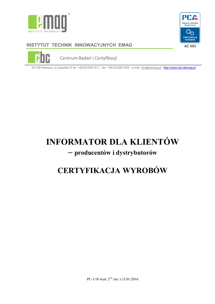INSTYTUT TECHNIK INNOWACYJNYCH EMAG Centrum Badań i Certyfikacji 40-189 Katowice, ul Leopolda 31 tel. +48/32/2007-511, fax. +48/32/2007-509, e-mail: [email protected], http://www.cbc.ibemag.pl INFORMATOR DLA KLIENTÓW – producentów i dystrybutorów CERTYFIKACJA WYROBÓW PC-1/10 wyd. 2(3) zm. z 12.01.2016 Instytut Technik Innowacyjnych EMAG Informator dla Klientów – producentów i dystrybutorów Certyfikacja wyrobów zał. PC-1/10 Wyd.: 2(3) zm. z dn.: 12.01.2016 r. strona / stron: 2 / 4 Spis treści 1 Wprowadzenie ............................................................................................................................................................... 3 2 Certyfikacja wyrobów ................................................................................................................................................... 3 3 Opłaty ............................................................................................................................................................................. 4 Instytut Technik Innowacyjnych EMAG 1 Informator dla Klientów – producentów i dystrybutorów Certyfikacja wyrobów zał. PC-1/10 Wyd.: 2(3) zm. z dn.: 12.01.2016r. strona / stron: 3 / 4 Wprowadzenie Centrum Badań i Certyfikacji (CBC) jest komórką organizacyjną Instytutu Technik Innowacyjnych EMAG, w której ze względu na posiadane doświadczenie, wiedzę specjalistyczną oraz zaplecze laboratoryjne realizuje się procesy certyfikacji wyrobów. Działalność certyfikacyjna, przyjęta przez Centrum Badań i Certyfikacji, oparta jest na zasadach dobrowolnej certyfikacji wyrobów przeprowadzanej przez stronę trzecią. Zakres działalności Centrum Badań i Certyfikacji w ramach programów certyfikacji o akronimach: CBC-1b – obejmuje prowadzenie procesów certyfikacji serii wyrobów w programie typu 1b (wg PN-EN ISO/IEC 17067:2014-01); CBC-1a – obejmuje prowadzenie procesów certyfikacji wyrobów w programie typu 1a (wg PN-EN ISO/IEC 17067:2014-01) – wykonywany poza zakresem akredytacji; na zgodność na zgodność z dokumentami normatywnymi (normy międzynarodowe, europejskie i krajowe oraz własnymi, opracowanymi w jednostce, Kryteriami Technicznymi oceny wyrobu. Podstawę oceny w procesie certyfikacji mogą stanowić wyniki badań przeprowadzonych w laboratoriach własnych EMAG (lub innych akredytowanych laboratoriach zakwalifikowanych przez CBC na listę podwykonawców) lub w uzasadnionych przypadkach na podstawie wyników dostarczonych przez klienta. Jednostka certyfikująca wyroby (JCW) Instytutu Technik Innowacyjnych EMAG ma ustanowiony i wdrożony system zarządzania, spełniający wymagania normy PN-EN ISO/IEC 17065:2013-03, którego celem jest stałe budowanie zaufania klientów do naszej jednostki poprzez wysoką jakość świadczonych usług oraz stałe rozszerzanie zakresu akredytacji i możliwości badawczych laboratoriów o nowe grupy wyrobów. Centrum Badań i Certyfikacji ITI EMAG poprzez wieloletnie doświadczenie i działania skierowane na klienta gwarantuje niezależność działań oraz zachowanie poufności informacji na każdym etapie procesu certyfikacji. 2 Certyfikacja wyrobów Certyfikacja wyrobów w JCW – Centrum Badań i Certyfikacji Instytutu Technik Innowacyjnych EMAG jest opisana w systemie zarządzania udostępnianym na życzenie klientom JCW w siedzibie EMAG. Szczegółowa oferta prowadzenia procesów certyfikacji wyrobów znajduje się w odpowiednim Programie Certyfikacji Wyrobów CBC-xx – udostępnianym klientom na życzenie w siedzibie JCW. W niniejszym informatorze zamieszczono podstawowe dane pozwalające na zapoznanie się z ofertą JCW EMAG, dotarciem do niezbędnych dokumentów potrzebnych do rozpoczęcia procesu certyfikacji wyrobu (lub wyrobów), a także poznanie zakresu certyfikowanych wyrobów. Adres jednostki certyfikującej wyroby: Instytut Technik Innowacyjnych EMAG ul. Leopolda 31, 40-189 Katowice www.cbc.ibemag.pl Dokumenty do pobrania (wniosek o przeprowadzenie procesu certyfikacji wyrobu) znajduje się na stronie www.cbc.ibemag.pl w zakładce „do pobrania” lub może zostać udostępniony elektronicznie w wersji edytowalnej (WORD) na życzenie klienta (wysyłka na adres e-mail). Aktualny certyfikat akredytacji nr AC 053 wraz z załącznikiem – aktualnym zakresem akredytacji AC 053 – znajduje się na stronie www.cbc.ibemag.pl w zakładce „certyfikaty”. Zakres akredytacji można również znaleźć na stronie Polskiego Centrum Akredytacji (PCA) pod nazwą AC 053. Zgodnie z przyjętym modelem opisanym w odpowiednim programie certyfikacji CBC-xx certyfikaty zgodności wydawane są na czas nieokreślony lub na czas określony z datą ważności maksymalnie 3 lata od daty wystawienia. Szczegóły są opisane w odpowiednim programie certyfikacji dostępnym w siedzibie jednostki. W przypadku uznawania wyników badań wykonanych przed złożeniem wniosku o certyfikację, wyniki badań nie mogą byś starsze niż 3 lata od daty złożenia wniosku. Instytut Technik Innowacyjnych EMAG 3 Informator dla Klientów – producentów i dystrybutorów Certyfikacja wyrobów zał. PC-1/10 Wyd.: 2(3) zm. z dn.: 12.01.2016r. strona / stron: 4 / 4 Opłaty Koszty związane z procesem certyfikacji i nadzorem ponosi Klient - posiadacz certyfikatu. Opłaty są ustalane indywidualnie dla każdego wyrobu (grupy wyrobów), procesu certyfikacji i nadzoru, bez stawiania nieuzasadnionych warunków finansowych dyskryminujących wnioskodawców i posiadaczy certyfikatów. Zasady ustalania opłat są zatwierdzane przez Dyrektora EMAG po ich zaopiniowaniu przez Radę ds. Certyfikacji i podlegają okresowej aktualizacji. Zasady ustalania opłat są udostępniane Klientom w siedzibie JCW. Najwyższe Kierownictwo Instytutu Technik Innowacyjnych EMAG zapewnia ciągłe finansowanie jednostki. Dodatkowo – EMAG jako instytut badawczy (w rozumieniu ustawy o instytutach badawczych) otrzymuje środki na działalność statutow