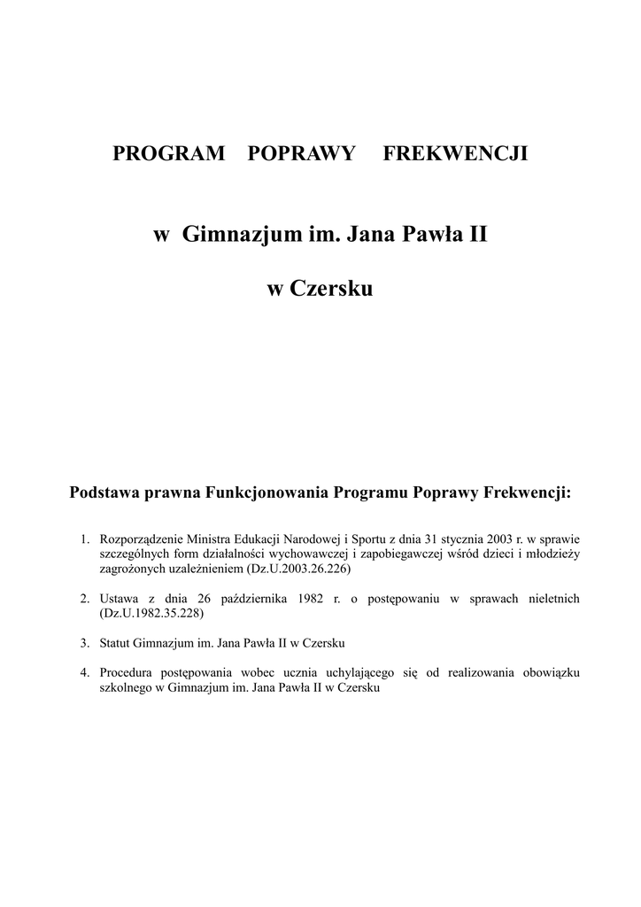PROGRAM POPRAWY FREKWENCJI w Gimnazjum im. Jana Pawła II w Czersku Podstawa prawna Funkcjonowania Programu Poprawy Frekwencji: 1. Rozporządzenie Ministra Edukacji Narodowej i Sportu z dnia 31 stycznia 2003 r. w sprawie szczególnych form działalności wychowawczej i zapobiegawczej wśród dzieci i młodzieży zagrożonych uzależnieniem (Dz.U.2003.26.226) 2. Ustawa z dnia 26 października 1982 r. o postępowaniu w sprawach nieletnich (Dz.U.1982.35.228) 3. Statut Gimnazjum im. Jana Pawła II w Czersku 4. Procedura postępowania wobec ucznia uchylającego się od realizowania obowiązku szkolnego w Gimnazjum im. Jana Pawła II w Czersku SPIS TREŚCI 1. Cele ogólne 2. Cele szczegółowe 3. Monitorowanie frekwencji uczniów przez wychowawcę klasy 4. Czynniki wpływające na niską frekwencję uczniów 5. System usprawiedliwień nieobecności i zwolnień z zajęć 6. Współpraca z rodzicami 7. Ewaluacja 8. Regulamin nagród i kar 9. Postanowienia końcowe 1 Cele ogólne 1. Poprawa frekwencji w szkole. 2. Opracowanie strategii postępowania wobec uczniów opuszczających zajęcia. 3. Zapobieganie powstawaniu niepowodzeń szkolnych, trudności w nauce. 2 Cele szczegółowe 1. Monitorowanie frekwencji w celu rozpoznania czynników wpływających na absencję uczniów. 2. Uświadomienie uczniom korzyści płynących z uczenia się i systematycznego chodzenia do szkoły. 3. Stosowanie w szkole jednolitego, spójnego systemu usprawiedliwiania nieobecności. 4. Zapoznanie uczniów i rodziców z systemem nagród i kar stosowanych w szkole związanych z frekwencją. 5. Ścisła współpraca wychowawców i rodziców w zakresie realizacji obowiązku szkolnego. 3 Bieżące monitorowanie frekwencji uczniów przez wychowawcę klasy 1. Wychowawca przechowuje wszystkie usprawiedliwienia i zwolnienia z zajęć do końca roku szkolnego. 2. Wychowawca na bieżąco analizuje powtarzających się nieobecności. frekwencję uczniów i wyjaśnia przyczynę 3. Wychowawca do 5 dnia każdego miesiąca podlicza średnią frekwencję klasy i poszczególnych uczniów, wypełniając odpowiednią tabelę w dzienniku lekcyjnym. 4. Pedagog - Felicja Chlebosz dokonuje zestawienia frekwencji w szkole i sporządza analizę frekwencji klas w terminie do 16 dnia każdego miesiąca oraz przedstawia ją Dyrekcji szkoły. 5. W stosunku do uczniów o niepokojąco niskiej frekwencji, u których stwierdzono wagarowanie oraz nieobecności nieusprawiedliwione, podejmuje się postępowanie wyjaśniające zgodnie z procedurą. 4 Poznanie czynników wpływających na niską frekwencję uczniów 1. Wychowawca kontaktuje się z rodzicami telefonicznie. W przypadku dłuższej nieobecności ucznia w szkole (powyżej 3 dni)- wzywa pisemnie rodzica przez sekretariat szkoły. 2. Wychowawca poznaje przyczyny nieobecności ucznia na zajęciach, podejmuje współpracę z pedagogiem szkolnym oraz z rodzicami a także wdraża działania w zakresie pomocy uczniowi. 3. Pedagog – Felicja Chlebosz oraz Dyrektor analizuje skuteczność podejmowanych przez wychowawcę działań ograniczających i zapobiegających nieobecność uczniów na zajęciach lekcyjnych. 5 Stosowanie jednolitego systemu usprawiedliwień nieobecności i zwolnień z zajęć Zasady usprawiedliwiania i zwalniania z zajęć lekcyjnych: 1. Do obowiązków ucznia należy przedstawić wychowawcy usprawiedliwienie nieobecności natychmiast po przyjściu do szkoły, najpóźniej w ciągu tygodnia. 2. Uczeń może być zwolniony z zajęć szkolnych, przez wychowawcę, nauczyciela przedmiotu oraz nauczyciela organizującego inne zajęcia niż przewiduje plan wyłącznie na pisemny wniosek rodzica (opiekuna prawnego). 3. Zwolnienie ucznia z zajęć lekcyjnych może nastąpić także bez pisemnej deklaracji na wniosek Dyrektora szkoły po konsultacji ze szkolną pielęgniarką lub rodzicami.(opiekunami prawnymi). 6 Współpraca z rodzicami (opiekunami prawnymi) 1. Rodzice (opiekunowie prawni) zostają zapoznani ze Szkolnym Programem Poprawy Frekwencji na zebraniach klasowych. 2. W przypadku nieobecności ucznia na zajęciach lekcyjnych, wychowawca natychmiast powiadania rodzica (opiekuna prawnego) i podczas rozmowy wyjaśniane są przyczyny nieobecności. 3. Rodzice ucznia (opiekunowie prawni) z dużą ilością godzin nieusprawiedliwionych, nawiązują współpracę ze szkołą, poprzez osobisty kontakt z wychowawcą, co najmniej dwa razy w miesiącu. Podczas spotkań rodzice wraz z wychowawcą mogą wspólnie ustalić strategię postępowania z uczniem wagarującym. 4. Uświadomienie rodzicom (opiekunom prawnym) przyczyn wagarów, możliwości zapobiegania ucieczkom ze szkoły oraz konsekwencji jakie wynikają z wysokiej absencji ucznia (wywiadówki, spotkania z wychowawcą i pedagogiem) 5. W szczególnych przypadkach (po wykorzystaniu wszystkich procedur) dyrektor szkoły informuje rodziców o zamiarze wystąpienia do Sądu Rodzinnego z wnioskiem o wgląd w sytuację rodzinną ucznia bądź o ustanowienie nadzoru kuratora. 7 Ewaluacja 1. Obliczanie wskaźników frekwencji: miesięcznej, semestralnej, końcoworocznej. 2. Przeprowadzenie wśród uczniów klas o najwyższej absencji ankiety dotyczącej przyczyn nieobecności w szkole.(styczeń, czerwiec 2014) 3. Opracowanie wniosków z przeprowadzonych ankiet i wdrażanie ich od września 2014 roku. 4. Ocena funkcjonowania programu w II półroczu roku szkolnego 2013/2014 8 System nagród i kar stosowanych w szkole związanych z absencją uczniów Nagrody w półrocznym rankingu klasowym: 1. Klasa o najlepszej frekwencji w pierwszym półroczu ma prawo do tzw. „szczęśliwego dnia” tj. jednego dnia wolnego od pytania i sprawdzianów. 2. Wybrany dzień (nie może to być dzień , w którym zapowiedziany jest sprawdzian) samorząd klasowy zgłasza do Dyrekcji szkoły do końca kwietnia , a wychowawca klasy dokonuje odpowiedniej adnotacji w dzienniku lekcyjnym. 3. Niezgłoszenie „szczęśliwego dnia” w wyznaczonym terminie jest jednozn