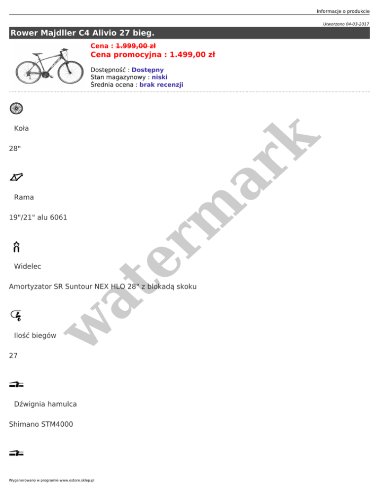 Informacje o produkcie Utworzono 04-03-2017 Rower Majdller C4 Alivio 27 bieg. Cena : 1.999,00 zł Cena promocyjna : 1.499,00 zł Dostępność : Dostępny Stan magazynowy : niski Średnia ocena : brak recenzji 28" Rama 19"/21" alu 6061 Widelec er m ar k Koła w at Amortyzator SR Suntour NEX HLO 28" z blokadą skoku Ilość biegów 27 Dźwignia hamulca Shimano STM4000 Wygenerowano w programie www.estore.sklep.pl Dźwignia zmiany biegów przód Shimano STM4000; 3biegi Dźwignia zmiany biegów tył Przerzutka przód Shimano M390 Przerzutka tył Korba at Shimano T4000 Alivio er m ar k Shimano STM4000; 9biegów w Shimano M311; 48x38x28 Suport Neco Łańcuch Shimano HG-53 Informacje o produkcie Hamulec przód V-brake alu Promax V-brake alu Promax Opony Kenda z białym paskiem Obręcze er m ar k Hamulec tył w at Alu dwukomorowe oczkowane Piasta przód Shimano TX800 Piasta tył Shimano TX800 Wygenerowano w programie www.estore.sklep.pl Wolnobieg / Kaseta Shimano HG3009 Kierownica Wspornik kierownicy Zoom alu Ahead Stery at Neco Wspornik siodła w Zoom alu Siodełko Selle Royal Shadow Gel Pedały Mtb er m ar k Mtb Informacje o produkcie Chwyty Ergonomiczne er m ar k Lampa przód x Lampa tył x Błotniki w at x Wyposażenie dodatkowe x Waga 14 kg Wygenerowano w programie www.estore.sklep.pl