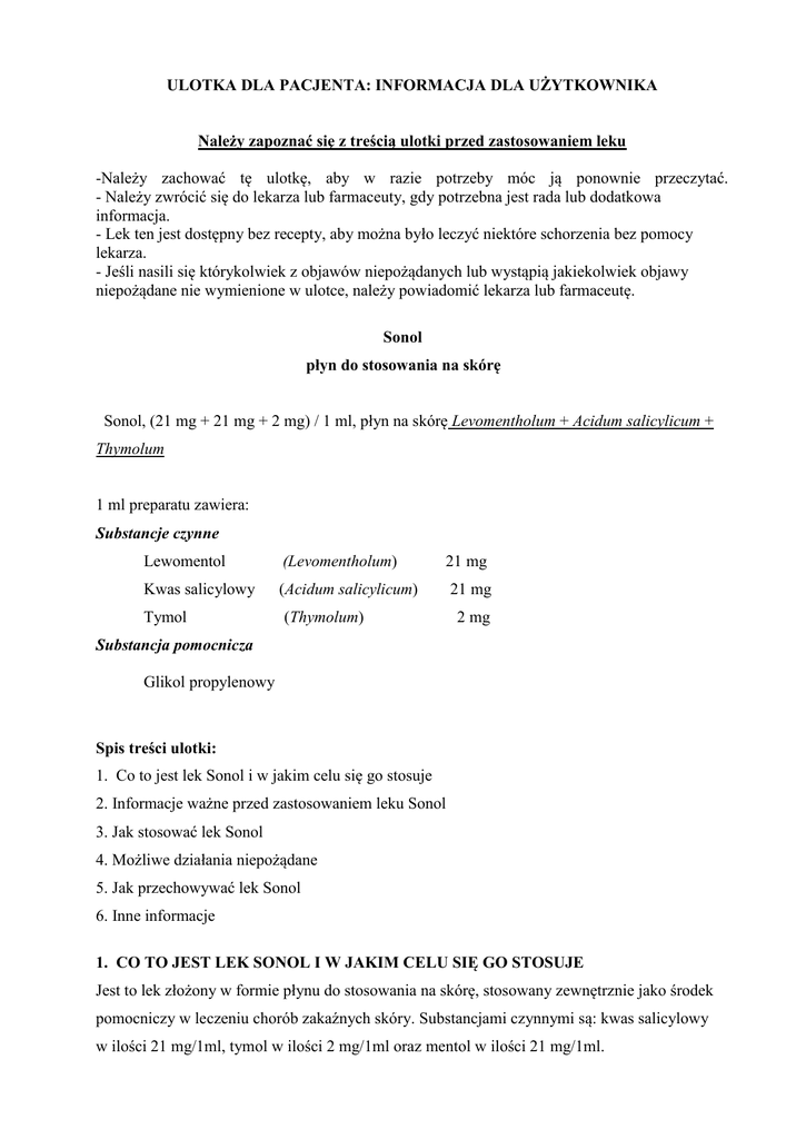 ULOTKA DLA PACJENTA: INFORMACJA DLA UŻYTKOWNIKA Należy zapoznać się z treścią ulotki przed zastosowaniem leku -Należy zachować tę ulotkę, aby w razie potrzeby móc ją ponownie przeczytać. - Należy zwrócić się do lekarza lub farmaceuty, gdy potrzebna jest rada lub dodatkowa informacja. - Lek ten jest dostępny bez recepty, aby można było leczyć niektóre schorzenia bez pomocy lekarza. - Jeśli nasili się którykolwiek z objawów niepożądanych lub wystąpią jakiekolwiek objawy niepożądane nie wymienione w ulotce, należy powiadomić lekarza lub farmaceutę. Sonol płyn do stosowania na skórę Sonol, (21 mg + 21 mg + 2 mg) / 1 ml, płyn na skórę Levomentholum + Acidum salicylicum + Thymolum 1 ml preparatu zawiera: Substancje czynne Lewomentol (Levomentholum) 21 mg Kwas salicylowy (Acidum salicylicum) 21 mg Tymol (Thymolum) 2 mg Substancja pomocnicza Glikol propylenowy Spis treści ulotki: 1. Co to jest lek Sonol i w jakim celu się go stosuje 2. Informacje ważne przed zastosowaniem leku Sonol 3. Jak stosować lek Sonol 4. Możliwe działania niepożądane 5. Jak przechowywać lek Sonol 6. Inne informacje 1. CO TO JEST LEK SONOL I W JAKIM CELU SIĘ GO STOSUJE Jest to lek złożony w formie płynu do stosowania na skórę, stosowany zewnętrznie jako środek pomocniczy w leczeniu chorób zakaźnych skóry. Substancjami czynnymi są: kwas salicylowy w ilości 21 mg/1ml, tymol w ilości 2 mg/1ml oraz mentol w ilości 21 mg/1ml. 2. INFORMACJE WAŻNE PRZED ZASTOSOWANIEM LEKU SONOL Kiedy nie stosować leku Sonol Nie zaleca się stosowania produktu na otwarte rany, błony śluzowe i skórę uszkodzoną, przy nadwrażliwości na składniki preparatu. Nie wolno stosować u noworodków i dzieci do 12 lat życia. Nie stosować w przypadku rozległych zmian złuszczających (np. w łuszczycy). Kiedy zachować szczególną ostrożność stosując lek Sonol W przypadku wystąpienia nadwrażliwości na którykolwiek ze składników produktu (utrzymujące się zaczerwienienie skóry) należy przerwać stosowanie preparatu i skonsultować się z lekarzem. Stosowanie leku Sonol z innymi lekami Nie stosować z innymi preparatami zawierającymi składniki złuszczające np. rezorcynę, siarkę ponieważ może nastąpić podrażnienie skóry. Ciąża i karmienie piersią Produktu Sonol nie wolno stosować w okresie ciąży i karmienia, bez konsultacji z lekarzem. Prowadzenie pojazdów i obsługa maszyn Lek nie ogranicza zdolności prowadzenia pojazdów i obsługiwania urządzeń mechanicznych w ruchu. Ważne informacje o niektórych składnikach leku Sonol Ponieważ kwas salicylowy bardzo łatwo wchłania się w przez skórę nie powinien być stosowany na dużych obszarach skóry przez długi czas, szczególnie u dzieci. 3. JAK STOSOWAĆ LEK SONOL Dorośli i dzieci powyżej 12 roku życia Zewnętrznie Miejsca swędzące i wykwity na wargach smarować cienko i równomiernie początkowo 4-5 razy na dobę, gdy nastąpi poprawa 2-3 razy na dobę. Zastosowanie większej niż zalecana dawki leku Sonol Nie występuje. Pominięcie zastosowania leku Sonol: Nie należy stosować dawki podwójnej w celu uzupełnienia pominiętej dawki. W razie wątpliwości związanych ze stosowaniem leku należy zwrócić się do lekarza lub farmaceuty. 4. MOŻLIWE DZIAŁANIA NIEPOŻĄDANE Jak każdy lek, Sonol może powodować działania niepożądane, chociaż nie u każdego one wystąpią. Podrażnienie skóry. Jeśli nasili się którykolwiek z objawów niepożądanych lub wystąpią jakiekolwiek objawy niepożądane nie wymienione w ulotce, należy powiadomić lekarza lub farmaceutę. 5. JAK PRZECHOWYWAĆ LEK SONOL Przechowywać w pomieszczeniach suchych, w temperaturze poniżej 25 C, chronić od światła. Przechowywać w miejscu niedostępnym i niewidocznym dla dzieci. Nie stosować leku Sonol po upływie terminu ważności zamieszczonego na etykiecie lub kartoniku. Termin ważności oznacza ostatni dzień danego miesiąca. Leków nie należy wyrzucać do kanalizacji lub domowych pojemników na odpadki. Należy zapytać farmaceutę co zrobić z lekami, których się już nie potrzebuje. Takie postępowanie pomoże chronić środowisko. 6. INNE INFORMACJE Co zawiera lek Sonol Substancjami czynnymi leku są mentol, kwas salicylowy, tymol (21 mg + 21 mg + 2 mg)/ 1 ml Substancją pomocniczą leku jest: glikol propylenowy. Jak wygląda lek Sonol i co zawiera opakowanie Lek jest w postaci płynu, umieszczony jest w butelce (HDPE) zakończonej zamknięciem typu rollon i zakrętką (PP) oraz obejmą z kulką (LDPE,PP). Sonol jest dostępny w opakowaniu zawierającym 8 g preparatu. Podmiot odpowiedzialny i wytwórca Elanda Zakład Produkcji Środków Farmaceutycznych B. Kazub, A. Orłowski Sp. J 97-340 Rozprza ul. Sportowa 9 TEL:(0-44) 6158253(4) FAX: (0-44) 6158253(4) E-MAIL: [email protected] Data zatwierdzenia ulotki { MM/RRRR }