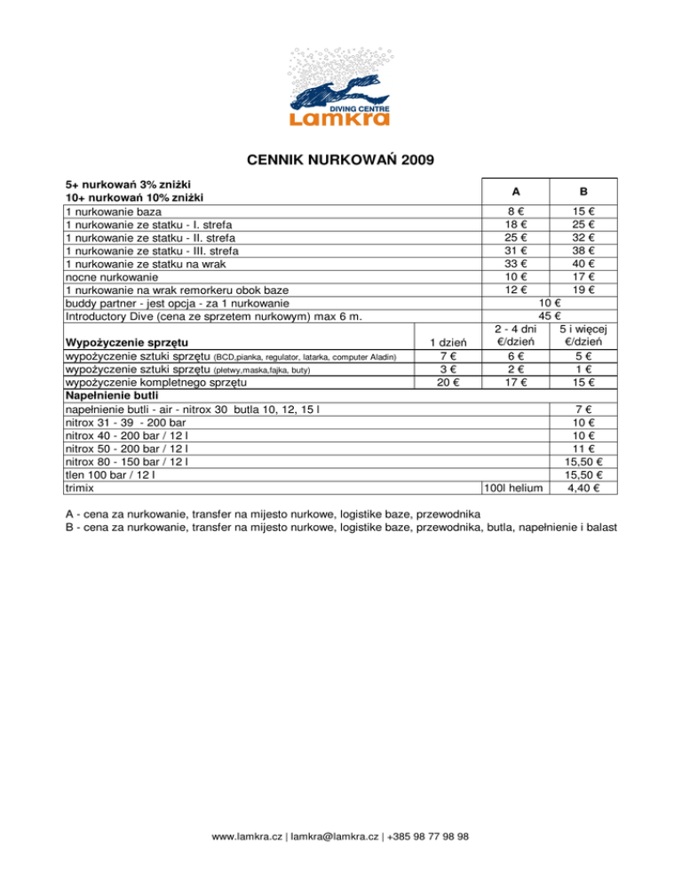 CENNIK NURKOWAŃ 2009 5+ nurkowań 3% zniżki 10+ nurkowań 10% zniżki 1 nurkowanie baza 1 nurkowanie ze statku - I. strefa 1 nurkowanie ze statku - II. strefa 1 nurkowanie ze statku - III. strefa 1 nurkowanie ze statku na wrak nocne nurkowanie 1 nurkowanie na wrak remorkeru obok baze buddy partner - jest opcja - za 1 nurkowanie Introductory Dive (cena ze sprzetem nurkowym) max 6 m. Wypożyczenie sprzętu wypożyczenie sztuki sprzętu (BCD,pianka, regulator, latarka, computer Aladin) wypożyczenie sztuki sprzętu (płetwy,maska,fajka, buty) wypożyczenie kompletnego sprzętu Napełnienie butli napełnienie butli - air - nitrox 30 butla 10, 12, 15 l nitrox 31 - 39 - 200 bar nitrox 40 - 200 bar / 12 l nitrox 50 - 200 bar / 12 l nitrox 80 - 150 bar / 12 l tlen 100 bar / 12 l trimix 1 dzień 7€ 3€ 20 € A B 8€ 18 € 25 € 31 € 33 € 10 € 12 € 15 € 25 € 32 € 38 € 40 € 17 € 19 € 10 € 45 € 2 - 4 dni 5 i więcej €/dzień €/dzień 6€ 5€ 2€ 1€ 17 € 15 € 100l helium 7€ 10 € 10 € 11 € 15,50 € 15,50 € 4,40 € A - cena za nurkowanie, transfer na mijesto nurkowe, logistike baze, przewodnika B - cena za nurkowanie, transfer na mijesto nurkowe, logistike baze, przewodnika, butla, napełnienie i balast www.lamkra.cz | [email protected] | +385 98 77 98 98