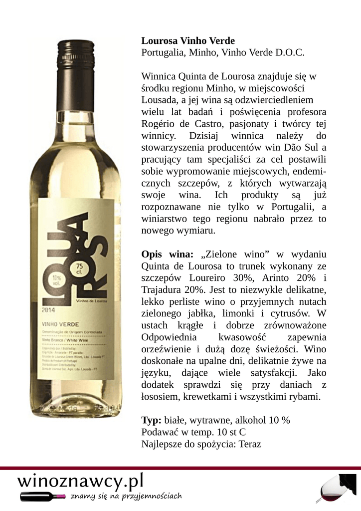 Lourosa Vinho Verde Portugalia, Minho, Vinho Verde D.O.C. Winnica Quinta de Lourosa znajduje się w środku regionu Minho, w miejscowości Lousada, a jej wina są odzwierciedleniem wielu lat badań i poświęcenia profesora Rogério de Castro, pasjonaty i twórcy tej winnicy. Dzisiaj winnica należy do stowarzyszenia producentów win Dão Sul a pracujący tam specjaliści za cel postawili sobie wypromowanie miejscowych, endemicznych szczepów, z których wytwarzają swoje wina. Ich produkty są już rozpoznawane nie tylko w Portugalii, a winiarstwo tego regionu nabrało przez to nowego wymiaru. Opis wina: „Zielone wino” w wydaniu Quinta de Lourosa to trunek wykonany ze szczepów Loureiro 30%, Arinto 20% i Trajadura 20%. Jest to niezwykle delikatne, lekko perliste wino o przyjemnych nutach zielonego jabłka, limonki i cytrusów. W ustach krągłe i dobrze zrównoważone Odpowiednia kwasowość zapewnia orzeźwienie i dużą dozę świeżości. Wino doskonałe na upalne dni, delikatnie żywe na języku, dające wiele satysfakcji. Jako dodatek sprawdzi się przy daniach z łososiem, krewetkami i wszystkimi rybami. Typ: białe, wytrawne, alkohol 10 % Podawać w temp. 10 st C Najlepsze do spożycia: Teraz