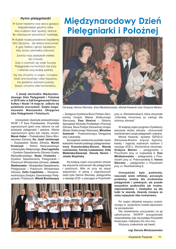 Hymn pielęgniarski W świat niesiemy swe serca gorące Najpiękniejsze głosimy idee Aby ludziom dać spokój i słońce By cierpiącym przywrócić nadzieję. Międzynarodowy Dzień Pielęgniarki i Położnej W służbie naszej przodować będziemy Dla Ojczyzny - Jej dobra pracować A gdy trzeba i ginąć będziemy Aby życie człowieka ratować. Zawód nasz przeszedł wielkie dni chwały Gdy o wolność się walki toczyły Pielęgniarki na frontach też były I ofiarnie swą służbę pełniły. My nie chcemy ni wojen, ni bojów Dość krwi bratniej i ofiar faszyzmu My jesteśmy siostrami pokoju Służyć chcemy idei humanizmu. Z okazji obchodów Międzynarodowego Dnia Pielęgniarki i Położnej w 2010 roku w Sali Kongresowej Pałacu Kultury i Nauki 14 maja br. odbyła się podniosła uroczystość. Święto zorganizowała Warszawska Okręgowa Izba Pielęgniarek i Położnych. Uroczystość otworzyła przewodnicząca WOIP i P Ewa Przesławska. Przywitała zaproszonych gości oraz obecne na sali koleżanki pielęgniarki i położne. Wśród zaproszonych gości byli między innymi: Marek Haber – Podsekretarz Stanu Ministerstwa Zdrowia, Ks. Józef Jachimczyk – Duszpasterz Służby Zdrowia, Marek Krawczyk – Rektor Warszawskiego Uniwersytetu Medycznego, Ewa Łagońska – Dyrektor Departamentu Zdrowia Urzędu Marszałkowskiego, Beata Cholewka – Dyrektor Departamentu Pielęgniarek i Położnych Ministerstwa Zdrowia, Jolanta Skolimowska – Wicedyrektor Departamentu Pielęgniarek i Położnych Ministerstwa Zdrowia, Zofia Czaplińska – Wiceprzewodnicząca Związku Zawodowego Pielęgniarek i Położnych, Witold Bromboszcz Od lewej: Hanna Sikorska, Ewa Młodzianowska, Michał Kawecki oraz Grażyna Marton. – Zastępca Dyrektora Biura Polityki Zdrowotnej Urzędu Miasta Stołecznego Warszawy, Ewa Skwirut – Główny Specjalista Wydziału Profilaktyki i Promocji Zdrowia Biura Polityki Zdrowotnej Urzędu Miasta Stołecznego Warszawy, Mirosław Szatanek – Przewodniczący Okręgowej Izby Lekarskiej. Szczególnie serdecznie powitała nasze koleżanki nestorki polskiego pielęgniarstwa: Irenę Kossobudzką-Starzec, Wandę Leśniewską, Kamilę Łukaszewicz, Zofię Madeńską-Szewczyk, Danutę Nemec i Józefę Słupińską. Na kolejną część uroczystości złożyło się wręczenie odznaczeń dla pielęgniarek i położnych. Miło mi przy tej okazji wspomnieć, iż jedną z nagrodzonych osób była Hanna Sikorska, pielęgniarka z naszego ZOZ- u pracująca w Przychodni przy ul. Rembielinskiej 8, która otrzymała „Odznakę honorową za zasługi dla ochrony zdrowia”. W kolejnej części programu Dyrektorzy placówek służby zdrowia uhonorowali wyróżnieniami swoje pielęgniarki i położne. Michał Kawecki, dyrektor SZPZLO Warszawa-Bródno wręczył dyplomy, kwiaty i nagrody wybranym osobom z naszego ZOZ-u. Wyróżnienia otrzymały: Grażyna Marton – pielęgniarka z Przychodni przy ul. Łojewskiej 6, Ewa Młodzianowska – pielęgniarka z Przychodni przy ul. Poborzanskiej 6, Hanna Sikorska – pielęgniarka z Przychodni przy ul. Rembielinskiej 8. Uroczystość była podniosła, nasunęła wiele refleksji, poruszyła problemy istotne dla środowiska pielęgniarek i położnych, ale przede wszystkim podkreśliła jak trudne, odpowiedzialne i niezbędne są dla ludzi te zawody. Zawody niosące ze sobą najwyższe idee humanizmu. Po części oficjalnej wszyscy uczestniczący w wydarzeniu zostali zaproszeni na poczęstunek. Dla uświetnienia uroczystości na jej zakończenie, WOIPiP przygotowała niespodziankę; były nią występy Krzysztofa Krawczyka i kabaretu Ani mru mru. Wszyscy znakomicie się bawili. mgr Danuta Mioduszewska Kwartalnik Pacjenta 11