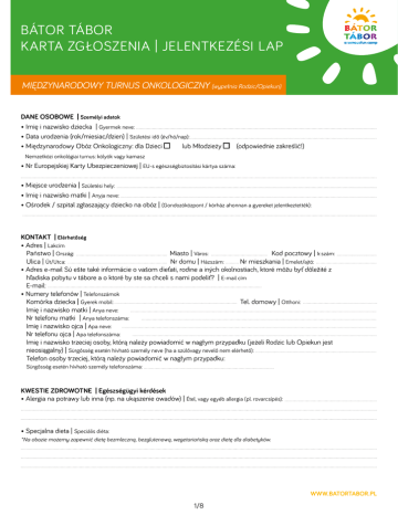 BÁTOR TÁBOR KARTA ZGŁOSZENIA | JELENTKEZÉSI LAP MIĘDZYNARODOWY TURNUS ONKOLOGICZNY (wypełnia Rodzic/Opiekun) DANE OSOBOWE | Személyi adatok • Imię i nazwisko dziecka | Gyermek neve: • Data urodzenia (rok/miesiac/dzien) | Születési idő (év/hó/nap): • Międzynarodowy Obóz Onkologiczny: dla Dzieci lub Młodzieży (odpowiednie zakreślić!) Nemzetközi onkológiai turnus: kölyök vagy kamasz • Nr Europejskiej Karty Ubezpieczeniowej | EU-s egészségbiztosítási kártya száma: • Miejsce urodzenia | Születési hely: • Imię i nazwisko matki | Anyja neve: • Ośrodek / szpital zgłaszający dziecko na obóz | (Gondozóközpont / kórház ahonnan a gyereket jelentkeztették): KONTAKT | Elérhetőség • Adres | Lakcím Państwo | Ország: Miasto | Város: Kod pocztowy | Ir.szám: Ulica | Út/Utca: Nr domu | Házszám: Nr mieszkania | Emelet/ajtó: • Adres e-mail Sú ešte také informácie o vašom dieťati, rodine a iných okolnostiach, ktoré môžu byť dôležité z hľadiska pobytu v tábore a o ktoré by ste sa chceli s nami podeliť? | E-mail cím E-mail: • Numery telefonów | Telefonszámok Komórka dziecka | Gyerek mobil: Tel. domowy | Otthoni: Imię i nazwisko matki | Anya neve: Nr telefonu matki | Anya telefonszáma: Imię i nazwisko ojca | Apa neve: Nr telefonu ojca | Apa telefonszáma: Imię i nazwisko trzeciej osoby, którą należy powiadomić w nagłym przypadku (jeżeli Rodzic lub Opiekun jest nieosiągalny) | Sürgősség esetén hívható személy neve (ha a szülővagy nevelő nem elérhető): Telefon osoby trzeciej, którą należy powiadomić w nagłym przypadku: Sürgősség esetén hívható személy telefonszáma: KWESTIE ZDROWOTNE | Egészségügyi kérdések • Alergia na potrawy lub inna (np. na ukąszenie owadów) | Étel, vagy egyéb allergia (pl. rovarcsípés): • Specjalna dieta | Speciális diéta: *Na obozie możemy zapewnić dietę bezmleczną, bezglutenową, wegetariańską oraz dietę dla diabetyków. WWW.BATORTABOR.PL 1/8 BÁTOR TÁBOR KARTA ZGŁOSZENIA | JELENTKEZÉSI LAP MIĘDZYNARODOWY TURNUS ONKOLOGICZNY (wypełnia Rodzic/Opiekun) • Alergia na lekarstwa Tak / Nie (jeżeli tak, to na jakie lekarstwa?) Van-e a gyermeknek gyógyszerallergiája? Igen / Nem Ha igen, mely gyógyszerekre? • Stale przyjmowane lekarstwa (również preparaty odżywcze itp.): Állandó gyógyszerek (táplálék kiegészítők is) Nazwa lekarstwa | Gyógyszer neve UWAGA!!! Prosimy o bezwzględne przywiezienie przez dziecko wszystkich wyszczególnionych wyżej lekartw i przekazanie ich po przyjeździe na obóz osobie z personelu medycznego! Czy dziecko przebyło choroby zakaźne wieku rozwojowego? (proszę zaznaczyć przebyte): Milyen gyermekkori fertőző betegségeket esett át korábban gyermeke? (jelölje be) • świnka | mumpsz • odra | kanyaró • różyczka | rózsahimlő • ospa | bárányhimlő • inne | egyéb: Czy dziecko zrealizowało szczepienia zgodnie z zalecanym kalendarzem szczepień? Megkapta-e gyermeke a kötelező védőoltásokat? TAK / NIE IGEN/NEM Proszę podać datę ostatniego szczepienia przeciwko: | Mikor kapta gyermeke az utolsó védőoltást az alábbiak közül: MMR (przeciwko odrze/śwince/różyczce) | (kanyaró, mumpsz, rózsahimlő) DTP (przeciwko błonicy/tężcowi/krztuścowi) | (diphteria, tetanusz, szamárköhögés) DT (diphteria, tetanusz) Czy zostały podane dodatkowe szczepionki? (proszę o wymienienie nazw i dat szczepienia) Milyen egyéb védőoltásokat kapott gyermeke? (sorolja föl) WWW.BATORTABOR.PL 2/8 BÁTOR TÁBOR KARTA ZGŁOSZENIA | JELENTKEZÉSI LAP MIĘDZYNARODOWY TURNUS ONKOLOGICZNY (wypełnia Rodzic/Opiekun) Czy Pani / Pana dziecko wymaga pomocy w nastepujących czynnościach? (1. mycie zębów / ubieranie / kąpiel; 2. spożywanie posiłków; 4. WC) Czy Pani / Pana dziecko używa regularnie jakichkolwiek urządzeń specjalistycznych (wózek inwalidzki, chodzik rehabilitacyjny, gorset, lifter, urządzenia wspomagające poruszanie, etc.) Czy zdarzyło się, że dziecko korzystało z pomocy psychologa lub psychiatry? (proszę podkreślić odpowiednie) • Tak, lekarz przepisał dziecku wyrób psychiatryczny. Przyczyna oraz typ leku: • Tak, podczas leczenia w szpitalu dzieckiem opiekował się psycholog. Przyczyna: • Tak, chodzi na indywidulaną/rodzinną terapię. Przyczyna: • Nie było jeszcze takiego przypadku • Inne: Czy wystąpiła ostatnio jakaś istotna zmiana w życiu rodziny? Proszę podkreślić w poniższej liście: • rozwód • przeprowadzka • zmiana szkoły/przedszkola • Poważna choroba bliskiej osoby/ważnej dla dziecka osoby • Śmierć bliskiej osoby/ważnej dla dziecka osoby • Przyjście na świat rodzeństwa/wprowadzenie się do rodziny nowego członka rodziny (np. partnera) • Dłuższy pobyt w szpitalu/izolacja od codziennego otoczenia • Nie miała miejsca ostatnio żadna istotna zmiana w życiu rodziny • Jeśli tak, to proszę opisać w kilku słowach! Czy jest jakaś ważna informacja o dziecku, która jest istotna w związku z obozem, którą chcieliby się Państwo z nami podzielić? Jak dziecko się zachowuje w otoczeniu innych dzieci? Jakie ma podejście do dorosłych i zasad? Jak możemy pomóc, żeby się uspokoiło, jak coś je zdenerwuje? Uwaga!!! Jeżeli w ciągu miesiąca przed rozpoczęciem obozu dziecko kontaktowało się z dzieckiem chorym na ospę wietrzną, prosimy bezwzględnie poinformować o tym łącznika Bátor Tábor w szpitalu jeszcze przed rozpoczęciem obozu! Data | Dátum, Podpis | Aláírás Prosimy o jak najszybsze wypelnienie i przekazanie niniejszego druku łącznikowi Bátor Tábor w szpitalu. (Imię i nazwisko oraz kontakt do Państwa łącznika podane są w załączonym liście do Rodziców) WWW.BATORTABOR.PL 3/8 UMOWA Z RODZICAMI UWAGA! PROSIMY O DOSTARCZENIE NINIEJSZEGO DOKUMENTU PO WYPEŁNIENIU I PODPISANIU DO NASZEGO ŁĄCZNIKA WSZPITALU (Imię i nazwisko łącznika oraz kontakt z nim podane są w liś