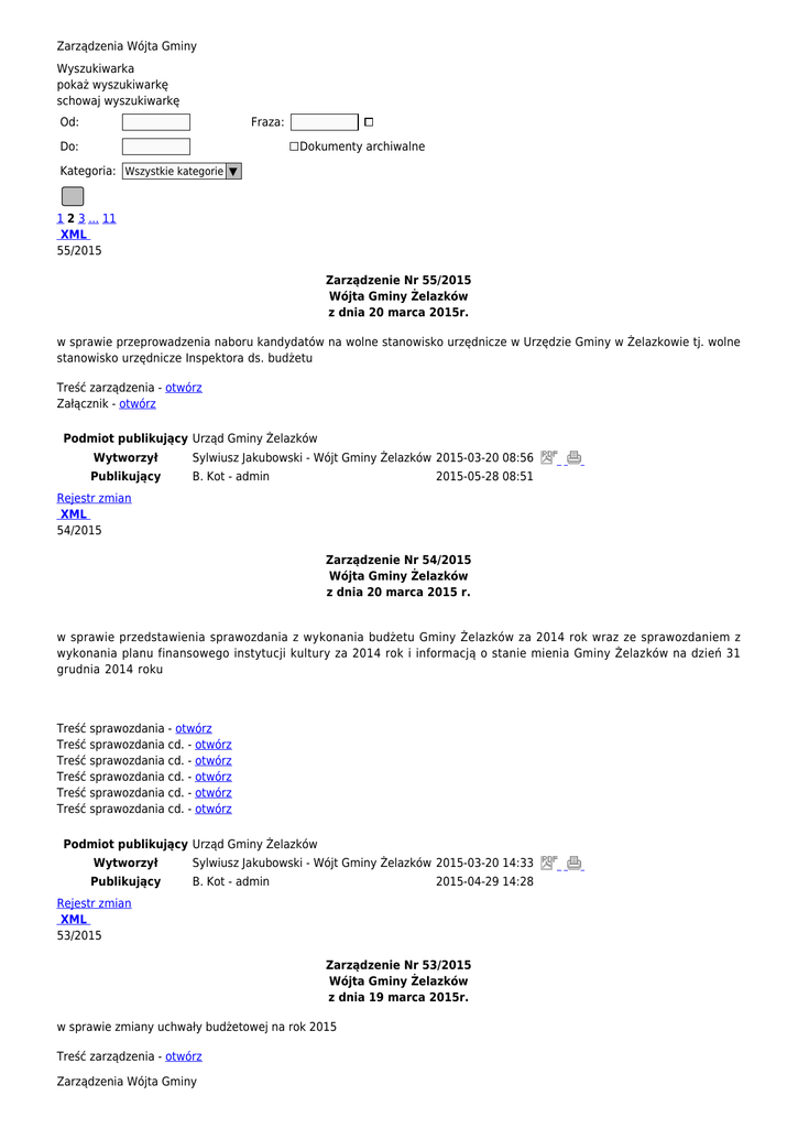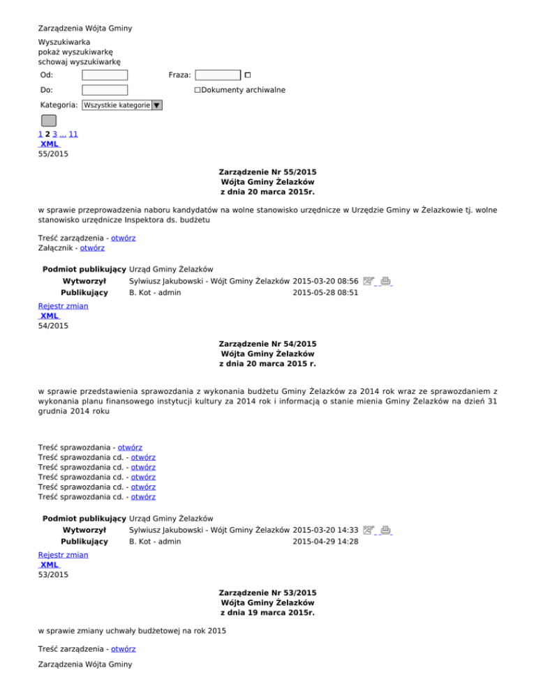 Zarządzenia Wójta Gminy Wyszukiwarka pokaż wyszukiwarkę schowaj wyszukiwarkę Od: Fraza: Do: Dokumenty archiwalne Kategoria: Wszystkie kategorie ▼ 1 2 3 ... 11 XML 55/2015 Zarządzenie Nr 55/2015 Wójta Gminy Żelazków z dnia 20 marca 2015r. w sprawie przeprowadzenia naboru kandydatów na wolne stanowisko urzędnicze w Urzędzie Gminy w Żelazkowie tj. wolne stanowisko urzędnicze Inspektora ds. budżetu Treść zarządzenia - otwórz Załącznik - otwórz Podmiot publikujący Urząd Gminy Żelazków Wytworzył Sylwiusz Jakubowski - Wójt Gminy Żelazków 2015-03-20 08:56 Publikujący B. Kot - admin 2015-05-28 08:51 Rejestr zmian XML 54/2015 Zarządzenie Nr 54/2015 Wójta Gminy Żelazków z dnia 20 marca 2015 r. w sprawie przedstawienia sprawozdania z wykonania budżetu Gminy Żelazków za 2014 rok wraz ze sprawozdaniem z wykonania planu finansowego instytucji kultury za 2014 rok i informacją o stanie mienia Gminy Żelazków na dzień 31 grudnia 2014 roku Treść sprawozdania - otwórz Treść sprawozdania cd. - otwórz Treść sprawozdania cd. - otwórz Treść sprawozdania cd. - otwórz Treść sprawozdania cd. - otwórz Treść sprawozdania cd. - otwórz Podmiot publikujący Urząd Gminy Żelazków Wytworzył Sylwiusz Jakubowski - Wójt Gminy Żelazków 2015-03-20 14:33 Publikujący B. Kot - admin 2015-04-29 14:28 Rejestr zmian XML 53/2015 Zarządzenie Nr 53/2015 Wójta Gminy Żelazków z dnia 19 marca 2015r. w sprawie zmiany uchwały budżetowej na rok 2015 Treść zarządzenia - otwórz Zarządzenia Wójta Gminy Zarządzenia Wójta Gminy Podmiot publikujący Urząd Gminy Żelazków Wytworzył Sylwiusz Jakubowski - Wójt Gminy Żelazków 2015-03-19 00:00 Publikujący B. Kot - admin 2015-04-29 14:20 Modyfikacja B. Kot - admin 2015-04-29 14:29 Rejestr zmian XML 52/2015 Zarządzenie Nr 52/2015 Wójta Gminy Żelazków z dnia 16 marca 2015r. w sprawie rozstrzygnięcia konkursu i udzielenia dotacji na realizację zadania publicznego w 2015 roku Treść zarządzenia - otwórz Podmiot publikujący Urząd Gminy Żelazków Wytworzył Sylwiusz Jakubowski - Wójt Gminy Żelazków 2015-03-16 12:41 Publikujący B. Kot - admin 2015-04-14 12:37 Rejestr zmian XML 51/2015 Zarządzenie Nr 51/2015 Wójta Gminy Żelazków z dnia 16 marca 2015r. w sprawie tabeli przydziału środków ochrony indywidualnej i odzieży roboczej oraz przydziału środków higieny osobistej dla pracowników Urzędu Gminy Żelazków. Treść zarządzenia - otwórz Podmiot publikujący Urząd Gminy Żelazków Wytworzył Sylwiusz Jakubowski - Wójt Gminy Żelazków 2015-03-16 12:39 Publikujący B. Kot - admin 2015-04-14 12:35 Rejestr zmian XML 50/2015 Zarządzenie Nr 50/2015 Wójta Gminy Żelazków z dnia 16 marca 2015r. w sprawie sprostowania oczywistej pomyłki w wydanym Zarządzeniu nr 14/2015 z dnia 30 stycznia 2015r. odwołującego z dniem 30.01.2015r. Kierownika Gminnego Ośrodka Pomocy Społecznej w Żelazkowie Treść zarządzenia - otwórz Podmiot publikujący Urząd Gminy Żelazków Wytworzył Sylwiusz Jakubowski - Wójt Gminy Żelazków 2015-03-16 12:29 Publikujący B. Kot - admin 2015-04-14 12:25 Rejestr zmian XML 49/2015 Zarządzenie Nr 49/2015 Wójta Gminy Żelazków z dnia 12 marca 2015r. w sprawie przeprowadzenia naboru kandydatów na wolne stanowisko urzędnicze w Urzędzie Gminy w Żelazkowie tj. wolne Zarządzenia Wójta Gminy Zarządzenia Wójta Gminy stanowisko urzędznicze ds. strategii, rozwoju, promocji, ochrony zabytrów i pozyskiwania środków unijnych Treść zarządzenia - otwórz Podmiot publikujący Urząd Gminy Żelazków Wytworzył Sylwiusz Jakubowski - Wójt Gminy Żelazków 2015-03-12 12:25 Publikujący B. Kot - admin 2015-04-14 12:21 Rejestr zmian XML 48/2015 Zarządzenie Nr 48/2015 Wójta Gminy Żelazków z dnia 10 marca 2015r. w sprawie powołania Komisji Przetargowej i jej składu osobowego Treść zarządzenia - otwórz Podmiot publikujący Urząd Gminy Żelazków Wytworzył Sylwiusz Jakubowski - Wójt Gminy Żelazków 2015-03-10 12:21 Publikujący B. Kot - admin 2015-04-14 12:17 Rejestr zmian XML 47/2015 Zarządzenie Nr 47/2015 Wójta Gminy Żelazków z dnia 10 marca 2015r. w sprawie powołania Komisji Przetargowej i jej składu osobowego Treść zarządzenia - otwórz Podmiot publikujący Urząd Gminy Żelazków Wytworzył Sylwiusz Jakubowski - Wójt Gminy Żelazków 2015-03-10 12:20 Publikujący B. Kot - admin 2015-04-14 12:15 Rejestr zmian XML 46/2015 Zarządzenie Nr 46/2015 Wójta Gminy Żelazków z dnia 10 marca 2015r. w sprawie upoważnienia Pani Anety Maciak - pełniącej obowiązki Kierownika Gminnego Ośrodka Pomocy Społecznej w Żelazkowie do przyznania Karty Dużej Rodziny oraz do wydawania decyzji administracyjnych w przypadku odmowy wydania Karty Dużej Rodziny lub stwierdzenia utraty uprawnień do korzystania z rządowego programu dla rodzin wielodzietnych Treść zarządzenia - otwórz Podmiot publikujący Urząd Gminy Żelazków Wytworzył Sylwiusz Jakubowski - Wójt Gminy Żelazków 2015-03-10 12:18 Publikujący B. Kot - admin 2015-04-14 12:13 Rejestr zmian XML 45/2015 Zarządzenie Nr 45/2015 Wójta Gminy Żelazków Zarządzenia Wójta Gminy Zarządzenia Wójta Gminy z dnia 10 marca 2015r. w sprawie upoważnienia Pani Anety Maciak - pełniącej obowiązki Kierownika Gminnego Ośrodka Pomocy Społecznej w Żelazkowie do załatwiania spraw i wydawania decyzji administracyjnych dotyczących potwierdzania prawa do świadczeń opieki zdrowotnej finansowanych ze środków publicznych Treść zarządzenia - otwórz Podmiot publikujący Urząd Gminy Żelazków Wytworzył Sylwiusz Jakubowski - Wójt Gminy Żelazków 2015-03-10 12:13 Publikujący B. Kot - admin 2015-04-14 12:09 Rejestr zmian XML 44/2015 Zarządzenie Nr 44/2015 Wójta Gminy Żelazków z dnia 10 marca 2015r. w sprawie upoważnienia Pani Anety Maciak - pełniącej obowiązki Kierownika Gminnego Ośrodka Pomocy Społecznej w Żelazkowie do wydawania decyzji administracyjnych w zakresie przyznawania dodatków mi