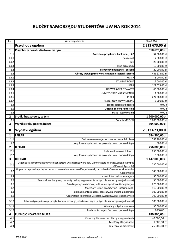 BUDŻET SAMORZĄDU STUDENTÓW UW NA ROK 2014