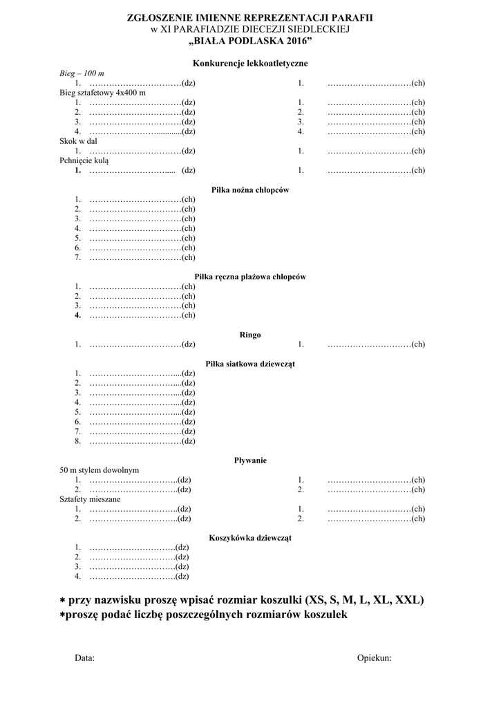 ZGŁOSZENIE IMIENNE REPREZENTACJI PARAFII w XI PARAFIADZIE DIECEZJI SIEDLECKIEJ „BIAŁA PODLASKA 2016” Konkurencje lekkoatletyczne Bieg – 100 m 1. ……………………………(dz) Bieg sztafetowy 4x400 m 1. ……………………………(dz) 2. ……………………………(dz) 3. ……………………………(dz) 4. ……………………............(dz) Skok w dal 1. ……………………………(dz) Pchnięcie kulą 1. ………………………..... (dz) 1. …………………………(ch) 1. 2. 3. 4. …………………………(ch) …………………………(ch) …………………………(ch) …………………………(ch) 1. …………………………(ch) 1. …………………………(ch) Piłka nożna chłopców 1. 2. 3. 4. 5. 6. 7. ……………………………(ch) ……………………………(ch) ……………………………(ch) ……………………………(ch) ……………………………(ch) ……………………………(ch) ……………………………(ch) 1. 2. 3. 4. Piłka ręczna plażowa chłopców ……………………………(ch) ……………………………(ch) ……………………………(ch) ……………………………(ch) Ringo 1. ……………………………(dz) 1. …………………………(ch) 1. 2. …………………………(ch) …………………………(ch) 1. 2. …………………………(ch) …………………………(ch) Piłka siatkowa dziewcząt 1. 2. 3. 4. 5. 6. 7. 8. …………………………....(dz) …………………………....(dz) …………………………....(dz) …………………………....(dz) …………………………....(dz) ……………………………(dz) ……………………………(dz) ……………………………(dz) Pływanie 50 m stylem dowolnym 1. …………………………..(dz) 2. …………………………..(dz) Sztafety mieszane 1. …………………………..(dz) 2. …………………………..(dz) Koszykówka dziewcząt 1. 2. 3. 4. ………………………….(dz) ………………………….(dz) ………………………….(dz) ………………………….(dz) przy nazwisku proszę wpisać rozmiar koszulki (XS, S, M, L, XL, XXL) proszę podać liczbę poszczególnych rozmiarów koszulek Data: Opiekun: