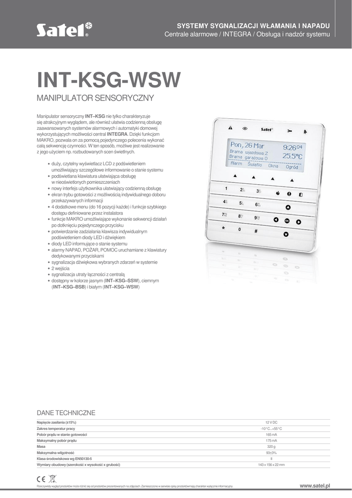 SYSTEMY SYGNALIZACJI WŁAMANIA I NAPADU Centrale alarmowe / INTEGRA / Obsługa i nadzór systemu INT-KSG-WSW MANIPULATOR SENSORYCZNY Manipulator sensoryczny INT–KSG nie tylko charakteryzuje się atrakcyjnym wyglądem, ale również ułatwia codzienną obsługę zaawansowanych systemów alarmowych i automatyki domowej wykorzystujących możliwości central INTEGRA. Dzięki funkcjom MAKRO, pozwala on za pomocą pojedynczego polecenia wykonać całą sekwencję czynności. W ten sposób, możliwe jest realizowanie z jego użyciem np. rozbudowanych scen świetlnych. duży, czytelny wyświetlacz LCD z podświetleniem umożliwiający szczegółowe informowanie o stanie systemu podświetlana klawiatura ułatwiająca obsługę w nieoświetlonych pomieszczeniach nowy interfejs użytkownika ułatwiający codzienną obsługę ekran trybu gotowości z możliwością indywidualnego doboru przekazywanych informacji 4 dodatkowe menu (do 16 pozycji każde) i funkcje szybkiego dostępu definiowane przez instalatora funkcje MAKRO umożliwiające wykonanie sekwencji działań po dotknięciu pojedynczego przycisku potwierdzanie zadziałania klawisza indywidualnym podświetleniem diody LED i dźwiękiem diody LED informujące o stanie systemu alarmy NAPAD, POŻAR, POMOC uruchamiane z klawiatury dedykowanymi przyciskami sygnalizacja dźwiękowa wybranych zdarzeń w systemie 2 wejścia sygnalizacja utraty łączności z centralą dostępny w kolorze jasnym (INT–KSG–SSW), ciemnym (INT–KSG–BSB) i białym (INT–KSG–WSW) DANE TECHNICZNE Napięcie zasilania (±15%) 12 V DC Zakres temperatur pracy -10°C…+55°C Pobór prądu w stanie gotowości 165 mA Maksymalny pobór prądu 175 mA Masa Maksymalna wilgotność Klasa środowiskowa wg EN50130-5 Wymiary obudowy (szerokość x wysokość x grubość) Rzeczywisty wygląd produktów może różnić się od produktów prezentowanych na zdjęciach. Zamieszczone w serwisie opisy produktówmają charakter wyłącznie informacyjny. 320 g 93±3% II 143 x 156 x 22 mm www.satel.pl