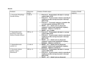 Duczki: Działanie: 1. Utworzenie Wiejskiego Ośrodka Kultury. Planowane koszty: 2 mln zł. 2. Zagospodarowanie przestrzeni wokół tego obiektu (Ośrodka Kultury) 200 tys. zł 3. Zagospodarowanie centrum wsi 1,2 mln zł. 4. Stworzenie miejsca spotkań i imprez kulturalnych. 400 tys. zł. Fundusze (Środki unijne) • Priorytet 5 – Wzmacnianie roli miast w rozwoju regionu (RPO WM) • Priorytet 6 – Wykorzystanie walorów naturalnych i kulturowych dla rozwoju turystyki i rekreacji (RPO WM) • Priorytet 7 – Tworzenie i poprawa warunków dla rozwoju kapitału ludzkiego (RPO WM) • PROW – oś 3 – Jakość życia na obszarach wiejskich i różnicowanie gospodarki wiejskiej – Działanie – Odnowa i rozwój wsi • PROW – oś 4 - Leader • Priorytet 5 – Wzmacnianie roli miast w rozwoju regionu (RPO WM) • Priorytet 6 – Wykorzystanie walorów naturalnych i kulturowych dla rozwoju turystyki i rekreacji (RPO WM) • PROW – oś 3 – Jakość życia na obszarach wiejskich i różnicowanie gospodarki wiejskiej – Działanie – Odnowa i rozwój wsi • PROW – oś 3 – Jakość życia na obszarach wiejskich i różnicowanie gospodarki wiejskiej – Działanie – Odnowa i rozwój wsi • Priorytet 5 – Wzmacnianie roli miast w rozwoju regionu (RPO WM) • Priorytet 6 – Wykorzystanie walorów naturalnych i kulturowych dla rozwoju turystyki i rekreacji (RPO WM) • PROW – oś 3 – Jakość życia na obszarach Fundusze (Środki krajowe) • 5. Uruchomienie przedszkola wiejskiego 2,5 mln zł. • • • 6. Utworzenie pomieszczenia 120 tys. zł. do zajęć ruchowych dla dzieci w ramach funkcjonującego przedszkola. • • • • • 7. Utworzenie deptaku od Kościoła do ulicy Szkolnej wraz z oświetleniem i zaprojektowaną małą architekturą urbanistyczna i zielenią. 500 tys. zł. • • • wiejskich i różnicowanie gospodarki wiejskiej – Działanie – Odnowa i rozwój wsi PROW – oś 4 - Leader Priorytet 5 – Wzmacnianie roli miast w rozwoju regionu (RPO WM) Priorytet 6 – Wykorzystanie walorów naturalnych i kulturowych dla rozwoju turystyki i rekreacji (RPO WM) PROW – oś 3 – Jakość życia na obszarach wiejskich i różnicowanie gospodarki wiejskiej – Działanie – Odnowa i rozwój wsi PROW – oś 4 - Leader Priorytet 5 – Wzmacnianie roli miast w rozwoju regionu (RPO WM) Priorytet 6 – Wykorzystanie walorów naturalnych i kulturowych dla rozwoju turystyki i rekreacji (RPO WM) Priorytet 7 – Tworzenie i poprawa warunków dla rozwoju kapitału ludzkiego (RPO WM) PROW – oś 3 – Jakość życia na obszarach wiejskich i różnicowanie gospodarki wiejskiej – Działanie – Odnowa i rozwój wsi Priorytet 5 – Wzmacnianie roli miast w rozwoju regionu (RPO WM) Priorytet 6 – Wykorzystanie walorów naturalnych i kulturowych dla rozwoju turystyki i rekreacji (RPO WM) PROW – oś 3 – Jakość życia na obszarach wiejskich i różnicowanie gospodarki wiejskiej – Działanie – Odnowa i rozwój wsi 7. Budowa placu zabaw dla dzieci. 50 tys. zł. • • • 8. Utwardzenie dróg na ulicach bocznych oraz doprowadzenie pozostałych dróg do właściwego stanu po remontach związanych z kanalizacją. 4 mln zł. 9. Budowa ciągów komunikacyjnych dla pieszych (chodniki). 3,5 mln zł. • • • • • • 10. Budowa oświetlenia ulicznego w miejscach nieoświetlonych. 1,2 mln zł. • • • Priorytet 5 – Wzmacnianie roli miast w rozwoju regionu (RPO WM) Priorytet 6 – Wykorzystanie walorów naturalnych i kulturowych dla rozwoju turystyki i rekreacji (RPO WM) PROW – oś 3 – Jakość życia na obszarach wiejskich i różnicowanie gospodarki wiejskiej – Działanie – Odnowa i rozwój wsi Priorytet 3 – Regionalny system transportowy (RPO WM) Priorytet 5 – Wzmacnianie roli miast w rozwoju regionu (RPO WM) PROW – oś 3 – Jakość życia na obszarach wiejskich i różnicowanie gospodarki wiejskiej – Działanie – Odnowa i rozwój wsi Priorytet 3 – Regionalny system transportowy (RPO WM) Priorytet 5 – Wzmacnianie roli miast w rozwoju regionu (RPO WM) PROW – oś 3 – Jakość życia na obszarach wiejskich i różnicowanie gospodarki wiejskiej – Działanie – Odnowa i rozwój wsi Priorytet 3 – Regionalny system transportowy (RPO WM) Priorytet 5 – Wzmacnianie roli miast w rozwoju regionu (RPO WM) PROW – oś 3 – Jakość życia na obszarach wiejskich i różnicowanie gospodarki wiejskiej – Działanie – Odnowa i rozwój wsi 11.Budowa przystanku i zatoczki autobusowej przy szkole i przy skrzyżowaniu ul. Willowej i Szosy Jadowskiej. 70 tys. zł. 12.Budowa ogólnodostępnego parkingu i miejsca na rowery przy stacji PKP. 200 tys. zł. 13. Regularne udrażnianie istniejących rowów melioracyjnych i wykonanie nowych tam, gdzie ukształtowanie terenu tego wymaga. 300 tys. zł. 14. Budowa sygnalizacji świetlnej przy zespole szkół oraz na skrzyżowaniu ulicy Willowej z Szosą Jadowską 250 tys. zł. 15. Modernizacja infrastruktury kolejowej polegająca na budowie 800 tys. zł. • Priorytet 3 – Regionalny system transportowy (RPO WM) • Priorytet 5 – Wzmacnianie roli miast w rozwoju regionu (RPO WM) • PROW – oś 3 – Jakość życia na obszarach wiejskich i różnicowanie gospodarki wiejskiej – Działanie – Odnowa i rozwój wsi • Priorytet 3 – Regionalny system transportowy (RPO WM) • Priorytet 5 – Wzmacnianie roli miast w rozwoju regionu (RPO WM) • PROW – oś 3 – Jakość życia na obszarach wiejskich i różnicowanie gospodarki wiejskiej – Działanie – Odnowa i rozwój wsi • Priorytet 4 – Inwestycje w ochronę środowiska (RPO WM) • PROW – oś 3 – Jakość życia na obszarach wiejskich i różnicowanie gospodarki wiejskiej – Działanie – Podstawowe usługi dla gospodarki i ludności wiejskiej • Priorytet 3 – Regionalny system transportowy (RPO WM) • Priorytet 5 – Wzmacnianie roli miast w rozwoju regionu (RPO WM) • PROW – oś 3 – Jakość życia na obszara
