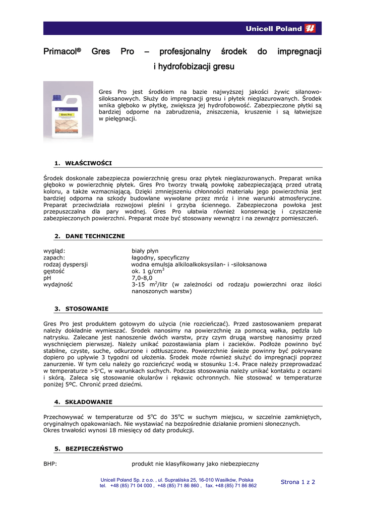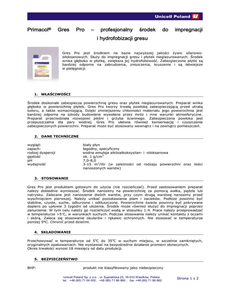 Primacol® Gres Pro – profesjonalny środek do impregnacji i hydrofobizacji gresu Gres Pro jest środkiem na bazie najwyższej jakości żywic silanowosiloksanowych. Służy do impregnacji gresu i płytek nieglazurowanych. Środek wnika głęboko w płytkę, zwiększa jej hydrofobowość. Zabezpieczone płytki są bardziej odporne na zabrudzenia, zniszczenia, kruszenie i są łatwiejsze w pielęgnacji. 1. WŁAŚCIWOŚCI Środek doskonale zabezpiecza powierzchnię gresu oraz płytek nieglazurowanych. Preparat wnika głęboko w powierzchnię płytek. Gres Pro tworzy trwałą powłokę zabezpieczającą przed utratą koloru, a także wzmacniającą. Dzięki zmniejszeniu chłonności materiału jego powierzchnia jest bardziej odporna na szkody budowlane wywołane przez mróz i inne warunki atmosferyczne. Preparat przeciwdziała rozwojowi pleśni i grzyba ściennego. Zabezpieczona powłoka jest przepuszczalna dla pary wodnej. Gres Pro ułatwia również konserwację i czyszczenie zabezpieczonych powierzchni. Preparat może być stosowany wewnątrz i na zewnątrz pomieszczeń. 2. DANE TECHNICZNE wygląd: zapach: rodzaj dyspersji gęstość pH wydajność biały płyn łagodny, specyficzny wodna emulsja alkiloalkoksysilan- i -siloksanowa ok. 1 g/cm3 7,0-8,0 3-15 m2/litr (w zależności od rodzaju powierzchni oraz ilości nanoszonych warstw) 3. STOSOWANIE Gres Pro jest produktem gotowym do użycia (nie rozcieńczać). Przed zastosowaniem preparat należy dokładnie wymieszać. Środek nanosimy na powierzchnię za pomocą wałka, pędzla lub natrysku. Zalecane jest nanoszenie dwóch warstw, przy czym drugą warstwę nanosimy przed wyschnięciem pierwszej. Należy unikać pozostawiania plam i zacieków. Podłoże powinno być stabilne, czyste, suche, odkurzone i odtłuszczone. Powierzchnie świeże powinny być pokrywane dopiero po upływie 3 tygodni od ułożenia. Środek może również służyć do impregnacji poprzez zanurzenie. W tym celu należy go rozcieńczyć wodą w stosunku 1:4. Prace należy przeprowadzać w temperaturze >5C, w warunkach suchych. Podczas stosowania należy unikać kontaktu z oczami i skórą. Zaleca się stosowanie okularów i rękawic ochronnych. Nie stosować w temperaturze poniżej 5ºC. Chronić przed dziećmi. 4. SKŁADOWANIE Przechowywać w temperaturze od 5oC do 35oC w suchym miejscu, w szczelnie zamkniętych, oryginalnych opakowaniach. Nie wystawiać na bezpośrednie działanie promieni słonecznych. Okres trwałości wynosi 18 miesięcy od daty produkcji. 5. BEZPIECZEŃSTWO BHP: produkt nie klasyfikowany jako niebezpieczny Unicell Poland Sp. z o.o. , ul. Supraślska 25, 16-010 Wasilków, Polska tel. +48 (85) 71 04 000 , +48 (85) 71 86 860 , fax. +48 (85) 71 86 862 Strona 1 z 2 pożarowe: środowiskowe: produkt wodny – niepalny nie klasyfikowany jako niebezpieczny 6. PIERWSZA POMOC Kontakt ze skórą: Kontakt z okiem: Połknięcie: umyć skórę dużą ilością wody z mydłem natychmiast przemyć dużą ilością ciepłej wody wypić dużą ilość wody małymi porcjami, wypłukać gardło skontaktować się z lekarzem 7. INFORMACJA PRAWNA Wszystkie informacje i dane zawarte tutaj są podane w dobrej wierze i w zgodzie z posiadaną przez nasze laboratoria wiedzą. Muszą jednak być przyjęte jako oznaczenia bez gwarancji, jeżeli produkt znajduje się poza naszą kontrolą. Informacja techniczna nie jest świadectwem jakości produktu ani też ofertą. Producent nie odpowiada za niewłaściwe użycie informacji zawartych na tej karcie, ani też za konsekwencje z tego wynikające. W przypadku wątpliwości zawsze należy przeprowadzić próbę. Producent zastrzega sobie prawo do zmiany powyższych danych bez powiadamiania klienta. 8. INNE INFORMACJE Po więcej informacji dotyczących produktu, prosimy o kontakt pod numerem 085 7104 000 oraz zapraszamy na naszą stronę internetową www.unicell.pl. Autor Data Luiza Szwed 15.07.2008 Unicell Poland Sp. z o.o. , ul. Supraślska 25, 16-010 Wasilków, Polska tel. +48 (85) 71 04 000 , +48 (85) 71 86 860 , fax. +48 (85) 71 86 862 Strona 2 z 2