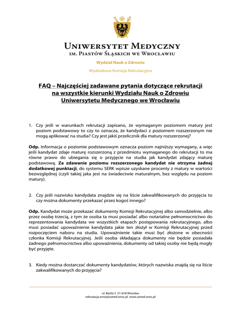 Wydział Nauk o Zdrowiu Wydziałowa Komisja Rekrutacyjna FAQ – Najczęściej zadawane pytania dotyczące rekrutacji na wszystkie kierunki Wydziału Nauk o Zdrowiu Uniwersytetu Medycznego we Wrocławiu 1. Czy jeśli w warunkach rekrutacji zapisano, że wymaganym poziomem matury jest poziom podstawowy to czy to oznacza, że kandydaci z poziomem rozszerzonym nie mogą aplikować na studia? Czy jest jakiś przelicznik dla matury rozszerzonej? Odp. Informacja o poziomie podstawowym oznacza poziom najniższy wymagany, a więc jeśli kandydat zdaje maturę rozszerzoną z przedmiotu wymaganego do rekrutacji to ma równe prawo do ubiegania się o przyjęcie na studia jak kandydat zdający maturę podstawową. Za zdawanie poziomu rozszerzonego kandydat nie otrzyma żadnej dodatkowej punktacji, do systemu SERK wpisze uzyskane procenty z matury w wartości bezwzględnej (czyli takiej jaka jest na świadectwie maturalnym, bez względu na poziom matury). 2. Czy jeśli nazwisko kandydata znajdzie się na liście zakwalifikowanych do przyjęcia to czy można dokumenty przekazać przez kogoś innego? Odp. Kandydat może przekazać dokumenty Komisji Rekrutacyjnej albo samodzielnie, albo przez osobę trzecią, z tym że osoba ta musi posiadać albo notarialne pełnomocnictwo do reprezentowania kandydata we wszystkich etapach postępowania rekrutacyjnego, albo musi posiadać upoważnienie kandydata jakie ten złożył w Komisji Rekrutacyjnej przed rozpoczęciem naboru na studia. Upoważnienie takie musi być złożone w obecności członka Komisji Rekrutacyjnej. Jeśli osoba składająca dokumenty nie będzie posiadała żadnego pełnomocnictwa albo upoważnienia, dokumenty od takiej osoby nie będą mogły być przyjęte. 3. Kiedy można dostarczać dokumenty kandydatów, których nazwiska znajdą się na liście zakwalifikowanych do przyjęcia? ul. Bartla 5 51-618 Wrocław [email protected] www.umed.wroc.pl Odp. Dokumenty można składać WYŁĄCZNIE w dni, które zostaną podane w terminarzu rekrutacji. Na przyjmowanie dokumentów od kandydatów przewiduje się tylko dwa dni na każdą listę, wobec tego jeśli kandydat mieszka poza Wrocławiem powinien przewidzieć możliwość, że znajdzie się na liście zakwalifikowanych, by we wskazanym terminie złożyć dokumenty. Jeśli nie zrobi tego w oznaczonym czasie, zostanie skreślony z listy zakwalifikowanych i na jego miejsce będą wpisane kolejne osoby oczekujące poniżej na liście. 4. Jakie są opłaty na studia niestacjonarne, obowiązujące w roku akademickim 2013/2014? Odp. Opłaty za studia niestacjonarne w każdym roku są ogłaszane zarządzeniem Rektora UMW, które jest wydawane przed rozpoczęciem rekrutacji. Spodziewamy się, że w tym roku zostanie wydane około maja 2013r. 5. Czy opłatę za studia niestacjonarne można płacić na Uniwersytecie Medycznym w ratach miesięcznych? Odp. Niestety nie ma takiej możliwości. Kandydat na studia niestacjonarne łącznie z dokumentami wstępnymi musi dołączyć dowód wpłaty za cały pierwszy semestr, a potem kolejną ratę wpłacić za następny semestr. Nie ma możliwości dokonywania wpłat miesięcznie. 6. Czy można starać się o przyjęcie na studia II stopnia na kierunkach dietetyka, fizjoterapia, pielęgniarstwo, położnictwo po ukończeniu innego kierunku (np. po dietetyce starać się o przyjęcie na fizjoterapię albo po pielęgniarstwo na dietetykę)? Odp. Niestety nie ma takiej możliwości. Po ukończeniu studiów I stopnia można kontynuować kształcenie na studiach II stopnia tylko na tym samym kierunku. Wyjątek stanowi kierunek zdrowie publiczne, na który mogą aplikować na II stopień absolwenci studiów I stopnia: zdrowia publicznego, ratownictwa medycznego, pielęgniarstwa i położnictwa. 7. Czy aby studiować pielęgniarstwo na studiach I stopnia trzeba mieć wcześniej ukończoną szkołę średnią o profilu pielęgniarskim? Odp. Oczywiście nie, na studia I stopnia może aplikować absolwent dowolnej szkoły średniej, w której na maturze zdawał biologię. Jeśli kandydat posiada już uprawnienia do wykonywania zawodu pielęgniarki (położnej), ponieważ w poprzednich latach ukończył studium medyczne, liceum pielęgniarskie lub liceum medyczne, może starać się o przyjęcie na tzw. studia pomostowe, w czasie których uzupełnia tylko wykształcenie ogólne, a dotychczasową praktykę zawodową wlicza się do okresu studiów. W ten sposób studia pomostowe trwają krócej niż studia dzienne, jednak są to studia odpłatne, niestacjonarne.