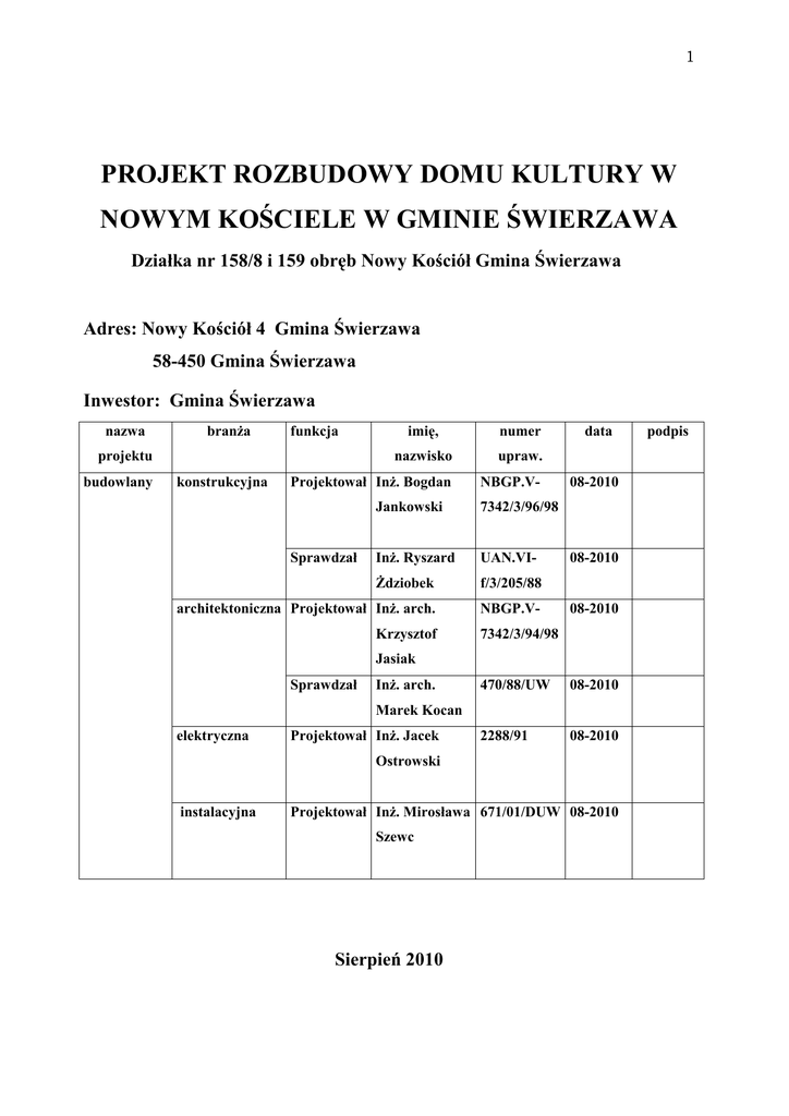 PROJEKT ROZBUDOWY DOMU KULTURY W NOWYM KOŚCIELE