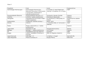 Klasa I f Przedmiot Technologia informacyjna Przysposobienie Obronne Chemia Geografia Matematyka Historia Fizyka Język Polski Biologia PP Religia Język Francuski Język Hiszpański Tytuł Technologia informacyjna. Elementy stylu pracy z informatyki i z komputerm. Kształcenie w zakresie podstawowym Przysposobienie obronne cz. 2 Chemia 1 zakres podstawowy Geografia fizyczna świata i Polski – zakres rozszerzony Podręcznik i zbiorek do klasy: 1 Historia 1 Fizyka i astronomia cz. 1 zakres podstawowy Przeszłość to dziś Biologia 1 – zakres podstawowy Przedsiębiorczość bez tajemnic Jestem świadkiem Chrystusa w Kościele Alter Ego 1 A1 Prisma Comenza A1 Autor E. Gurbiel, G. Hadt-Olejniczak, . Kołczyk, H. Krupicka, M. M. Sysyło Wydawnictwo WSiP Goniewicz, Nowak, Smutek Stanisława Hejwowska B. Lenartowicz, E Wilczyńska, M. Wójcik Braun, Lech J. Choińska-Mika, M. Tymowski, K. Zielińska Operon Operon Wydawnictwo szkolne PWN GWO WSiP Operon Krzysztof Mrowcewicz Jan Prokop Sopińska Red. Ks. Zbigniew Marek SJ Stentor Operon WSiP WAM A. Bertlut, C. Hugot Equipo Prisma Hechette Fle Edinumeu