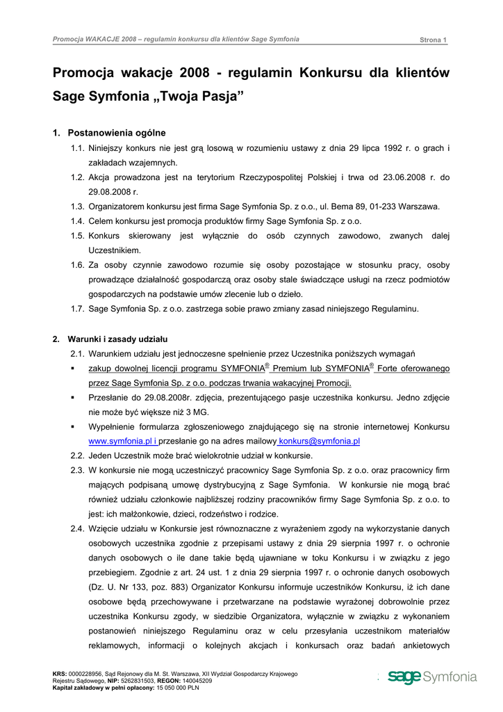 Promocja WAKACJE 2008 – regulamin konkursu dla klientów Sage Symfonia Strona 1 Promocja wakacje 2008 - regulamin Konkursu dla klientów Sage Symfonia „Twoja Pasja” 1. Postanowienia ogólne 1.1. Niniejszy konkurs nie jest grą losową w rozumieniu ustawy z dnia 29 lipca 1992 r. o grach i zakładach wzajemnych. 1.2. Akcja prowadzona jest na terytorium Rzeczypospolitej Polskiej i trwa od 23.06.2008 r. do 29.08.2008 r. 1.3. Organizatorem konkursu jest firma Sage Symfonia Sp. z o.o., ul. Bema 89, 01-233 Warszawa. 1.4. Celem konkursu jest promocja produktów firmy Sage Symfonia Sp. z o.o. 1.5. Konkurs skierowany jest wyłącznie do osób czynnych zawodowo, zwanych dalej Uczestnikiem. 1.6. Za osoby czynnie zawodowo rozumie się osoby pozostające w stosunku pracy, osoby prowadzące działalność gospodarczą oraz osoby stale świadczące usługi na rzecz podmiotów gospodarczych na podstawie umów zlecenie lub o dzieło. 1.7. Sage Symfonia Sp. z o.o. zastrzega sobie prawo zmiany zasad niniejszego Regulaminu. 2. Warunki i zasady udziału 2.1. Warunkiem udziału jest jednoczesne spełnienie przez Uczestnika poniższych wymagań zakup dowolnej licencji programu SYMFONIA® Premium lub SYMFONIA® Forte oferowanego przez Sage Symfonia Sp. z o.o. podczas trwania wakacyjnej Promocji. Przesłanie do 29.08.2008r. zdjęcia, prezentującego pasje uczestnika konkursu. Jedno zdjęcie nie może być większe niż 3 MG. Wypełnienie formularza zgłoszeniowego znajdującego się na stronie internetowej Konkursu www.symfonia.pl i przesłanie go na adres mailowy [email protected] 2.2. Jeden Uczestnik może brać wielokrotnie udział w konkursie. 2.3. W konkursie nie mogą uczestniczyć pracownicy Sage Symfonia Sp. z o.o. oraz pracownicy firm mających podpisaną umowę dystrybucyjną z Sage Symfonia. W konkursie nie mogą brać również udziału członkowie najbliższej rodziny pracowników firmy Sage Symfonia Sp. z o.o. to jest: ich małżonkowie, dzieci, rodzeństwo i rodzice. 2.4. Wzięcie udziału w Konkursie jest równoznaczne z wyrażeniem zgody na wykorzystanie danych osobowych uczestnika zgodnie z przepisami ustawy z dnia 29 sierpnia 1997 r. o ochronie danych osobowych o ile dane takie będą ujawniane w toku Konkursu i w związku z jego przebiegiem. Zgodnie z art. 24 ust. 1 z dnia 29 sierpnia 1997 r. o ochronie danych osobowych (Dz. U. Nr 133, poz. 883) Organizator Konkursu informuje uczestników Konkursu, iż ich dane osobowe będą przechowywane i przetwarzane na podstawie wyrażonej dobrowolnie przez uczestnika Konkursu zgody, w siedzibie Organizatora, wyłącznie w związku z wykonaniem postanowień niniejszego Regulaminu oraz w celu przesyłania uczestnikom materiałów reklamowych, informacji o kolejnych akcjach i konkursach oraz badań ankietowych KRS: 0000228956, Sąd Rejonowy dla M. St. Warszawa, XII Wydział Gospodarczy Krajowego Rejestru Sądowego, NIP: 5262831503, REGON: 140045209 Kapitał zakładowy w pełni opłacony: 15 050 000 PLN Promocja WAKACJE 2008 – regulamin konkursu dla klientów Sage Symfonia Strona 2 organizowanych przez Organizatora konkursu. Każdy z uczestników ma prawo do wglądu swoich danych oraz ich poprawianie. 2.5. Osoby zgłaszające udział w Konkursie wyrażają tym samym swoją zgodę na publikację ich nazwisk i / lub nazwy firmy na stronie internetowej www.symfonia.pl 2.6. Zgłoszenie się do konkursu jest jednoznaczne z akceptacją niniejszych zasad. 3. Nagrody 3.1 Nagrodą dla zwycięzcy konkursu będzie aparat cyfrowy. 3.2 Sage Symfonia zastrzega sobie prawo wyróżnienia więcej osób, niż tylko zwycięzcę. 3.3 Nagrodami dla wyróżnionych mogą być również aparaty cyfrowe lub inne niespodzianki. 4. Zasady przyznawania nagród 4.1 Komisja złożona z 5 przedstawicieli firmy Sage Symfonia wybierze najlepsze propozycje: najciekawsze, najdowcipniejsze, przy zachowaniu warunków określonych w pkt. 2 niniejszego Regulaminu. Następnie laureat będzie musiał odpowiedzieć na jedno pytanie związane z konkursem (kontakt telefoniczny) – poprawna odpowiedź warunkuje przyznanie nagrody. 4.2 Ogłoszenie zwycięzców nastąpi do 3 tygodni po zakończeniu konkursu. 4.3 Laureaci Konkursu zostaną powiadomieni o przyznanych im nagrodach pocztą elektroniczną na podany w formularzu zgłoszeniowym zwrotny adres e-mail. 4.4 Forma dostarczenia nagród zostanie uzgodniona indywidualnie z Laureatami. KRS: 0000228956, Sąd Rejonowy dla M. St. Warszawa, XII Wydział Gospodarczy Krajowego Rejestru Sądowego, NIP: 5262831503, REGON: 140045209 Kapitał zakładowy w pełni opłacony: 15 050 000 PLN