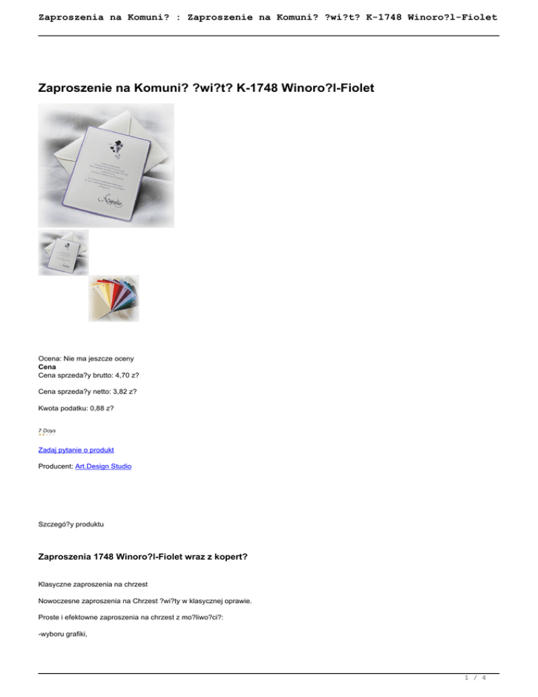 Zaproszenia na Komuni? : Zaproszenie na Komuni? ?wi?t? K-1748 Winoro?l-Fiolet Zaproszenie na Komuni? ?wi?t? K-1748 Winoro?l-Fiolet Ocena: Nie ma jeszcze oceny Cena Cena sprzeda?y brutto: 4,70 z? Cena sprzeda?y netto: 3,82 z? Kwota podatku: 0,88 z? Zadaj pytanie o produkt Producent: Art.Design Studio Szczegó?y produktu Zaproszenia 1748 Winoro?l-Fiolet wraz z kopert? Klasyczne zaproszenia na chrzest Nowoczesne zaproszenia na Chrzest ?wi?ty w klasycznej oprawie. Proste i efektowne zaproszenia na chrzest z mo?liwo?ci?: -wyboru grafiki, 1 / 4 Zaproszenia na Komuni? : Zaproszenie na Komuni? ?wi?t? K-1748 Winoro?l-Fiolet -wymiany koloru ok?adki/podk?adki Nowoczesne zaproszenia z eleganckimi kopertami r?cznie robionymi. Opis Produktu rozmiary: poddruk 135x185 mm ok?adka (podk?adka) 140x190 mm koperta 150x200 mm poddruk: bardzo wysokiej jako?ci papier g?adki, matowy w kolorze kremowym, zdobiony przez nas t?oczeniem w formie delikatnej cienkiej ramki, papier o grubo?ci 250 gram. podk?adka (ok?adka): bardzo wysokiej jako?ci papier g?adki opalizuj?cy w kolorze fioletowym, 300g Mo?liwo?? wyboru koloru (13 dost?pnych kolorów) koperta: bardzo wysokiej jako?ci apier delikatnie t?oczony, koperta r?cznie klejona z przet?oczon? ramk? w kolorze kremowym. 120 gram. Zaproszenie 1748_winoro?l_fiolet jest dopasowane graficznie do menu M1748, winietki W1748, pude?eczka PD01 Rabaty Ilo?ciowe Zaproszenia ?lubne (z nadrukiem): od 51 do 100 sztuk - 5% od 101 do 150 sztuk - 8% od 151 do 200 sztuk - 10% od 201 sztuk - do uzgodnienia Rabaty ilo?ciowe obejmuj? zamówienia z?o?one na jeden wzór i dotycz? z?o?onych zamówie? na zaproszenia ?lubne z nadrukiem, rabat odliczany jest od cen zaprosze? z nadrukiem. W przypadku zamówienia zaprosze? bez nadruku, rabat nie jest uwzgl?dniany. Rabaty obejmuj? wy??cznie artyku?y z grupy "Zaproszenia ?lubne". Nie dotycz? galerii: OKAZJE Rabaty nie obejmuj? dodatkowych opcji jak: Personalizacja, Wycinanie Laserowe, T?oczenie, Z?ocenie, Dodatkowy Nadruk, Nadruk i Personalizacja na kopertach. * Rabaty nie ??cz? si? z innymi promocjami i okazjami. Dodatkowe Opcje 2 / 4 Zaproszenia na Komuni? : Zaproszenie na Komuni? ?wi?t? K-1748 Winoro?l-Fiolet Nadruk dowolnej tre?ci w zaproszeniu: + 0,70 z?/szt. nadruk wykonywany jest na wierzchu prostok?tnego ozdobnego poddruku. Personalizacja nazwisk: + 0,70 z?/szt. mo?liwo?? wpisania nazwisk go?ci w tre?? zaproszenia, np: mamy zaszczyt zaprosi? "Sz.P. Jana Kowalskiego z osob? towarzysz?c?" itp. * Inne Opcje Dodatkowe Jak Zamawia? Z?ó? zamówienie mailem: [email protected], podaj?c wszelkie informacje potrzebne do zrealizowania zamówienia, takie jak: 1. Model Zaproszenia, 2. Ilo?? (ewentualny podzia?, np. wszystkich: 82 szt, w tym 40 szt. zaprosze? na ?lub i wesele, 20 szt. na sam ?lub i 20 szt. jako zawiadomienia, i 2 szt. dla rodziców) 3. Tre?? Zaprosze? (w pliku tekstowym: Word, Excel, Notatnik, w tre?ci wiadomo?ci mailowej), ewentualny podzia? na poszczególne tre?ci (?lub, ?lub i wesele, zawiadomienie, dla Rodziców itp.), 4. Je?li b?dziemy wykonywa? Personalizacj? (osobny plik z imionami i nazwiskami, wypnktowany. W tre?? zaproszenia: w dope?niaczu, je?li na koperty: w mianowniku) 5. Krój Czcionki z naszych propozycji, lub podaj nazw? czcionki. 6. Wybierz Kolor Nadruku, 7. Ewentualny Ozdobnik drukowany na stronach gdzie drukowana b?dzie tre??. 8. Form? zap?aty: Przelew (przedp?ata), Pobranie, P?atno?? gotówk? przy odbiorze osobistym u nas w biurze 9. Form? Wysy?ki: Poczta Polska, Kurier, Odbiór Osobisty Maksymalnie nast?pnego dnia wy?lemy do Ciebie tzw. Sk?ad do Akceptu w PDF, po akceptacji, przyst?pimy do druku i przygotujemy zamówienie do wysy?ki lub odbioru. Je?li masz dodatkowe wytyczne do swojego zamówienia, opisz je w mailu, pomo?e nam to przygotowa? sk?ad i unikn?? zb?dnych poprawek. Wybierz Nadruk Nadruk mo?e by? zupe?nie dowolny. Nadrukujemy ka?d? tre?? nades?an? przez Pa?stwa. Mo?na tak?e wybra? teksty z naszych propozycji. Pozosta?e Informacje 3 / 4 Zaproszenia na Komuni? : Zaproszenie na Komuni? ?wi?t? K-1748 Winoro?l-Fiolet Zamówienia realizujemy w czasie 5-7 dni od dnia z?o?enia zamówienia, Maksymalnie nast?pnego dnia wysy?amy Sk?ady do Akceptu (projekt) w PDF, dopiero po akceptacji przyst?pujemy do drukowania zamówienia, Gotowe zamówienie wysy?amy Kurierem UPS, Poczt? Polsk?, lub umawiamy si? na odbiór osobisty w naszym Biurze, Mo?esz zap?aci? przelewem, gotówk? przy odbiorze przesy?ki, lub gotówk? przy odbiorze osobistym w naszym biurze, Minimalna ilo?? to 10 szt w zamówieniu. Je?li masz dodatkowe pytania, prosimy o kontakt e-mail, lub telefonicznie: 22 403 95 48, 503 158 696 Gwarantujemy Najwy?sz? Jako?? Produktów oraz Us?ug. Zapraszamy do zakupów. Art.Design Studio 4 / 4 Powered by TCPDF (www.tcpdf.org)