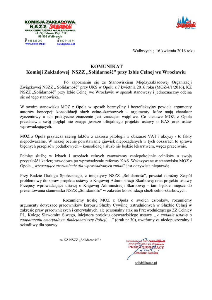 ul. Ogrodowa 15 p. 312 58-306 Wałbrzych 885 526 000 www.solid.org.pl 880 74 36 74 [email protected] Wałbrzych ; 16 kwietnia 2016 roku KOMUNIKAT Komisji Zakładowej NSZZ „Solidarność” przy Izbie Celnej we Wrocławiu Po zapoznaniu się ze Stanowiskiem Międzyzakładowej Organizacji Związkowej NSZZ „ Solidarność” przy UKS w Opolu z 7 kwietnia 2016 roku (MOZ/4/1/2016), KZ NSZZ „Solidarność” przy Izbie Celnej we Wrocławiu w sposób stanowczy i jednoznaczny odcina się od tego stanowiska. W swoim stanowisku MOZ z Opola w sposób bezmyślny i bezrefleksyjny powiela argumenty autorów koncepcji konsolidacji służb celno-skarbowych – argumenty, które mają charakter życzeniowy a ich praktyczne znaczenie jest znacząco wątpliwe. Co ciekawe MOZ z Opola przedstawia swój pogląd nie znając jeszcze oficjalnego projektu ustawy o KAS oraz ustaw wprowadzających. MOZ z Opola przytacza szereg faktów z zakresu patologii w obszarze VAT i akcyzy - to fakty niepodważalne. W naszej ocenie powstawanie zjawisk niepożądanych w tych obszarach to sprawa błędnych przepisów podatkowych – konsolidacja służb nie będzie lekarstwem, wręcz przeciwnie. Pełniąc służbę w izbach i urzędach celnych zauważamy zaniepokojenie celników o swoją przyszłość i karierę zawodową po wprowadzeniu reformy KAS. Wskazywane w stanowisku MOZ z Opola „ wzrastające zrozumienie dla wprowadzanych zmian” jest oczywistą nieprawdą. Przy Radzie Dialogu Społecznego, z inicjatywy NSZZ „Solidarność”, powstał doraźny Zespół problemowy do spraw projektu ustawy o Krajowej Administracji Skarbowej oraz projektu ustawy Przepisy wprowadzające ustawę o Krajowej Administracji Skarbowej – tam będzie miejsce do prezentowania stanowiska NSZZ „Solidarność” w zakresie konsolidacji służb celno-skarbowych. Rozumiemy troskę MOZ z Opola o swoich członków, rozumiemy argumenty dotyczące pracowników korpusu Służby Cywilnej zatrudnionych w Służbie Celnej w zakresie praw pracowniczych i emerytalnych, ale personalny atak na Przewodniczącego ZZ Celnicy PL, Kolegę Sławomira Siwego, inicjatora projektu obywatelskiego ustawy „ o zmianie ustawy o zaopatrzeniu emerytalnym funkcjonariuszy Policji,....” (druk nr 30), uważamy za niedopuszczalny i szkodliwy dla sprawy. za KZ NSZZ „Solidarność” : [email protected]