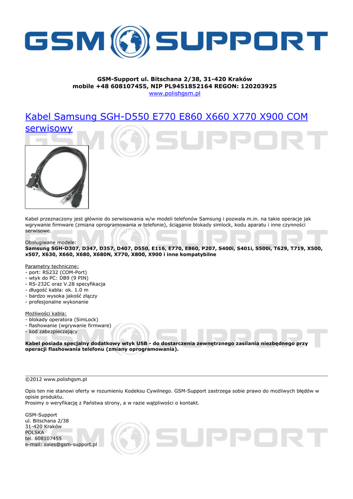 GSM-Support ul. Bitschana 2/38, 31-420 Kraków mobile +48 608107455, NIP PL9451852164 REGON: 120203925 www.polishgsm.pl Kabel Samsung SGH-D550 E770 E860 X660 X770 X900 COM serwisowy Kabel przeznaczony jest głównie do serwisowania w/w modeli telefonów Samsung i pozwala m.in. na takie operacje jak wgrywanie firmware (zmiana oprogramowania w telefonie), ściąganie blokady simlock, kodu aparatu i inne czynności serwisowe. Obsługiwane modele: Samsung SGH-D307, D347, D357, D407, D550, E116, E770, E860, P207, S400i, S401i, S500i, T629, T719, X500, x507, X630, X660, X680, X680N, X770, X800, X900 i inne kompatybilne Parametry techniczne: - port: RS232 (COM-Port) - wtyk do PC: DB9 (9 PIN) - RS-232C oraz V.28 specyfikacja - długość kabla: ok. 1.0 m - bardzo wysoka jakość złączy - profesjonalne wykonanie Możliwości kabla: - blokady operatora (SimLock) - flashowanie (wgrywanie firmware) - kod zabezpieczający Kabel posiada specjalny dodatkowy wtyk USB - do dostarczenia zewnętrznego zasilania niezbędnego przy operacji flashowania telefonu (zmiany oprogramowania). ©2012 www.polishgsm.pl Opis ten nie stanowi oferty w rozumieniu Kodeksu Cywilnego. GSM-Support zastrzega sobie prawo do możliwych błędów w opisie produktu. Prosimy o weryfikację z Państwa strony, a w razie wątpliwości o kontakt. GSM-Support ul. Bitschana 2/38 31-420 Kraków POLSKA tel. 608107455 e-mail: [email protected] Powered by TCPDF (www.tcpdf.org)