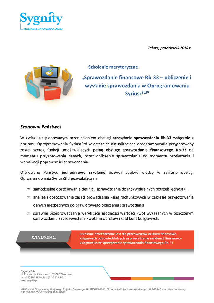 Zabrze, październik 2016 r. Szkolenie merytoryczne „Sprawozdanie finansowe Rb-33 – obliczenie i wysłanie sprawozdania w Oprogramowaniu SyriuszStd” Szanowni Państwo! W związku z planowanym przeniesieniem obsługi przesyłania sprawozdania Rb-33 wyłącznie z poziomu Oprogramowania SyriuszStd w ostatnich aktualizacjach oprogramowania przygotowany został szereg funkcji umożliwiających pełną obsługę sprawozdania finansowego Rb-33 od momentu przygotowania danych, przez obliczenie sprawozdania do momentu przekazania i weryfikacji poprawności sprawozdania. Oferowane Państwu jednodniowe szkolenie pozwoli zdobyć wiedzę w zakresie obsługi Oprogramowania SyriuszStd pozwalającą na: • samodzielne dostosowanie definicji sprawozdania do indywidualnych potrzeb jednostki, • analizę i dostosowanie zasad prowadzenia ksiąg rachunkowych w zakresie przygotowania danych niezbędnych do prawidłowego obliczenia sprawozdania, • sprawne przeprowadzanie weryfikacji zgodności wartości kwot wykazanych w obliczonym sprawozdaniu z rzeczywistymi kwotami obrotów i sald kont księgowych. KANDYDACI Szkolenie przeznaczone jest dla pracowników działów finansowoksięgowych odpowiedzialnych za prowadzenie ewidencji finansowoksięgowej oraz sporządzanie sprawozdania finansowego Rb-33 Sygnity S.A. ul. Franciszka Klimczaka 1, 02-797 Warszawa tel.: (22) 290 88 00, fax: (22) 290 88 01 www.sygnity.pl XIII Wydział Gospodarczy Krajowego Rejestru Sądowego, Nr KRS 0000008162. Wysokość kapitału zakładowego: 11 886 242 zł w całości wpłacony. NIP 586-000-52-93 REGON 190407926 TEMATYKA Szkolenie obejmuje: 1. Przygotowanie definicji sprawozdania finansowego Rb-33 do prawidłowego obliczania z uwzględnieniem założeń do prowadzenia ksiąg rachunkowych w dowolnym powiatowym urzędzie pracy. 2. Obliczenie sprawozdania i metody weryfikacji poprawności wartości w poszczególnych komórkach sprawozdania. 3. Mechanizm kontroli sprawozdania Rb-33. 4. Przekazanie sprawozdania do jednostek nadrzędnych oraz weryfikacja jego aktualnego statusu po wysłaniu przesyłu TEMATYKA TEMATYKA MIEJSCE, GRUPY Jednodniowe szkolenie ma charakter grupowy i prowadzone jest w formie wykładu interaktywnego z elementami warsztatów. W poniższej tabeli proponujemy Państwu miejsca i terminy szkoleń. Nr identyfikacyjny szkolenia R33/01/16 Termin Miejsce* 16.11.2016r. Gdańsk R33/02/16 17.11.2016r Bydgoszcz R33/03/16 18.11.2016r Poznań R33/04/16 15.11.2016r Olsztyn R33/05/16 16.11.2016r Białystok R33/06/16 17.11.2016r Warszawa R33/07/16 18.11.2016r Łódź R33/08/16 22.11.2016r Lublin R33/09/16 23.11.2016r Kielce R33/10/16 24.11.2016r Rzeszów R33/11/16 25.11.2016r Kraków R33/12/16 22.11.2016r Szczecin R33/13/16 23.11.2016r Zielona Góra R33/14/16 25.11.2016r Wrocław R33/15/16 29.11.2016r Katowice R33/16/16 30.11.2016r Opole * Dokładny adres miejsca szkolenia zostanie Państwu przesłany po zgłoszeniu na szkolenie. Sygnity S.A. ul. Franciszka Klimczaka 1, 02-797 Warszawa tel.: (22) 290 88 00, fax: (22) 290 88 01 www.sygnity.pl XIII Wydział Gospodarczy Krajowego Rejestru Sądowego, Nr KRS 0000008162. Wysokość kapitału zakładowego: 11 886 242 zł w całości wpłacony. NIP 586-000-52-93 REGON 190407926 TRENERZY Szkolenie prowadzi profesjonalna i wykwalifikowana kadra trenerska. Nasi trenerzy brali udział w masowym wdrożeniach PSZ.eDOK w Powiatowych Urzędach Pracy i Ośrodkach Pomocy Społecznej. Na co dzień zajmują się również realizowaniem wsparcia serwisowego aplikacji i usług dedykowanych dla Urzędów Pracy w Polsce. CENA Cena powyższego szkolenia wynosi 800,00 zł netto/brutto (szkolenia bez VAT) od osoby i obejmuje koszty wyżywienia, zajęć i pracy trenera. KONTAKT Pytania związane z częścią organizacyjną szkolenia należy kierować do: Bernadeta Filip, tel. 504-142-250, e-mail: [email protected]. W zakresie zagadnień merytorycznych na każde Państwa pytanie odpowie Marcin Sarna, tel. 508-021-138, e-mail: [email protected]. W sprawach handlowych proszę o kontakt z: Ewa Kwapisz, tel. 504-142-914, e-mail: [email protected]. Oferta ważna zgodnie z terminami poszczególnych szkoleń. Zgłoszenie uczestników powinno wpłynąć co najmniej 10 dni przed planowaną datą szkolenia. Z poważaniem Dyrektor Sprzedaży Sygnity S.A. Sygnity S.A. ul. Franciszka Klimczaka 1, 02-797 Warszawa tel.: (22) 290 88 00, fax: (22) 290 88 01 www.sygnity.pl XIII Wydział Gospodarczy Krajowego Rejestru Sądowego, Nr KRS 0000008162. Wysokość kapitału zakładowego: 11 886 242 zł w całości wpłacony. NIP 586-000-52-93 REGON 190407926