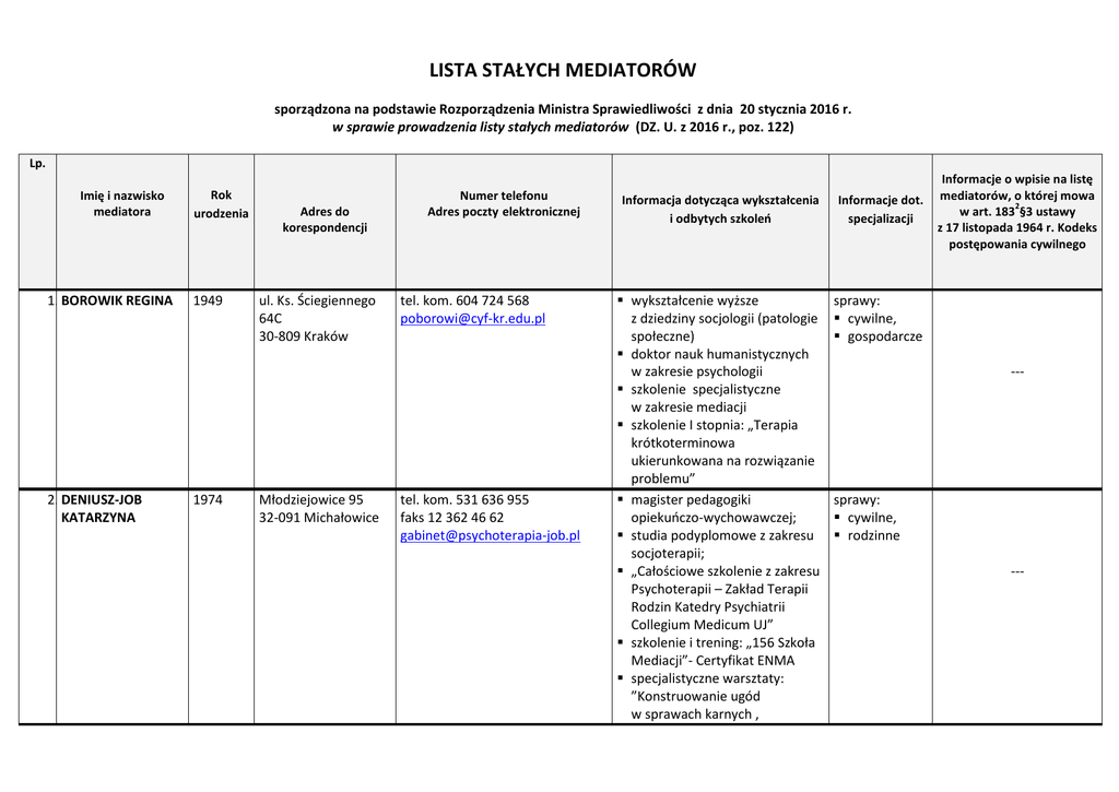 LISTA STAŁYCH MEDIATORÓW sporządzona na podstawie Rozporządzenia Ministra Sprawiedliwości z dnia 20 stycznia 2016 r. w sprawie prowadzenia listy stałych mediatorów (DZ. U. z 2016 r., poz. 122) Lp. Imię i nazwisko mediatora 1. BOROWIK REGINA 2. DENIUSZ-JOB KATARZYNA Rok urodzenia 1949 1974 Adres do korespondencji ul. Ks. Ściegiennego 64C 30-809 Kraków Młodziejowice 95 32-091 Michałowice Numer telefonu Adres poczty elektronicznej tel. kom. 604 724 568 [email protected] tel. kom. 531 636 955 faks 12 362 46 62 [email protected] Informacja dotycząca wykształcenia i odbytych szkoleń Informacje dot. specjalizacji wykształcenie wyższe z dziedziny socjologii (patologie społeczne) doktor nauk humanistycznych w zakresie psychologii szkolenie specjalistyczne w zakresie mediacji szkolenie I stopnia: „Terapia krótkoterminowa ukierunkowana na rozwiązanie problemu” magister pedagogiki opiekuńczo-wychowawczej; studia podyplomowe z zakresu socjoterapii; „Całościowe szkolenie z zakresu Psychoterapii – Zakład Terapii Rodzin Katedry Psychiatrii Collegium Medicum UJ” szkolenie i trening: „156 Szkoła Mediacji”- Certyfikat ENMA specjalistyczne warsztaty: ”Konstruowanie ugód w sprawach karnych , sprawy: cywilne, gospodarcze Informacje o wpisie na listę mediatorów, o której mowa 2 w art. 183 §3 ustawy z 17 listopada 1964 r. Kodeks postępowania cywilnego --- sprawy: cywilne, rodzinne --- nieletnich, cywilnych, rodzinnych i gospodarczych” szkolenie w ramach projektu: „Propagowanie alternatywnych metod rozwiązywania sporów” 3. JOB TOMASZ 4. MAKIEŁA MAGDALENA 1976 1979 Młodziejowice 95 32-091 Michałowice Sledziejowice 361 32-020 Wieliczka tel. kom. 533 660 566 faks 12 362 46 62 [email protected] tel. kom. 501 148 545 [email protected] wykształcenie prawnicze; studia podyplomowe w zakresie „Podatków w zarządzaniu firmą” radca prawny wpisany na listę Okręgowej Izby Radców Prawnych; kurs „Szkoła giełdowa” kurs „Sztuka negocjacji” szkolenie „Warsztaty praktyczne z zakresu zarządzania ryzykiem” szkolenie i trening „156 Szkoła Mediacji”- Certyfikat ENMA; szkolenie w ramach projektu: „Propagowanie alternatywnych metod rozwiązywania sporów” szkolenie „Jak przygotować się do mediacji” szkolenie „Negocjacje dla prawników” szkolenie „Rozwiązywanie konfliktów w zespole – źródła konfliktów- emocje, asertywność, skuteczna komunikacja” wykształcenie prawnicze; doktor nauk prawnych zakresie prawa; adwokat wykonujący zawód przy Okręgowej Radzie Adwokackiej w Krakowie; sprawy: cywilne, gospodarcze --- sprawy: cywilne, gospodarcze wpisana na listy: Małopolskiego Centrum Arbitrażu i Mediacji przy Izbie PrzemysłowoHandlowej w Krakowie; Centrum Mediacyjnego 5. MENDEREK ANETA 6. 1978 ul. Górna 5A pok.8 (Ip.) 30-094 Kraków tel. kom. 504 173 979 [email protected] „III Szkolenie Zawodowe Mediatorów” szkolenie „Mediacja w teorii i praktyce – szkolenie dla przedstawicieli środowisk prawniczych zajmujących się rozwiązywaniem konfliktów gospodarczych” szkolenie w ramach projektu: „Propagowanie alternatywnych metod rozwiązywania sporów” wykształcenie prawnicze; doktor nauk prawnych w zakresie prawa; adwokat wykonujący zawód przy Okręgowej Radzie Adwokackiej w Krakowie” „II Szkolenie Zawodowe Mediatorów” „Specjalistyczne Szkolenie Mediacyjne z Mediacji Karnej” przy Naczelnej Radzie Adwokackiej w Warszawie sprawy: cywilne, gospodarcze rodzinne, pracownicze wpisana na listę: Centrum Mediacyjnego przy Naczelnej Radzie Adwokackiej w Warszawie