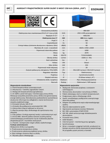 AGREGATY PR DOTWÓRCZE SUPER SILENT O MOCY 250 kVA (SERIA „010”) Oznaczenie produktu Elektryczna moc znamionowa (P.R.P.) 3~ (cos 0,8) Napi cie 3~/1~ Elektryczna moc 3~ Pr d 3~ Cz stotliwo Emisja ha asu (ci nienie akustyczne z dystansu 10m) Wymiary d . x szer. x wysoko Pojemno zbiornika paliwa Masa Silnik Obroty silnika Ilo cylindrów Paliwo Moc silnika Pojemno miski olejowej Zu ycie paliwa przy obci eniu 75%/100% Regulator obrotów Pr dnica Stopie ochrony Ch odzenie silnik / p dnica Rozruch Wyposa enie standardowe 1 x Panel bezpieczników automatycznych. 1 x Akustyczny + wietlny sygnalizator awarii. 1 x Wy cznik bezpiecze stwa (grzybkowy). 1 x IS-10(PL): panel steruj cy i monitoruj cy prac silnika. Wskazuje wszystkie parametry pracy silnika oraz generowanej energii elektrycznej. Ró nobarwne pod wietlenie wy wietlacza skutecznie informuje (na odleg ) o stanie technicznym zespo u pr dotwórczego. 1 X Gniazdo Schuko 16A IP-67. 1 x Gniazdo dla pod czenia automatyki BLC 200. 1 x Sekcja klem (z cze kablowe) w skrzynce. 1 x R czna pompa oleju silnikowego do opró niania misy olejowej. 1 x Filtr paliwa z funkcj separacji wody z automatycznym wy . 1 x ECCO-BAK: zbiornik paliwa stanowi szczeln wann uniemo liwiaj przedostanie si do rodowiska p ynów eksploatacyjnych z wycieków awaryjnych. 1 x T umik + kompensator drga uk adu wydechowego. Funkcje automatyczne: Wy czenie silnika w przypadku: Przekroczenia temperatury silnika. Przekroczenia za onej pr dko ci pracy silnika. Zbyt niskiego ci nienia oleju w silniku. Wycieku p ynu ch odz cego. kVA V kW A Hz dB(A) mm Ltr kg DEUTZ U/min Szt. ON kW Ltr l/h Typ S IP Medium Rodzaj 986 839 250 (+10% przeci enia) 400/230 200 (moc ci a) 361 50 68 3620 x 1450 x 2020 1090 2070 TCD213L064V 1500 (+/- 3%) 6 Diesel 250 20 39,6 (28 h pracy) / 49,9 (22 h pracy) Elektroniczny Synchroniczna (G3) 23 (klasa izolacji „H”) yn ch odz cy/powietrze Elektrostart / SZR (opcja) Wyposa enie opcjonalne Wy cznik ró nicowo-pr dowy z zestawem uziemiaj cym. Wzmocniony akumulator rozruchowy (170Ah). Pakiet u atwiaj cy start w niskich temperaturach. Podgrzewacz p ynu ch odz cego silnik. Zawór umo liwiaj cy pod czenie zewn trznego zbiornika paliwa. Adapter do pod czenia w a odprowadzaj cego spaliny. do odprowadzenia spalin. Ogrzewanie postojowe (zestaw Webasto). BLC 200: automatyka START/STOP. ASC-48: uk ad samoczynnego do adowywania akumulatora. Przewód mocy (10m). GSM-Modem. Internet-panel – monitoring pracy agregatu. Synchronizacja. Wraz z rozwojem osi gni techniki, producent na bie co poszerza ofert wyposa enia opcjonalnego. W przypadku pyta prosimy o kontakt. www.eisemann.com.pl Alarmy: Defekt pr dnicy, wype niony zanieczyszczeniami lub wod filtr separacyjny. Zalety: Czas pracy bez tankowania (na jednym zbiorniku) do 28 godzin przy 75% obci eniu agregatu. Doskona e parametry generowanego pr du (zaawansowana technologia AVR). Po zastosowaniu zaworu 3-dro nego i pod czenia zewn trznego zbiornika paliwa maksymalny czas nieprzerwanej pracy ograniczony jest tylko serwisem technicznym (olejowym). Agregat mo e by eksploatowany w temperaturze otoczenia -30 /+45°C (bez pakietu u atwiaj cego start silnika w niskich temperaturach 904 715) po zastosowaniu zimowego paliwa. Drzwiczki rewizyjne (zaopatrzone w zamek z kluczem i okno dla kontroli parametrów pracy) otwierane do góry u atwiaj c prace serwisowe dla bie cej obs ugi agregatu (zw aszcza w czasie deszczu). Opcjonalnie o wietlenie wn trze przestrzeni silnika, pr dnicy, podzespo ów techniczno-serwisowych. Korzy ci z zastosowania opcji SZR: automatyka pracuje w trybie ci ym w obie strony. Oznacza to, e uk ad zbiera potrzebne informacje z sieci i z agregatu, przetwarza je na impulsy i przetworzone przesy a na agregat steruj c jego prac , czasem za czenia i wy czenia pracy agregatu pr dotwórczego – zgodne z przepisami prawa energetycznego ustawienie uk adu SZR. Uk ad BLC umo liwia pod czenie modemów GSM lub Internet-panel. Ergonomiczne, zamykane na klucz drzwi dla przeprowadzania czynno ci pomiarowo-serwisowych. Przestrze silnika i pr dnicy pod wietlona (opcja) Du y, przestronny, zamykany na klucz schowek dla sterownika IS-10, bezpieczników i instrumentów kontrolno-pomiarowych. Panel odbioru mocy dodatkowo zabezpieczony drzwiczkami. Tankowanie i obs uga serwisowa silnika tylko z jednej strony agregatu. Panel steruj cy IS-10 (PL) umo liwia pe obs ug i monitoring parametrów pracy agregatu pr dotwórczego. Dobrze widoczny panel umieszczony za szyb w drzwiczkach atwia kontrol pracy agregatu. W przypadku informacji ostrzegawczych lub alarmowych zmienia si kolorystyka pod wietlenia wy wietlacza Status kolorów pod wietlenia: kit – system w czony, zielony – prawid owa praca agregatu, czerwony – alarm awaria silnika/pr dnicy. www.eisemann.com.pl ty – alarm uwaga,