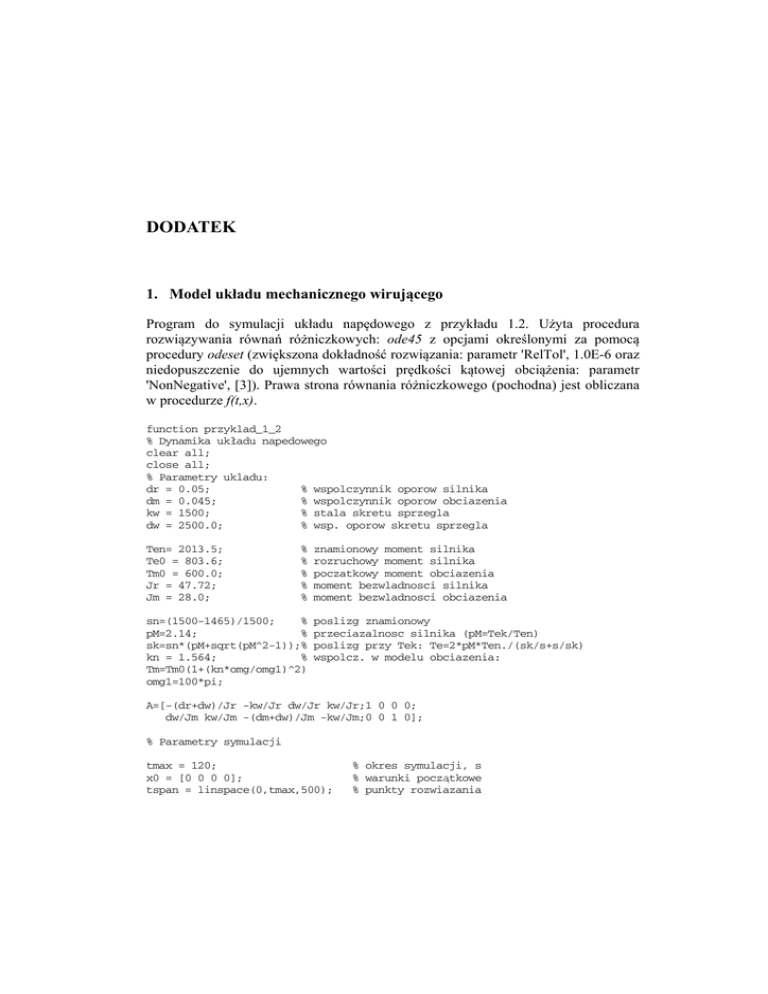 Program do symulacji układu napędowego z przykładu 1.2. Użyta procedura