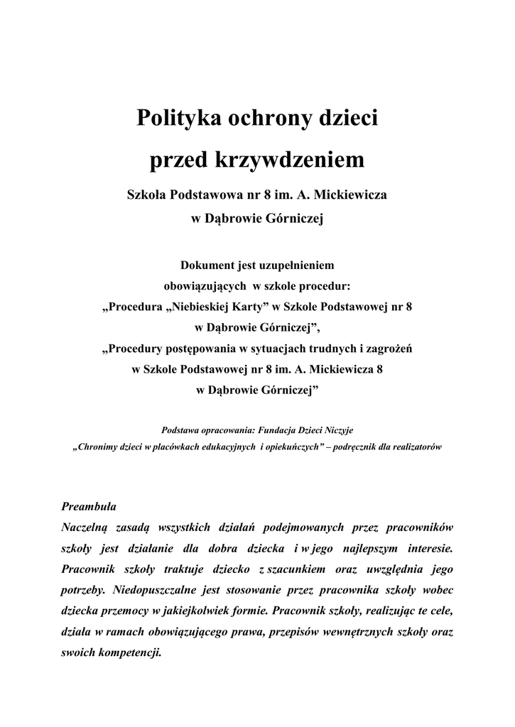 Polityka ochrony dzieci przed krzywdzeniem Szkoła Podstawowa nr 8 im. A. Mickiewicza w Dąbrowie Górniczej Dokument jest uzupełnieniem obowiązujących w szkole procedur: „Procedura „Niebieskiej Karty” w Szkole Podstawowej nr 8 w Dąbrowie Górniczej”, „Procedury postępowania w sytuacjach trudnych i zagrożeń w Szkole Podstawowej nr 8 im. A. Mickiewicza 8 w Dąbrowie Górniczej” Podstawa opracowania: Fundacja Dzieci Niczyje „Chronimy dzieci w placówkach edukacyjnych i opiekuńczych” – podręcznik dla realizatorów Preambuła Naczelną zasadą wszystkich działań podejmowanych przez pracowników szkoły jest działanie dla dobra dziecka i w jego najlepszym interesie. Pracownik szkoły traktuje dziecko z szacunkiem oraz uwzględnia jego potrzeby. Niedopuszczalne jest stosowanie przez pracownika szkoły wobec dziecka przemocy w jakiejkolwiek formie. Pracownik szkoły, realizując te cele, działa w ramach obowiązującego prawa, przepisów wewnętrznych szkoły oraz swoich kompetencji. Rozdział I Objaśnienie terminów 1. Pracownikiem szkoły jest osoba zatrudniona na podstawie umowy o pracę. 2. Dzieckiem jest każda osoba do ukończenia 18. roku życia. 3. Opiekunem dziecka jest osoba uprawniona do reprezentacji dziecka, w szczególności jego rodzic. W myśl niniejszego dokumentu opiekunem jest również rodzic zastępczy. 4. Zgoda rodzica dziecka oznacza zgodę co najmniej jednego z rodziców dziecka. Jednak w przypadku braku porozumienia między rodzicami dziecka należy poinformować rodziców o konieczności rozstrzygnięcia sprawy przez sąd rodzinno-opiekuńczy. 5. Przez krzywdzenie dziecka należy rozumieć popełnienie czynu zabronionego lub czynu karalnego na szkodę dziecka przez jakąkolwiek osobę, w tym pracownika szkoły lub zagrożenie dobra dziecka, w tym jego zaniedbywanie. 6. Dane osobowe dziecka to wszelkie informacje umożliwiające identyfikację dziecka. Rozdział II Rozpoznawanie i reagowanie na czynniki ryzyka krzywdzenia dzieci 1. Pracownicy szkoły zobowiązani są do posiadania wiedzy z zakresu rozpoznawania i reagowania na czynniki ryzyka krzywdzenia dzieci i w ramach wykonywanych obowiązków zwracają uwagę na czynniki ryzyka krzywdzenia dzieci. 2. W przypadku zidentyfikowania czynników ryzyka pracownicy szkoły podejmują rozmowę z rodzicami, przekazując informacje na temat dostępnej oferty wsparcia i motywując ich do szukania dla siebie pomocy. 3. Pracownicy monitorują sytuację i dobrostan uczniów. Rozdział III Procedury interwencji w przypadku krzywdzenia dziecka 1. W przypadku powzięcia przez pracownika podejrzenia, że dziecko jest krzywdzone, pracownik ma obowiązek sporządzenia notatki służbowej i przekazania uzyskanej informacji wychowawcy/pedagogowi/dyrektorowi szkoły. 2. Pedagog/wychowawca/dyrektor wzywa opiekunów dziecka, którego krzywdzenie podejrzewa oraz informuje ich o podejrzeniu. 3. Pedagog wraz z wychowawcą sporządza opis sytuacji szkolnej, rodzinnej dziecka na podstawie rozmów z dzieckiem, nauczycielami, wychowawcą, rodzicami i opracowują plan pomocy dziecku – Załącznik nr 1. 4. W przypadkach bardziej skomplikowanych np. dotyczących wykorzystywania seksualnego oraz znęcania się fizycznego i psychicznego o dużym nasileniu postępowanie według obowiązującej w szkole procedury „Niebieskiej Karty”. 5. Wszyscy pracownicy, którzy w związku z wykonywaniem obowiązków służbowych powzięli informacje o krzywdzeniu dziecka lub informacje z tym związane, są zobowiązani do zachowania tych informacji w tajemnicy, wyłączając informacje przekazywane uprawnionym instytucjom w ramach działań interwencyjnych. Rozdział IV Zasady ochrony danych osobowych dziecka 1. Dane osobowe dziecka podlegają ochronie na zasadach określonych w Ustawie z dnia 29 sierpnia 1997 r. o ochronie danych osobowych. 2. Pracownik szkoły ma obowiązek zachowania w tajemnicy danych osobowych, które przetwarza oraz zachowania w tajemnicy sposobów zabezpieczenia danych osobowych przed nieuprawnionym dostępem. 3. Dane osobowe dziecka są udostępniane wyłącznie osobom i podmiotom uprawnionym na podstawie odrębnych przepisów. 4. Pracownik szkoły jest uprawniony do przetwarzania danych osobowych dziecka i udostępniania tych danych w ramach zespołu interdyscyplinarnego, powołanego w trybie Ustawy z dnia 29 lipca 2005 r. o przeciwdziałaniu przemocy w rodzinie. 5. Pracownik szkoły może wykorzystać informacje o dziecku w celach szkoleniowych lub edukacyjnych wyłącznie z zachowaniem anonimowości dziecka oraz w sposób uniemożliwiający identyfikację dziecka. 6. Pracownik szkoły nie udostępnia przedstawicielom mediów informacji o dziecku ani jego opiekunie. - W przypadku wyrażenia pisemnej zgody przez rodzica, pracownik szkoły podaje przedstawicielowi mediów dane kontaktowe do opiekuna dziecka. - Pracownik szkoły nie kontaktuje przedstawicieli mediów z dziećmi. - Pracownik szkoły nie wypowiada się w kontakcie z przedstawicielami mediów o sprawie dziecka lub jego opiekuna. Zakaz ten dotyczy także sytuacji, gdy pracownik szkoły jest przeświadczony, że jego wypowiedź nie jest w żaden sposób utrwalana. - Pracownik szkoły, w wyjątkowych i uzasadnionych sytuacjach, może wypowiedzieć się w kontakcie z przedstawicielami mediów o sprawie dziecka lub jego opiekuna – po wyrażeniu pisemnej zgody przez opiekuna dziecka. 7. W celu realizacji materiału medialnego można udostępnić mediom wybrane pomieszczenia szkoły. - Decyzję w sprawie udostępnienia pomieszczenia podejmuje dyrektor. - Dyrektor, podejmując decyzję w sprawie udostępnienia pomieszczenia, poleca pracownikom przygotować wybrane pomieszczenie instytucji w celu realizacji materiału medialnego w taki sposób, by uniemożliwić filmowanie przebywających na terenie szkoły dzieci. Rozdział V Zasady ochrony wizerunku dziecka 1. Szkoła, uznając prawo dziecka do prywatności i ochrony dóbr osobistych, zapewnia ochr