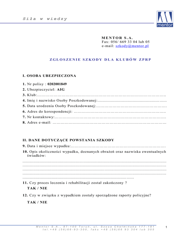 Siła w wiedzy MENTOR S.A. Fax: 056/ 669 33 04 lub 05 e-mail: [email protected] ZGŁOSZENIE SZKODY DLA KLUBÓW ZPRP I. OSOBA UBEZPIECZONA 1. Nr polisy : 0202001849 2. Ubezpieczyciel: AIG 3. Klub:……………………………………………………………………… ………….. 4. Imię i nazwisko Osoby Poszkodowanej:................................................... ...... 5. Data urodzenia Osoby Poszkodowanej:…………………………………… ………. 6. Adres do korespondencji: ………………………………………………………….. 7. Nr kontaktowy:………………………………………………………………………. 8. Adres e-mail: ……………………………………………………………………… ... II. DANE DOTYCZĄCE POWSTANIA SZKODY 9. Data i miejsce wypadku:……………………………………………………………. 10. Opis okoliczności wypadku, doznanych obrażeń oraz nazwiska ewentualnych świadków: .................................................. ..................................................................... ....................................................................................................................... .................................................................... ................................................... ....................................................................................................................... ...................................................................................... ...... 11. Czy proces leczenia i rehabilitacji został zakończony ? TAK / NIE 12. Czy w związku z wypadkiem zostały sporządzone raporty policyjne? TAK / NIE Mentor S.A., 87-100 Toruń, ul. Szosa Chełmińska 177 -181 tel.+48 (56)66-93-300, faks +48 (56)66 93 304 lub 305 1 Siła w wiedzy 13. Przyznane świadczenie proszę przekazać : na rachunek bankowy nr: __ ____ ____ ____ ____ ____ ____ nazwa banku:…………………………………………………………………….. właściciel rachunku:………………………..…………………………………… 14. Dokumentacja roszczeniowa: Do niniejszego wniosku prosimy o załączenie kopii pełnej dokumentacji medycznej związanej z wypadkiem, w tym zaświadczenia o zakończeniu procesu leczenia i rehabilitacji, raport policji (jeśli dotyczy). Jeśli roszczenie dotyczy Śmierci Osoby Ubezpieczonej prosimy dołączyć dokumentację med yczną stwierdzającą bezpośrednią przyczynę zgonu, Raport Prokuratury, wynik sekcji zwłok (jeśli została przeprowadzona), oświadczenie o ustanowieniu Beneficjenta, odpis Aktu Małżeństwa lub odpis Aktu Urodzenia (jeśli Benef icjentem jest potomstwo lub małżonek Osoby Ubezpieczonej), potwierdzoną notarialnie kopię dowodu osobistego Beneficjenta. ………………………………….... …………………………………… miejsce i data zgłoszenia podpis osoby upoważnionej Mentor S.A., 87-100 Toruń, ul. Szosa Chełmińska 177 -181 tel.+48 (56)66-93-300, faks +48 (56)66 93 304 lub 305 2