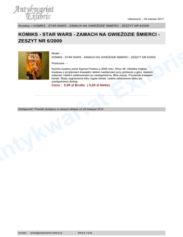Utworzono : 04 marzec 2017 Komiksy > KOMIKS - STAR WARS - ZAMACH NA GWIEŹDZIE ŚMIERCI - ZESZYT NR 6/2009 KOMIKS - STAR WARS - ZAMACH NA GWIEŹDZIE ŚMIERCI ZESZYT NR 6/2009 s i r b Model : - KOMIKS - STAR WARS - ZAMACH NA GWIEŹDZIE ŚMIERCI - ZESZYT NR 6/2009 Producent : - i l x Komiks wydany przez Egmont Polska w 2009 roku. Stron 46. Okładka miękka, kredowa z przytarciem krawędzi, lekkim naddarciem przy grzbiecie u góry, śladami załamań i lekkim zafalowaniem po zawilgotnieniu. Blok zszyty. Przytarcie krawędzi kartek. Ślady zagniecenia kilku rogów kartek. Lekkie zafalowanie bloku po zawilgotnieniu. E t Cena : 5,00 zł Brutto ( 5,00 zł Netto) a i r a w k y t n A Dostępność: Produkt dostępny w naszym sklepie od 29 listopad 2014 kontakt : - [email protected] Strona 1/{nb}