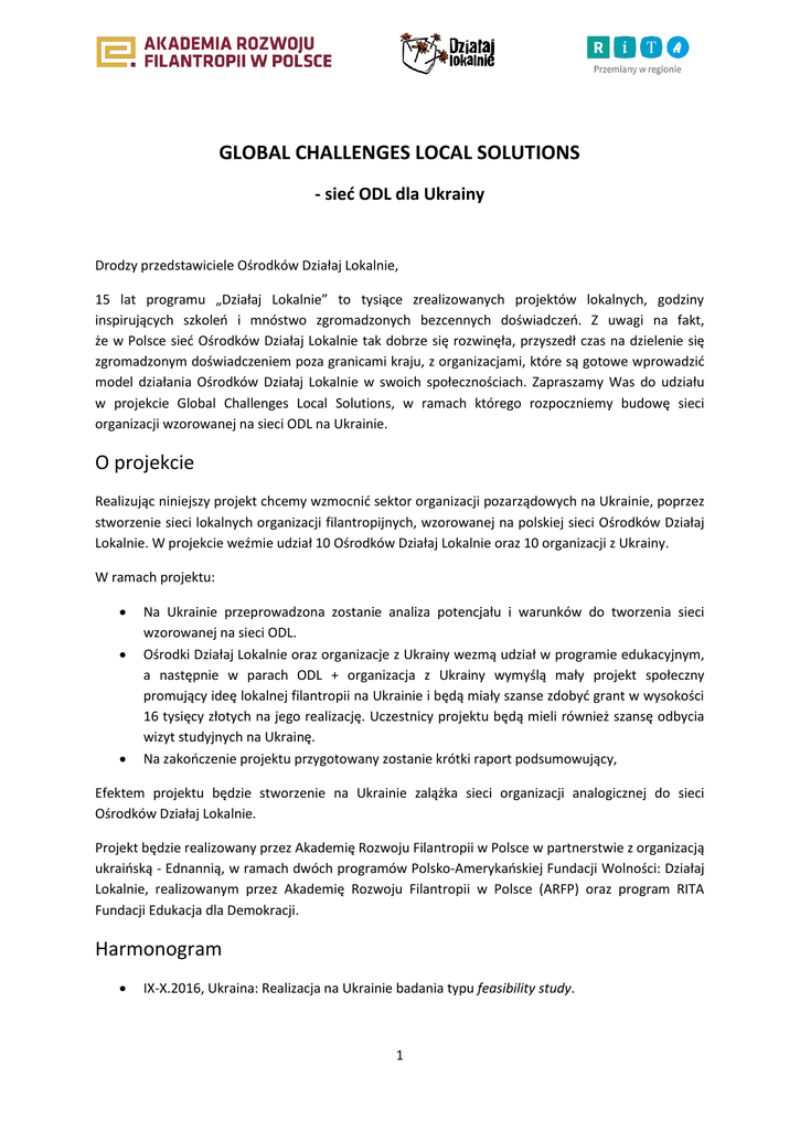 GLOBAL CHALLENGES LOCAL SOLUTIONS - sieć ODL dla Ukrainy Drodzy przedstawiciele Ośrodków Działaj Lokalnie, 15 lat programu „Działaj Lokalnie” to tysiące zrealizowanych projektów lokalnych, godziny inspirujących szkoleń i mnóstwo zgromadzonych bezcennych doświadczeń. Z uwagi na fakt, że w Polsce sieć Ośrodków Działaj Lokalnie tak dobrze się rozwinęła, przyszedł czas na dzielenie się zgromadzonym doświadczeniem poza granicami kraju, z organizacjami, które są gotowe wprowadzić model działania Ośrodków Działaj Lokalnie w swoich społecznościach. Zapraszamy Was do udziału w projekcie Global Challenges Local Solutions, w ramach którego rozpoczniemy budowę sieci organizacji wzorowanej na sieci ODL na Ukrainie. O projekcie Realizując niniejszy projekt chcemy wzmocnić sektor organizacji pozarządowych na Ukrainie, poprzez stworzenie sieci lokalnych organizacji filantropijnych, wzorowanej na polskiej sieci Ośrodków Działaj Lokalnie. W projekcie weźmie udział 10 Ośrodków Działaj Lokalnie oraz 10 organizacji z Ukrainy. W ramach projektu: Na Ukrainie przeprowadzona zostanie analiza potencjału i warunków do tworzenia sieci wzorowanej na sieci ODL. Ośrodki Działaj Lokalnie oraz organizacje z Ukrainy wezmą udział w programie edukacyjnym, a następnie w parach ODL + organizacja z Ukrainy wymyślą mały projekt społeczny promujący ideę lokalnej filantropii na Ukrainie i będą miały szanse zdobyć grant w wysokości 16 tysięcy złotych na jego realizację. Uczestnicy projektu będą mieli również szansę odbycia wizyt studyjnych na Ukrainę. Na zakończenie projektu przygotowany zostanie krótki raport podsumowujący, Efektem projektu będzie stworzenie na Ukrainie zalążka sieci organizacji analogicznej do sieci Ośrodków Działaj Lokalnie. Projekt będzie realizowany przez Akademię Rozwoju Filantropii w Polsce w partnerstwie z organizacją ukraińską - Ednannią, w ramach dwóch programów Polsko-Amerykańskiej Fundacji Wolności: Działaj Lokalnie, realizowanym przez Akademię Rozwoju Filantropii w Polsce (ARFP) oraz program RITA Fundacji Edukacja dla Demokracji. Harmonogram IX-X.2016, Ukraina: Realizacja na Ukrainie badania typu feasibility study. 1 X.2016, Radom, Polska: Dwudniowe szkolenie dla 10 Ośrodków Działaj Lokalnie oraz 10 organizacji z Ukrainy. X.2016 - V.2017, Ukraina: Wizyty studyjne. X.2016 - VI.2017: Konkurs na małe granty dla Ośrodków Działaj Lokalnie i przeprowadzenie projektów społecznych na Ukrainie. VII - VIII.2017: Przygotowanie raportu podsumowującego projekt. Dlaczego warto? Udział w projekcie Global Challenges Local Solutions to przede wszystkim: Możliwość zdobycia wiedzy i cennego doświadczenia w realizacji projektów międzynarodowych. Możliwość dzielenia się swoją wiedzą ekspercką i doświadczeniem z zagranicznymi organizacjami. Możliwość pozyskania nowych partnerów do działań lokalnych. Możliwość stworzenia ciekawego, międzynarodowego projektu. Udział w rozwoju społeczeństwa obywatelskiego na Ukrainie. Zapraszamy! Prosimy o potwierdzenie udziału w programie do 31 sierpnia 2016 r. Kontakt Marzena Kacprowicz [email protected] Tel. +48 505 474 355 Kaja Petryka [email protected] Tel. 22 825 70 22 2