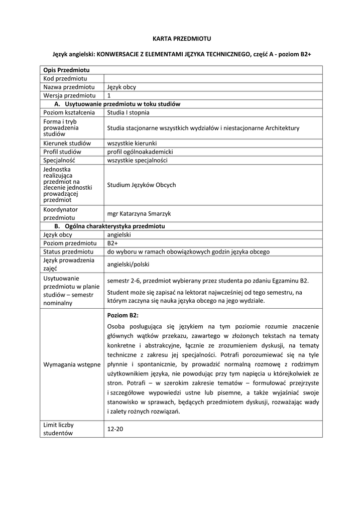 KARTA PRZEDMIOTU Język angielski: KONWERSACJE Z ELEMENTAMI JĘZYKA TECHNICZNEGO, część A - poziom B2+ Opis Przedmiotu Kod przedmiotu Nazwa przedmiotu Język obcy Wersja przedmiotu 1 A. Usytuowanie przedmiotu w toku studiów Poziom kształcenia Studia I stopnia Forma i tryb prowadzenia Studia stacjonarne wszystkich wydziałów i niestacjonarne Architektury studiów Kierunek studiów wszystkie kierunki Profil studiów profil ogólnoakademicki Specjalność wszystkie specjalności Jednostka realizująca przedmiot na Studium Języków Obcych zlecenie jednostki prowadzącej przedmiot Koordynator mgr Katarzyna Smarzyk przedmiotu B. Ogólna charakterystyka przedmiotu Język obcy angielski Poziom przedmiotu B2+ Status przedmiotu do wyboru w ramach obowiązkowych godzin języka obcego Język prowadzenia angielski/polski zajęć Usytuowanie semestr 2-6, przedmiot wybierany przez studenta po zdaniu Egzaminu B2. przedmiotu w planie Student może się zapisać na lektorat najwcześniej od tego semestru, na studiów – semestr którym zaczyna się nauka języka obcego na jego wydziale. nominalny Poziom B2: Osoba posługująca się językiem na tym poziomie rozumie znaczenie głównych wątków przekazu, zawartego w złożonych tekstach na tematy konkretne i abstrakcyjne, łącznie ze zrozumieniem dyskusji, na tematy techniczne z zakresu jej specjalności. Potrafi porozumiewać się na tyle Wymagania wstępne płynnie i spontanicznie, by prowadzić normalną rozmowę z rodzimym użytkownikiem języka, nie powodując przy tym napięcia u którejkolwiek ze stron. Potrafi – w szerokim zakresie tematów – formułować przejrzyste i szczegółowe wypowiedzi ustne lub pisemne, a także wyjaśniać swoje stanowisko w sprawach, będących przedmiotem dyskusji, rozważając wady i zalety rożnych rozwiązań. Limit liczby studentów 12-20 C. Efekty kształcenia i sposób prowadzenia zajęć Wiedza Cel przedmiotu Podniesienie znajomości języka powyżej poziomu B2 poprzez wprowadzenie elementów języka specjalistycznego. Przygotowanie studenta do podjęcia dalszych studiów lub pracy za granicą lub w firmach zagranicznych. Student dysponuje odpowiednim zakresem słownictwa w sprawach związanych ze swoją specjalnością jak i z większością tematów ogólnych. Zna zasady gramatyczne, pozwalające mu na formułowanie klarownych wypowiedzi, stosowanie zdań złożonych i argumentowanie. Pisanie: Potrafi prowadzić korespondencję z kontrahentami i współpracownikami w ramach dziedziny, którą się zajmuje. Potrafi napisać protokół, raport, notatkę służbową i inne teksty formalne podkreślając istotne kwestie i podając odpowiednie przykłady. Mówienie: Potrafi przedstawić klarowne opisy i dokonać prezentacji dotyczącą złożonej tematyki specjalistycznej, porządkując i rozwijając poszczególne zagadnienia i podając istotne szczegóły/ przykłady. Potrafi wyrażać poglądy i tworzyć argumenty. Potrafi uczestniczyć w dyskusji grupowej, nawet, gdy rozmowa jest szybka i potoczna. Potrafi prowadzić rozmowę z rodzimymi użytkownikami języka, przy czym rozmówcy nie muszą zmieniać swojego naturalnego sposobu komunikowania się. Umie komunikować się spontanicznie, wykazując znaczną płynność i łatwość wyrażania się. Potrafi dokonywać wymiany skomplikowanych informacji i porad odnośnie całej gamy spraw, związanych z własną rolą w pracy. Słuchanie: Potrafi stosować różne strategie, prowadzące do zrozumienia tekstu, takie jak słuchanie w celu wyszukania najważniejszych informacji, korzystając ze wskazówek wynikających z treści. Potrafi zrozumieć główne treści wykładów, wystąpień i raportów oraz innych form prezentacji akademickich/zawodowych, złożonych pod względem treści, leksyki i struktury. Kompetencje społeczne Efekty kształcenia Umiejętności Czytanie: Potrafi szybko określić wagę i treść wiadomości, artykułów i opracowań na różne tematy zawodowe, decydując, czy warte są dokładniejszego przeczytania. Potrafi zebrać informacje, koncepcje i opinie z wysoko wyspecjalizowanych źródeł w swojej dziedzinie. Rozumie długie i skomplikowane instrukcje dotyczące własnej specjalności. Jest świadom różnic kulturowych i wynikających z nich norm zachowania. Zna normy socjolingwistyczne (np. formy zwracania się do klientów, przełożonych). Umie pracować w grupie zgodnie z przydzieloną rolą. Formy zajęć dydaktycznych Ćwiczenia 30 godzin Podstawowe pojęcia z zakresu języka technicznego, z różnych dziedzin nauki. Treści kształcenia Tematyka obejmuje następujące zagadnienia: alternatywne źródła energii (prezentacja alternatywnych źródeł energii, ich plusów i minusów, energia jądrowa), lotnictwo (budowa samolotu, Airbus A380, rodzaje i budowa silników odrzutowych), domy przyszłości (Monolithic Dome, Global Village Shelters, Halley VI), materiałoznawstwo (plastik – rodzaje, wykorzystanie), inżynieria środowiska (sposoby oczyszczania środowiska), mosty i tunele (Golden Gate Bridge, słynne mosty i tunele – ich struktura), transport (Maglev), robotyka (na podstawie ASIMO, projektowanie robota do konkursu), elektronika (najbardziej pożądanie gadgety roku). Metody sprawdzania efektów →prace domowe →krótkie prace kontrolne →prezentacje Egzamin nie Literatura ▪ ‘Technology 2’ OXFORD, ▪ ‘Technical English 2’ PERSON LONGMAN, ▪ ‘Technical English 3’ PEARSON LONGMAN, ▪ www.youtube.com, ▪ materiały własne lektora, ▪ autentyczne teksty fachowe. Witryna www przedmiotu www.sjo.pw.edu.pl D. Nakład pracy studenta Liczba punktów ECTS 2 Liczba godzin pracy studenta związanych z osiągnięciem efektów kształcenia 30 godzin zajęcia + 30 godzin pracy własnej studenta (w tym przygotowanie do zajęć, przygotowanie do testu zaliczeniowego, przygotowanie prezentacji, itd.) E. Informacje dodatkowe Uwagi Wymagania do zaliczenia Obecność na zajęciach (dopuszczalne 2 nieuspra