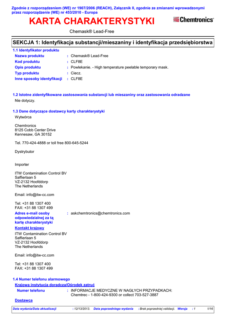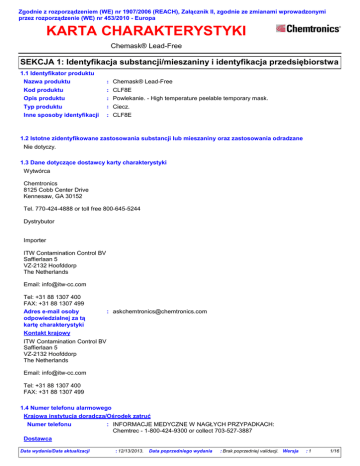 Zgodnie z rozporządzeniem (WE) nr 1907/2006 (REACH), Załącznik II, zgodnie ze zmianami wprowadzonymi przez rozporządzenie (WE) nr 453/2010 - Europa KARTA CHARAKTERYSTYKI Chemask® Lead-Free SEKCJA 1: Identyfikacja substancji/mieszaniny i identyfikacja przedsiębiorstwa 1.1 Identyfikator produktu Nazwa produktu : Chemask® Lead-Free Kod produktu : CLF8E : Powlekanie. - High temperature peelable temporary mask. Opis produktu Typ produktu Inne sposoby identyfikacji : Ciecz. : CLF8E 1.2 Istotne zidentyfikowane zastosowania substancji lub mieszaniny oraz zastosowania odradzane Nie dotyczy. 1.3 Dane dotyczące dostawcy karty charakterystyki Wytwórca Chemtronics 8125 Cobb Center Drive Kennesaw, GA 30152 Tel. 770-424-4888 or toll free 800-645-5244 Dystrybutor Importer ITW Contamination Control BV Saffierlaan 5 VZ-2132 Hoofddorp The Netherlands Email: [email protected] Tel: +31 88 1307 400 FAX: +31 88 1307 499 Adres e-mail osoby odpowiedzialnej za tą kartę charakterystyki : [email protected] Kontakt krajowy ITW Contamination Control BV Saffierlaan 5 VZ-2132 Hoofddorp The Netherlands Email: [email protected] Tel: +31 88 1307 400 FAX: +31 88 1307 499 1.4 Numer telefonu alarmowego Krajowa instytucja doradcza/Ośrodek zatruć Numer telefonu : INFORMACJE MEDYCZNE W NAGŁYCH PRZYPADKACH: Chemtrec - 1-800-424-9300 or collect 703-527-3887 Dostawca Data wydania/Data aktualizacji : 12/13/2013. Data poprzedniego wydania : Brak poprzedniej validacji. Wersja :1 1/16 Spełnia wymagania przepisów EC 1907/2006 (REACH), Załącznik II - Europa Chemask® Lead-Free SEKCJA 1: Identyfikacja substancji/mieszaniny i identyfikacja przedsiębiorstwa Numer telefonu : Chemtronics Product Information: 800-TECH-401 (800-832-4401) Chemtronics Customer Service: 800-645-5244 Chemtrec 800-424-9300 Godziny pracy : Chemtrec - 1-800-424-9300 or collect 703-527-3887 Dla osób udzielających pomocy 24/7 : INFORMACJE MEDYCZNE W NAGŁYCH PRZYPADKACH: INFORMACJE O POSTĘPOWANIU W RAZIE ROZLANIA: Informacje o transporcie Ograniczenia dotyczące informacji SEKCJA 2: Identyfikacja zagrożeń 2.1 Klasyfikacja substancji lub mieszaniny : Mieszanina Definicja produktu Klasyfikacja według rozporządzenia (EC) Nr 1272/2008 [CLP/GHS] Acute Tox. 3, H301 Acute Tox. 3, H311 Acute Tox. 3, H331 Aquatic Chronic 3, H412 Produkt został sklasyfikowany jako niebezpieczny według rozporządzenia (WE) 1272/2008 ze zmianami. : Procentowa zawartość w mieszaninie składnika/składników o nieznanej Składniki o nieznanej toksyczności: 95.5% toksyczności Skłądniki o nieznanej ekotoksyczności : Procentowa zawartość w mieszaninie składnika/składników o nieznanym zagrożeniu dla środowiska wodnego: 95.5% Klasyfikacja według Dyrektywy 1999/45/WE [DPD] Produkt ten jest sklasyfikowany jako niebezpieczny w rozumieniu Dyrektywy 1999/45/EC wraz z jej późniejszymi zmianami. Klasyfikacja : R52/53 : Działa szkodliwie na organizmy wodne; może powodować długo utrzymujące się Zagrożenia dla niekorzystne zmiany w środowisku wodnym. środowiska Pełny tekst powyższych zwrotów R lub uwag H podano w punkcie 16. Bardziej szczegółowe informacje dotyczące wpływu na stan zdrowia oraz ewentualnych objawów można znaleźć w rozdziale 11. 2.2 Elementy oznakowania Piktogramy zagrożeń : Hasło ostrzegawcze : Niebezpieczeństwo Zwroty wskazujące rodzaj zagrożenia : Działa toksycznie po połknięciu, w kontakcie ze skórą lub w następstwie wdychania. Działa szkodliwie na organizmy wodne, powodując długotrwałe skutki. Zwroty wskazujące środki ostrożności Zapobieganie Reagowanie Przechowywanie Usuwanie Niebezpieczne składniki Data wydania/Data aktualizacji : Stosować rękawice ochronne. Stosować odzież ochronną. Unikać uwolnienia do środowiska. : W PRZYPADKU DOSTANIA SIĘ DO DRÓG ODDECHOWYCH: Wyprowadzić lub wynieść poszkodowanego na świeże powietrze i zapewnić mu warunki do swobodnego oddychania. W PRZYPADKU POŁKNIĘCIA: Natychmiast skontaktować się z OŚRODKIEM ZATRUĆ lub wezwać lekarza. : Przechowywać pod zamknięciem. : Zawartość pojemnika jak i pojemnik utylizować zgodnie z lokalnymi, regionalnymi, narodowymi oraz międzynarodowymi przepisami. : metanol : 12/13/2013. Data poprzedniego wydania : Brak poprzedniej validacji. Wersja :1 2/16 Spełnia wymagania przepisów EC 1907/2006 (REACH), Załącznik II - Europa Chemask® Lead-Free SEKCJA 2: Identyfikacja zagrożeń Uzupełniające elementy etykiety : Zawiera bis(dibutyloditiokarbaminian) cynku. Może powodować wystąpienie reakcji alergicznej. : Nie dotyczy. Ograniczenia dotyczące produkcji, wprowadzania do obrotu i stosowania niektórych niebezpiecznych substancji, preparatów i wyrobów Specjalne wymagania dotyczące pakowania : Nie dotyczy. Pojemniki powinny być wyposażone w zamknięcia uniemożliwiające otworzenie ich przez dzieci : Nie dotyczy. Dotykowe ostrzeżenia przed niebezpieczeństwem 2.3 Inne zagrożenia Inne zagrożenia nie odzwierciedlone w klasyfikacji : Nie znane. SEKCJA 3: Skład/informacja o składnikach 3.2 Mieszaniny : Mieszanina Klasyfikacja Nazwa produktu/ składnika Identyfikatory % metanol WE: 200-659-6 CAS: 67-56-1 Indeks: 603-001-00-X <3 bis WE: 205-232-8 >=0.25 - <1 (dibutyloditiokarbaminian) CAS: 136-23-2 cynku Indeks: 006-081-00-9 amoniak roztwór…% WE: 215-647-6 CAS: 1336-21-6 Indeks: 007-001-01-2 Data wydania/Data aktualizacji : 12/13/2013. <5 67/548/EWG Rozporządzenie (WE) Nr 1272/2008 [CLP] F; R11 T; R23/24/25, R39/23/24/25 Flam. Liq. 2, H225 Acute Tox. 3, H301 Acute Tox. 3, H311 Acute Tox. 3, H331 Skin Irrit. 2, H315 Eye Irrit. 2, H319 STOT SE 1, H370 Aquatic Chronic 3, H412 Xi; R36/37/38 Skin Irrit. 2, H315 R43 Eye Irrit. 2, H319 N; R50/53 Skin Sens. 1, H317 STOT SE 3, H335 (Działanie drażniące na drogi oddechowe) Aquatic Acute 1, H400 Aquatic Chronic 1, H410 C; R34 Acute Tox. 4, H302 N; R50 Skin Corr. 1B, H314 Eye Irrit. 2, H319 STOT SE 3, H335 (Działanie drażniące na drogi oddechowe) Aquatic Acute 1, H400 Aq