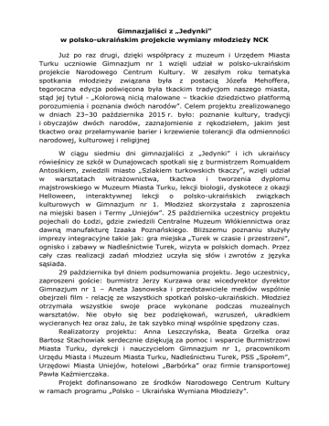 Gimnazjaliści z „Jedynki” w polsko-ukraińskim projekcie wymiany młodzieży NCK Już po raz drugi, dzięki współpracy z muzeum i Urzędem Miasta Turku uczniowie Gimnazjum nr 1 wzięli udział w polsko-ukraińskim projekcie Narodowego Centrum Kultury. W zeszłym roku tematyka spotkania młodzieży związana była z postacią Józefa Mehoffera, tegoroczna edycja poświęcona była tkackim tradycjom naszego miasta, stąd jej tytuł - „Kolorową nicią malowane – tkackie dziedzictwo platformą porozumienia i poznania dwóch narodów”. Celem projektu zrealizowanego w dniach 23–30 października 2015 r. było: poznanie kultury, tradycji i obyczajów dwóch narodów, zaznajomienie z rękodziełem, jakim jest tkactwo oraz przełamywanie barier i krzewienie tolerancji dla odmienności narodowej, kulturowej i religijnej W ciągu siedmiu dni gimnazjaliści z „Jedynki” i ich ukraińscy rówieśnicy ze szkół w Dunajowcach spotkali się z burmistrzem Romualdem Antosikiem, zwiedzili miasto „Szlakiem turkowskich tkaczy”, wzięli udział w warsztatach witrażownictwa, tkactwa i tworzenia dyplomu majstrowskiego w Muzeum Miasta Turku, lekcji biologii, dyskotece z okazji Helloween, interaktywnej lekcji o polsko-ukraińskich związkach kulturowych w Gimnazjum nr 1. Młodzież skorzystała z zaproszenia na miejski basen i Termy „Uniejów”. 25 października uczestnicy projektu pojechali do Łodzi, gdzie zwiedzili Centralne Muzeum Włókiennictwa oraz dawną manufakturę Izaaka Poznańskiego. Bliższemu poznaniu służyły imprezy integracyjne takie jak: gra miejska „Turek w czasie i przestrzeni”, ognisko i zabawy w Nadleśnictwie Turek, wizyta w polskich domach. Przez cały czas realizacji zadań młodzież uczyła się słów i zwrotów z języka sąsiada. 29 października był dniem podsumowania projektu. Jego uczestnicy, zaproszeni goście: burmistrz Jerzy Kurzawa oraz wicedyrektor dyrektor Gimnazjum nr 1 – Aneta Jasnowska i przedstawiciele mediów wspólnie obejrzeli film - relację ze wszystkich spotkań polsko-ukraińskich. Młodzież otrzymała wszystkie swoje prace wykonane podczas muzealnych warsztatów. Nie obyło się bez podziękowań, wzruszeń, ukradkiem wycieranych łez oraz żalu, że tak szybko minął wspólnie spędzony czas. Realizatorzy projektu: Anna Leszczyńska, Beata Grzelka oraz Bartosz Stachowiak serdecznie dziękują za pomoc i wsparcie Burmistrzowi Miasta Turku, dyrekcji i nauczycielom Gimnazjum nr 1, pracownikom Urzędu Miasta i Muzeum Miasta Turku, Nadleśnictwu Turek, PSS „Społem”, Urzędowi Miasta Uniejów, hotelowi „Barbórka” oraz firmie transportowej Pawła Kaźmierczaka. Projekt dofinansowano ze środków Narodowego Centrum Kultury w ramach programu „Polsko – Ukraińska Wymiana Młodzieży”.
