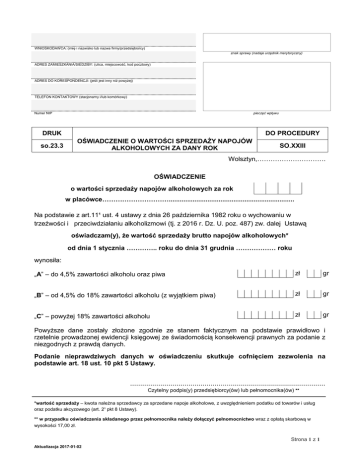 WNIOSKODAWCA: (imię i nazwisko lub nazwa firmy/przedsiębiorcy) znak sprawy (nadaje urzędnik merytoryczny) ADRES ZAMIESZKANIA/SIEDZIBY: (ulica, miejscowość, kod pocztowy) ADRES DO KORESPONDENCJI: (jeśli jest inny niż powyżej) TELEFON KONTAKTOWY (stacjonarny i/lub komórkowy) pieczęć wpływu Numer NIP DRUK so.23.3 DO PROCEDURY OŚWIADCZENIE O WARTOŚCI SPRZEDAŻY NAPOJÓW ALKOHOLOWYCH ZA DANY ROK SO.XXIII Wolsztyn,…………………………. OŚWIADCZENIE o wartości sprzedaży napojów alkoholowych za rok w placówce………………………….................................................................... Na podstawie z art.11¹ ust. 4 ustawy z dnia 26 października 1982 roku o wychowaniu w trzeźwości i przeciwdziałaniu alkoholizmowi (tj. z 2016 r. Dz. U. poz. 487) zw. dalej Ustawą oświadczam(y), że wartość sprzedaży brutto napojów alkoholowych* od dnia 1 stycznia ………….. roku do dnia 31 grudnia ……………… roku wynosiła: „A” – do 4,5% zawartości alkoholu oraz piwa zł gr „B” – od 4,5% do 18% zawartości alkoholu (z wyjątkiem piwa) zł gr „C” – powyżej 18% zawartości alkoholu zł gr Powyższe dane zostały złożone zgodnie ze stanem faktycznym na podstawie prawidłowo i rzetelnie prowadzonej ewidencji księgowej ze świadomością konsekwencji prawnych za podanie z niezgodnych z prawdą danych. Podanie nieprawdziwych danych w oświadczeniu skutkuje cofnięciem zezwolenia na podstawie art. 18 ust. 10 pkt 5 Ustawy. ................................................................................................. Czytelny podpis(y) przedsiębiorcy(ów) lub pełnomocnika(ów) ** *wartość sprzedaży – kwota należna sprzedawcy za sprzedane napoje alkoholowe, z uwzględnieniem podatku od towarów i usług oraz podatku akcyzowego (art. 2¹ pkt 8 Ustawy). ** w przypadku oświadczenia składanego przez pełnomocnika należy dołączyć pełnomocnictwo wraz z opłatą skarbową w wysokości 17,00 zł. Strona 1 z 1 Aktualizacja 2017-01-02