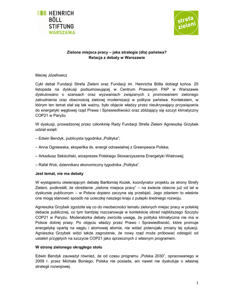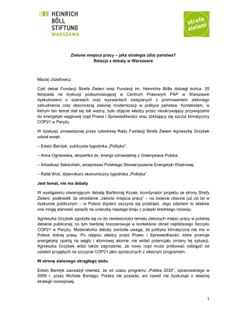 Zielone miejsca pracy – jaka strategia (dla) państwa? Relacja z debaty w Warszawie Maciej Józefowicz Cykl debat Fundacji Strefa Zieleni oraz Fundacji im. Heinricha Bölla dobiegł końca. 25 listopada na dyskusji podsumowującej w Centrum Prasowym PAP w Warszawie dyskutowano o szansach oraz wyzwaniach związanych z promowaniem zielonego zatrudnienia oraz obecnością zielonej modernizacji w polityce państwa. Kontekstem, w którym ten temat stał się tak ważny, było objęcie władzy przez nieukrywający przywiązania do energetyki węglowej rząd Prawa i Sprawiedliwości oraz zbliżający się szczyt klimatyczny COP21 w Paryżu W dyskusji, prowadzonej przez członkinię Rady Fundacji Strefa Zieleni Agnieszkę Grzybek udział wzięli: – Edwin Bendyk, publicysta tygodnika „Polityka”; – Anna Ogniewska, ekspertka ds. energii odnawialnej z Greenpeace Polska; – Arkadiusz Sekściński, wiceprezes Polskiego Stowarzyszenia Energetyki Wiatrowej; – Rafał Woś, dziennikarz ekonomiczny tygodnika „Polityka”. Jest temat, nie ma debaty W wystąpieniu otwierającym debatę Bartłomiej Kozek, koordynator projektu ze strony Strefy Zieleni, podkreślił, że określenie „zielone miejsca pracy” – na świecie obecne już od lat w dyskursie publicznym – w Polsce dopiero zaczyna się przebijać. Jego zdaniem to właśnie one mogą stanowić sposób na ucieczkę naszego kraju z pułapki średniego rozwoju. Agnieszka Grzybek zgodziła się co do nieobecności tematu zielonych miejsc pracy w polskiej debacie publicznej, co tym bardziej rozczarowuje w kontekście obrad najbliższego Szczytu COP21 w Paryżu. Moderatorka debaty zwróciła uwagę, że polityka klimatyczna nie ma w Polsce dobrej prasy. Po objęciu władzy przez Prawo i Sprawiedliwość, które promuje energetykę opartą na węglu i atomowej atomie, nie widać potencjału zmiany tej sytuacji. Agnieszka Grzybek widzi także zagrożenie, że nowy rząd może próbować odstąpić od ustaleń przyjętych na szczycie COP21 jako sprzecznych z własnym programem. W stronę zielonego okrągłego stołu Edwin Bendyk zauważył również, że od czasu programu „Polska 2030”, opracowanego w 2009 r. przez Michała Boniego, Polska nie posiada, ani nawet nie dyskutuje o własnej strategii rozwojowej. 1 To zaniedbanie szczególnie szkodzi społeczeństwu z uwagi na zmianę paradygmatu rozwoju, do jakiej doszło w ostatnich latach. Rozwój nie jest mierzony wyłącznie wzrostem PKB czy ekspansją wielkich metropolii. Według np. Marthy Nussbaum jego miernikiem jest wykorzystanie potencjału maksymalnej liczby ludzi i upodmiotowienie jak największej liczby społeczeństwa. Zdaniem Bendyka to nowe podejście można pogodzić z zieloną modernizacją. Pomocne tu są np. prace Jeremy'ego Rifkina, który porównał transformację energetyki do rozwoju internetu. Zielona energetyka, podobnie jak globalna sieć komputerowa, zrywa z centralizacją i pozwala wykształcić się innowacyjnym rodzajom procesów wytwórczych. Wyzwaniem jest jednak uzależnienie od zagranicznych technologii, analogicznie do zależności od Google czy Facebooka. Bendyk podkreślił, że mimo braku odpowiedniej strategii państwowej odpowiednia baza do zielonej modernizacji już istnieje. Śląsk zrywa z wizerunkiem węglowego zagłębia. Dziś w regionie, dwa razy więcej osób pracuje w sektorze wysokich technologii niż w kopalniach. Istniejąca infrastruktura nie współpracuje jednak ze sobą na poziomie ogólnokrajowym. Jako rozwiązanie problemu wysunął propozycję „zielonego okrągłego stołu” – porozumienia aktorów zainteresowanych zieloną gospodarką ze względów politycznych i ekonomicznych. Nie powinni być to wyłącznie reprezentanci zielonych nurtów w polityce – celem ma być wypracowanie modelu modernizacji wolnego od ideologii i możliwego do wykorzystania przez wszystkie siły polityczne. Podpowiedzmy nowemu rządowi ekologię Kolejny dyskutant, Rafał Woś, zwrócił uwagę, że brak elementów ekologicznych w programie Prawa i Sprawiedliwości nie musi oznaczać automatycznie ich porzucenia przez nowe władze. Przypomniał, że zielone tematy istniały deklaratywnie w polityce rządu PO-PSL, ale były ignorowane w realnych działaniach. Zdaniem Wosia PiS wraca do myślenia o rozwoju Polski w kategorii wielkiej strategii, czego przejawem jest m.in. nominacja Mateusza Morawieckiego na stanowisko wicepremiera i ministra rozwoju. Chociaż ta strategia nie zawiera obecnie elementów ekologicznych, nic teoretycznie nie stoi na przeszkodzie włączeniu kwestii środowiskowych w jej ramy. Jeśli więc zostanie wypracowana odpowiednia narracja o potencjale zielonego przemysłu (np. jako modernizacyjnych wysokich technologii), istnieje możliwość, że PiS doda ją do swoich priorytetów rozwoju. Sektor OZE musi radzić sobie sam Arkadiusz Sekściński na pytanie o dotychczasowe wsparcie dla sektora energetyki odnawialnej ze strony rządowej odpowiedział, że OZE to zaledwie wąski wycinek zielonych miejsc pracy, ale nie mówi się o nich jako całości z uwagi na brak państwowej strategii. Zdaniem eksperta ani poprzedni, ani obecny rząd nie stworzyły zdrowego modelu wsparcia zielonego przemysłu. 2 Sekściński potwierdził, że PiS sprzeciwia się rozwojowi OZE z powodów politycznych, budując kapitał na społecznych protestach. Źródłem obecnego sprzeciwu tej partii wobec energii wiatrowej ma też być jej wcześniejsze promowanie przez PO kosztem geotermii powiązanej z PiS (m.in. przez osobę o. Tadeusza Rydzyka). Z kolei wprowadzone przez rząd PO-PSL aukcje OZE nie stworzyły zaufania społecznego dla zielonej energii. Pomoc państwa była postrzegana jako zasilanie kieszeni zaprzyjaźnionych z władzą przedsiębiorstw, nie inwestycja w przyszłość. Największym wsparciem dla przedsiębiorców jest według Sekścińskiego samo istnienie ustawy o odnawialnych źródłach energii – niesatysfakcjonującej, ale dającej r