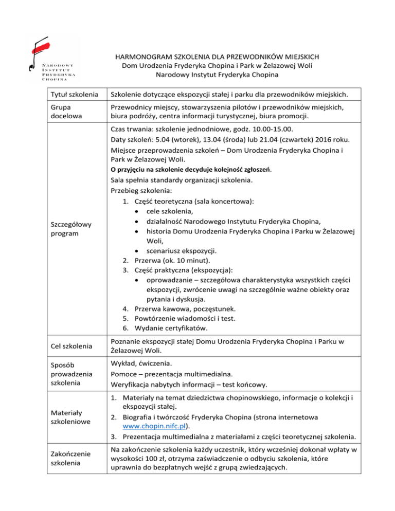 HARMONOGRAM SZKOLENIA DLA PRZEWODNIKÓW MIEJSKICH Dom Urodzenia Fryderyka Chopina i Park w Żelazowej Woli Narodowy Instytut Fryderyka Chopina Tytuł szkolenia Szkolenie dotyczące ekspozycji stałej i parku dla przewodników miejskich. Grupa docelowa Przewodnicy miejscy, stowarzyszenia pilotów i przewodników miejskich, biura podróży, centra informacji turystycznej, biura promocji. Czas trwania: szkolenie jednodniowe, godz. 10.00-15.00. Daty szkoleń: 5.04 (wtorek), 13.04 (środa) lub 21.04 (czwartek) 2016 roku. Miejsce przeprowadzenia szkoleń – Dom Urodzenia Fryderyka Chopina i Park w Żelazowej Woli. O przyjęciu na szkolenie decyduje kolejność zgłoszeń. Szczegółowy program Sala spełnia standardy organizacji szkolenia. Przebieg szkolenia: 1. Część teoretyczna (sala koncertowa): cele szkolenia, działalność Narodowego Instytutu Fryderyka Chopina, historia Domu Urodzenia Fryderyka Chopina i Parku w Żelazowej Woli, scenariusz ekspozycji. 2. Przerwa (ok. 10 minut). 3. Część praktyczna (ekspozycja): oprowadzanie – szczegółowa charakterystyka wszystkich części ekspozycji, zwrócenie uwagi na szczególnie ważne obiekty oraz pytania i dyskusja. 4. Przerwa kawowa, poczęstunek. 5. Powtórzenie wiadomości i test. 6. Wydanie certyfikatów. Cel szkolenia Poznanie ekspozycji stałej Domu Urodzenia Fryderyka Chopina i Parku w Żelazowej Woli. Sposób prowadzenia szkolenia Wykład, ćwiczenia. Pomoce – prezentacja multimedialna. Weryfikacja nabytych informacji – test końcowy. Materiały szkoleniowe 1. Materiały na temat dziedzictwa chopinowskiego, informacje o kolekcji i ekspozycji stałej. 2. Biografia i twórczość Fryderyka Chopina (strona internetowa www.chopin.nifc.pl). 3. Prezentacja multimedialna z materiałami z części teoretycznej szkolenia. Zakończenie szkolenia Na zakończenie szkolenia każdy uczestnik, który wcześniej dokonał wpłaty w wysokości 100 zł, otrzyma zaświadczenie o odbyciu szkolenia, które uprawnia do bezpłatnych wejść z grupą zwiedzających.