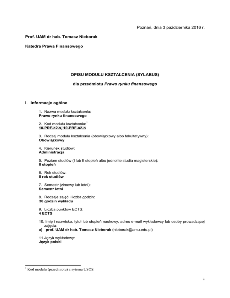 Poznań, dnia 3 października 2016 r. Prof. UAM dr hab. Tomasz Nieborak Katedra Prawa Finansowego OPISU MODUŁU KSZTAŁCENIA (SYLABUS) dla przedmiotu Prawo rynku finansowego I. Informacje ogólne 1. Nazwa modułu kształcenia: Prawo rynku finansowego 2. Kod modułu kształcenia: 10-PRF-a2-s, 10-PRF-a2-n 1 3. Rodzaj modułu kształcenia (obowiązkowy albo fakultatywny): Obowiązkowy 4. Kierunek studiów: Administracja 5. Poziom studiów (I lub II stopień albo jednolite studia magisterskie): II stopień 6. Rok studiów: II rok studiów 7. Semestr (zimowy lub letni): Semestr letni 8. Rodzaje zajęć i liczba godzin: 30 godzin wykładu 9. Liczba punktów ECTS: 4 ECTS 10. Imię i nazwisko, tytuł lub stopień naukowy, adres e-mail wykładowcy lub osoby prowadzącej zajęcia: a) prof. UAM dr hab. Tomasz Nieborak ([email protected]) 11. Język wykładowy: Język polski 1 Kod modułu (przedmiotu) z sytemu USOS. 1 II. Informacje szczegółowe 1. Cel modułu kształcenia: Dogłębne przyswojenie przez studenta wiedzy z zakresu obowiązującego prawa rynku finansowego. 2. Wymagania wstępne w zakresie wiedzy, umiejętności oraz kompetencji społecznych (jeśli obowiązują): Wymagania wstępne w zakresie wiedzy są następujące: a) Podstawowa wiedza w zakresie stanowienia, obowiązywania, funkcjonowania, interpretowania i stosowania obowiązującego prawa finansowego. b) Znajomość podstawowych zasad ekonomii ze szczególnym uwzględnieniem treści odpowiadającej treści modułu kształcenia dla przedmiotu mikro- i makroekonomia. Brak szczególnych wymagań w zakresie umiejętności i kompetencji społecznych. 3. Efekty kształcenia w zakresie wiedzy, umiejętności oraz kompetencji społecznych dla modułu 2 3 kształcenia i odniesienie do efektów kształcenia dla kierunku studiów: Symbol efektów 4 kształcenia Odniesienie do efektów Po zakończeniu modułu (przedmiotu) i potwierdzeniu kształcenia dla kierunku osiągnięcia efektów kształcenia student potrafi: 5 studiów PRF_01 Wyjaśnić istotę i funkcje rynku finansowego z uwzględnieniem jego podziału PRF_W01-04, PRF_U01 PRF_02 Objaśnić ważne pojęcia prawa rynku finansowego oraz scharakteryzować najważniejsze instytucje zarówno w ujęciu przedmiotowym, jak i podmiotowym z odwołaniem do aktualnych poglądów doktryny, orzecznictwa oraz zmian zachodzących na rynku. PRF_W02-03, PRF_U02, PRF_U06 PRF_03 Scharakteryzować historyczne, filozoficzne i ustrojowe podstawy kształtowania się polityki gospodarczej państwa i roli, jaką pełni w niej efektywnie funkcjonujący rynek finansowy PRF_W05-09, PRF_U02 PRF_04 Odnaleźć potrzebny przepis w systemie obowiązującego prawa PRF_W01, PRF_U02, PRF_U04, PRF_U06 PRF_05 Przeprowadzić interpretację odpowiedniego przepisu PRF_W04, PRF_U04, w oparciu o przyjęte metody i reguły wykładni PRF_U06 PRF_06 Dokonać analizy i interpretacji zachodzących zmian na rynkach finansowych w ujęciu krajowym i globalnym PRF_W04, PRF_U01, PRF_U02 PRF_07 Komunikować się w języku prawnym i prawniczym z zakresu prawa rynku finansowego i nauki prawa rynku finansowego PRF_W07, PRF_U01, PRF_U06 2 Zasadniczo należy nawiązać do kierunkowych efektów kształcenia z zakresu wiedzy i umiejętności społecznych. Jednak nie należy dzielić efektów kształcenia danego modułu na kategorie wiedzy, umiejętności i kompetencji społecznych. Każdy moduł (przedmiot) nie musi obejmować wszystkich trzech kategorii efektów kształcenia, ani też każdego efektu. Jeśli efektem kształcenia jest np. analiza wymagająca określonej wiedzy, to nie trzeba oddzielnie definiować efektów kształcenia w kategorii wiedzy. 3 Zaleca się, aby, w zależności od modułu, liczba efektów kształcenia zawierała się w przedziale: 5-10. 4 Kod modułu kształcenia, np. PK_01 (PK-kod modułu „Prawo karne” w USOS). 5 Efekty kształcenia dla kierunku studiów Prawo (np. K_W01, K_U01,...), gdzie: W – wiedza; U – umiejętności; K – kompetencje społeczne (wyszczególnione tylko w symbolach kierunkowych efektów kształcenia); 01, 02…– numer efektu kształcenia. 2 PRF_08 Wyjaśnić praktyczne znaczenie instrumentów wykorzystywanych na rynku finansowym 4. Treści kształcenia: PRF_W01-15, PRF_U08 6 Nazwa modułu kształcenia: Prawo karne (PK) Symbol treści 7 kształcenia TK_01 TK_02 TK_03 TK_04 TK_05 TK_06 TK_07 TK_08 TK_09 TK_10 Opis treści Kształcenia Rynek finansowy – pojęcie, znaczenie, regulacja. Prawo rynku finansowego jako dziedzina prawa finansowego. Aspekty regulacyjne. Pieniądz – pojęcie, formy, teorie, historia. Sposoby kreacji pieniądza (rola banków komercyjnych i banku centralnego). Podstawowe pojęcie dotyczące pieniądza (popyt, podaż, inflacja, deflacja). Powstanie i ewolucja bankowości. Rynek pieniężny a kapitałowy. Polski a europejski system finansowy. Pieniądz a waluta. Wymienialność pieniądza. Pieniądz międzynarodowy. Międzynarodowe organizacje finansowe (rola, cele i zadania). Bankowość centralna – założenia i funkcje. Rozwiązania i przykłady innych państw. Nadzór bankowy, system gwarantowania depozytów bankowych oraz sposoby przeprowadzania rozrachunków międzybankowych. Regulacje Unii Europejskiej odnoszące się do działalności finansowej - charakterystyka. Charakterystyka wybranych instrumentów finansowych – aspekt ekonomiczny. Charakterystyka wybranych instrumentów finansowych – aspekt prawny. Odniesienie do efektów 8 kształcenia modułu PRF_01-02, PRF_07 PRF_02-07 PRF_02-07 PRF_02-07 PRF_02-07 PRF_02-07 PRF_02-07 PRF_02-07 PRF_02-07 PRF_02-07 5. Zalecana literatura: M. Fedorowicz, Nadzór nad rynkiem finansowym Unii Europejskiej, Difin, Warszawa 2013, A. Drwiłło [red.], Podstawy finansów i prawa finansowego, Wolters Kluwer, Warszawa 2014, Rozdziały IV, VI, VII, VIII, IX, R. Mastalski, E. Fojcik-Mastalska [red.], Prawo finansowe, Wolters Kluwer, Warszawa 2013, Część szósta, A. Sławiński [red.], Polityka pieniężna, C.H. Beck