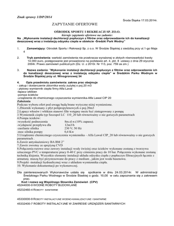 Znak sprawy 1/DP/2014 Środa Śląska 17.03.2014r. ZAPYTANIE OFERTOWE OŚRODEK SPORTU I REKREACJI SP. ZO.O. kieruje zapytanie ofertowe na zadanie: Na „Wykonanie instalacji dechloracji popłuczyn z filtrów oraz odprowadzenie ich do kanalizacji deszczowej wraz z instalacją odzysku ciepła w obiekcie -Średzki Park Wodny” Zamawiający: Ośrodek Sportu i Rekreacji Sp. z o.o. W Środzie Śląskiej z siedzibą przy ul.1-go Maja 1. 4 2. Tryb zamówienia: wartość zamówienia nie przekracza wyrażonej w złotych równowartości kwoty 14.000 euro, postępowanie jest prowadzone na podstawie art. 4, pkt. 8 ustawy z dnia 29 stycznia 2004r. Prawo zamówień publicznych (Dz. U. z 2010r. Nr 113, poz. 759 ze zm.) 3. Nazwa zadania: ”Wykonanie instalacji dechloracji popłuczyn z filtrów oraz odprowadzenie ich do kanalizacji deszczowej wraz z instalacją odzysku ciepła” w Średzkim Parku Wodnym w Środzie Śląskiej przy ul. Winogronowej 34 4. Opis przedmiotu zamówienia: zakres prac obejmuje - zakup i dostarczenie zbiornika wody zużytej o poj.20 m3 - płytowy wymiennik ciepła firmy Alfa-Laval -łapacz włókien -pompa ścieków -urządzenie do chemicznego czyszczenia wymiennika-Alfa Lawal CIP 20 Założenia Podczas wyboru ofert pod uwagę będą brane wytyczne niżej wymienione. 1.Zbiornik wykonany z płyt polipropylenowych o poj.20m3 2.Łapacz włosów i włókien stanowi filtr wstępny może być zintegrowany z pompą 3.Wymiennik ciepła typ Secespol LC 110_20 lub równoważny o nie gorszych parametrach 4.Pompa ścieków: -wysokość podnoszenia 8m.sł.w.(10% zapasu). -wydajność przepływu dla 12m3/h -zasilanie silnika 230 V; 50 Hz -moc silnika pompy 0,4 Kw 5.Urządzenie chemicznego czyszczenia wymiennika – Alfa Lawal CIP_20 lub równoważny o nie gorszych parametrach . 6.Zawór antyskażeniowy BA BM 2” 7.Zawór zwrotny ze sprężyną CVD 8.Połączenia rurowe oraz zawory instalacji wody świeżej oraz ścieków wykonane zostaną z tworzywa sztucznego PVC o temperaturze pracy 0-40 C przy ciśnieniu pracy do 10 bar. Połączenia wykonane zostaną techniką klejenia. Wszystkie elementy instalacji układu odzysku ciepła z popłuczyn filtracyjnych łącznie z armaturą muszą być przystosowane do pracy z medium , jakim jest woda basenowa. 9.Projekt -instalacji hydraulicznej wraz z układem wymiennika ciepła. 10. Wykonanie dokumentacji po wykonawczej. Dla zainteresowanych Wykonawców ustala się spotkanie w dniu 24.03.2014r. W administracji Średzkiego Parku Wodnego w Środzie Ślaskiej o godz. 10,00 w celu zapoznania się z zakresem prac. Kod i nazwa wg Wspólnego Słownika Zamówień (CPV) 45244000-9 WODNE ROBOTY BUDOWLANE 45232460-4 ROBOTY SANITARNE 45330000-9 ROBOTY INSTALACYJNE WODNO-KANALIZACYJNE I SANITARNE 45332400-7 ROBOTY INSTALACYJNE W ZAKRESIE URZĄDZEŃ SANITARNYCH 5. Miejsce i termin złożenia ofert: ofertę należy złożyć do dnia 01.04.2014r do godz. 9.00. w Średzkim Parku Wodnym w Środzie Śląskiej przy ul. Winogronowej 34 1) W przypadku składania ofert pocztową (przesyłka polecona lub poczta kurierska), przesłania faksem [na nr (601054318], lub e-mail: [email protected], za termin jej złożenia przyjęty będzie dzień i godzina otrzymania oferty przez zamawiającego. 2) Wszystkie oferty otrzymane przez zamawiającego po podanym powyżej terminie zostaną odrzucone i nie będą oceniane. 3) W toku badania i oceny ofert zamawiający może żądać od każdego oferenta dodatkowych informacji i wyjaśnień dotyczących treści złożonych ofert. 6. Termin wykonania zamówienia: 25.04.2014r, 7. 8. Miejsce i sposób uzyskania informacji dotyczących przygotowanej oferty: Dodatkowe wyjaśnienia i informacje dotyczące zamówienia można otrzymać w godz. od 09:00 do 14:00 pod wymienionym niżej numerem telefonu, lub osobiście w siedzibie zamawiającego: a) w sprawach dotyczących przedmiotu zamówienia: Ryszard Adamiak kierownik techniczny w Średzkim Parku Wodnym tel.885610885 b) w sprawach dotyczących spraw formalno-prawnych Arkadiusz Gubała – Dyrektor Średzkiego Parku Wodnego w Środzie Ślaskiej tel 885130885 Kryterium wyboru ofert: 100% cena brutto. Oferowana cena musi uwzględniać wszystkie koszty pośrednie i bezpośrednie związane z wykonaniem zamówienia. Wynagrodzenie z wykonania robót budowlanych określonych w pkt 4 niniejszego zapytanie ofertowego będzie wynagrodzeniem ryczałtowym. 2) Wykonawca nie będzie miał prawa żądać podwyższenia wynagrodzenia, nawet, gdy w chwili zawierania umowy nie można było prawidłowo przewidzieć i ocenić rozmiaru i kosztów prac. 3) Cena oferty winna być liczona do dwóch miejsc po przecinku. 4) Zamawiający oceniać będzie jedynie oferty spełniające wymagania określone w niniejszym zapytaniu ofertowym. Oferty nie spełniające tych warunków zostaną odrzucone. 1) 9. Wykaz dokumentów, jakie należy dołączyć do oferty: Upoważnienie osoby podpisującej ofertę do reprezentowania firmy (w oryginale lub kserokopii poświadczonej własnoręcznym podpisem Wykonawcy z adnotacją „za zgodność kopii z oryginałem” na każdej stronie dokumentu), zgodnie ze sposobem reprezentacji oferenta określonym we właściwym rejestrze lub ewidencji działalności gospodarczej, właściwym dla formy organizacyjnej firmy. 2) Jeżeli podpisy na ofercie nie wynikają między innymi z odpisu lub wyciągu z właściwego rejestru lub ewidencji wymagane jest załączenie pełnomocnictwa w oryginale do składania podpisów w imieniu składającego ofertę. 3) aktualny odpis z właściwego rejestru lub z centralnej ewidencji i informacji o działalności gospodarczej, jeżeli odrębne przepisy wymagają wpisu do rejestru lub ewidencji, w celu wykazania braku podstaw do wykluczenia w oparciu o art. 24 ust. 1 pkt 2 ustawy, wystawiony nie wcześniej niż 6 miesięcy przed upływem terminu składania wniosków o dopuszczenie do udziału w postępowaniu o udzielenie zamówienia albo składania ofert; 1) 10. Sposób prz
