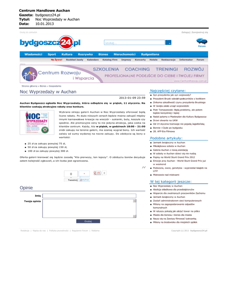 Centrum Handlowe Auchan Gazeta: bydgoszcz24.pl Tytu³: Noc Wyprzeda¿y w Auchan Data: 10.01.2013 Dodaj do zakładek Zaloguj | Zarejestruj się szukaj... Forum Wiadomości Sport Kultura Na Żywo! Rozrywka Rozkład Jazdy Biznes Kalendarz Nieruchomości Katalog Firm Imprezy Bydgostiana Koncerty Hotele Restauracje Informator Forum reklama Strona główna Biznes Gospodarka Najczęściej czytane: Noc Wyprzedaży w Auchan ■ Syn prezydenta jak syn wojewody? 2013-01-09 23:59 ■ Prezydent Bruski odesłał społeczników z kwitkiem Auchan Bydgoszcz ogłosiła Noc Wyprzedaży, która odbędzie się w p iątek, 11 stycznia. Na ■ Znikoma szkodliwość czynu prezydenta Bruskiego klientów czekają atrakcyjne rabaty oraz konkurs. ■ W święta zalało urząd wojewódzki Wybrane sklepy galerii Auchan w Noc Wyprzedaży oferować będą ■ Piotr Tomaszewski: Będą problemy, ale potem będzie korzystniej i lepiej liczne rabaty. Po dużo niższych cenach będzie można zakupić między ■ Nadal pytamy o Masterplan dla Kultury Bydgoszczy innymi karnawałowe kreacje na wieczór - sukienki, buty, koszule czy spodnie. Ale promocyjne ceny to nie jedyna atrakcja, jaka czeka na klientów centrum. Każdy, kto w piątek, w godzinach 18:00 - 21:00 zrobi zakupy na terenie galerii, ma szansę wygrać bony. Ich wartość ■ Drzwi otwarte na UKW ■ Od 14 stycznia tramwaje nie pojadą Jagiellońską ■ Bonnie i Clyde po bydgosku ■ 28. AFF-Era Filmowa zależy od sumy wydanej na nocne zakupy. Do zdobycia są bony o wartości: Podobne artykuły: ■ Jarmark świąteczny w Auchan ■ 25 zł za zakupy powyżej 75 zł, ■ Mikołajkowa sobota w Auchan ■ 50 zł za zakupy powyżej 150 zł, ■ Galeria Auchan z nową aranżacją ■ 100 zł za zakupy powyżej 300 zł. ■ W soboty w Auchan dzieci się nie nudzą Oferta galerii kierować się będzie zasadą "Kto pierwszy, ten lepszy". O zdobyciu bonów decyduje ■ Popisy na World Stunt Grand Prix 2012 zatem kolejność z głoszeń, a ich liczba jest ograniczona. ■ Emocje przy Auchan - World Stunt Grand Prix już w weekend /-/ 0 Tweetnij + ■ Podwozia, owce, genetyka - wyprzedaż książek na UTP 0 ■ Mistrzowie nad mistrzami wykop W tej kategorii jeszcze: ■ Noc Wyprzedaży w Auchan Opinie ■ Abolicja składkowa dla przedsiębiorców ■ Wsparcie dla zwalnianych pracowników Zachemu Imię ■ Jarmark świąteczny w Auchan 5 Twoja opinia ■ Zostań administratorem sieci komputerowych ■ Miliony na zagospodarowanie odpadów komunalnych ■ W ratuszu pokażą jak ułożyć towar na półce 6 Dodaj Redakcja | Napisz do nas | Polityka prywatności | Regulamin Forum | Reklama ■ Miasto dla biznesu i biznes dla miasta ■ Naucz się na Zawiszy filmować lustrzanką ■ Miliony na środowisko dla miejskich spółek Copyright (c) 2013 bydgoszcz24.pl