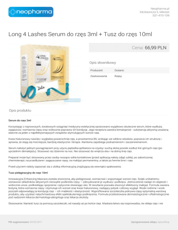 Neopharma.pl Mickiewicza 5, Mikstat 531-470-109 Long 4 Lashes Serum do rzęs 3ml + Tusz do rzęs 10ml Cena: 66,99 PLN Opis słownikowy Producent Oceanic Zastosowanie Rzęsy Opis produktu Serum do rzęs 3ml Korzystając z najnowszych, światowych osiągnięć medycyny estetycznej opracowano wyjątkowo skuteczne serum, które wydłuża, zagęszcza i wzmacnia rzęsy oraz widocznie poprawia ich kondycję. Jego receptura zawiera bimatoprost - substancję aktywną uważaną obecnie za jeden z najefektywniejszych związków stymulujących wzrost rzęs. Kwas hialuronowy nawilża i wygładza powierzchnię rzęs, a prowitamina B5, wnikając we włókno włosków, poprawia ich strukturę i sprawia, że stają się mocniejsze, bardziej elastyczne i lśniące. Alantoina zapobiega podrażnieniom i zaczerwienieniom. Serum nałożyć jednym pociągnięciem przy użyciu pędzelka-aplikatora na czystą i suchą skórę powiek wzdłuż linii górnych rzęs (po uprzednim demakijażu). Stosować raz dziennie na noc. Nie stosować do wnętrza oka i na dolną linię rzęs. Preparat może być stosowany przez osoby noszące szkła kontaktowe (przed aplikacją należy zdjąć szkła), po zakończonej chemioterapii, na przedłużane i zagęszczane rzęsy, na makijaż permanentny, a także po hennie brwi i rzęs Przed użyciem należy zapoznać się z ulotką informacyjną znajdującą się wewnątrz opakowania. Tusz pielęgnacyjny do rzęs 10ml Innowacyjna Enhancing Mascara została stworzona, aby pielęgnować, wzmacniać i wspomagać wzrost rzęs. Dzięki unikalnemu zestawowi składników aktywnych niezwykle podkreśla rzęsy – zdecydowanie je wydłuża i podkręca. Jednocześnie nadaje im objętość i widocznie unosi, podkreślając spojrzenie i optycznie otwierając oko. W rezultacie pozwala stworzyć efektowny makijaż. Formuła zawiera biotynę, która wzmacnia rzęsy i stymuluje ich wzrost oraz kwas hialuronowy, nadający połysk i zdrowy wygląd. Woski roślinne i wosk pszczeli odpowiadają za kondycję rzęs – ich miękkość i elastyczność. Wyprofilowana szczoteczka pokrywa rzęsy optymalną warstwą produktu, aby uzyskać natychmiastowy efekt spektakularnego podkręcenia. Formuła przetestowana dermatologicznie i oftalmologicznie pod nadzorem lekarza dermatologa-alergologa oraz lekarza okulisty. Stosowanie: Nanieść tusz za pomocą szczoteczki, od nasady aż po końce rzęs. Maskara łatwo się rozprowadza, nie skleja rzęs i nie Plik wygenerowano: 04-03-2017 Oprogramowanie sklepu: AptusShop Neopharma.pl Mickiewicza 5, Mikstat 531-470-109 pozostawia grudek. Perfekcyjny demakijaż zapewni Pielęgnacyjny 2-fazowy płyn do demakijażu oczu z biotyną z serii LONG4LASHES. 3 kroki do spektakularnego efektu: 1. Pierwsza warstwa tuszu buduje długość rzęs od nasady aż po same końce (i tworzy bazę dla następnych warstw). 2. Druga warstwa pogrubia rzęsy i nadaje im objętość. 3. Trzecia warstwa zapewnia widoczne podkręcenie i idealne rozdzielenie. Plik wygenerowano: 04-03-2017 Powered by TCPDF (www.tcpdf.org) Oprogramowanie sklepu: AptusShop