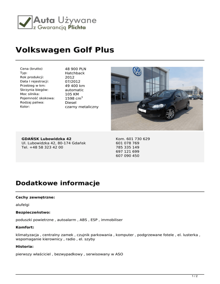 Volkswagen Golf Plus Cena (brutto) Typ: Rok produkcji: Data I rejestracji: Przebieg w km: Skrzynia biegów: Moc silnika: Pojemność skokowa: Rodzaj paliwa: Kolor: 48 900 PLN Hatchback 2012 07/2012 49 400 km automatic 105 KM 1598 cm3 Diesel czarny metaliczny GDAŃSK Lubowidzka 42 Ul. Lubowidzka 42, 80-174 Gdańsk Tel. +48 58 323 42 00 Kom. 601 730 629 601 078 769 785 335 149 697 121 699 607 090 450 Dodatkowe informacje Cechy zewnętrzne: alufelgi Bezpieczeństwo: poduszki powietrzne , autoalarm , ABS , ESP , immobiliser Komfort: klimatyzacja , centralny zamek , czujnik parkowania , komputer , podgrzewane fotele , el. lusterka , wspomaganie kierownicy , radio , el. szyby Historia: pierwszy właściciel , bezwypadkowy , serwisowany w ASO 1/2 Gwarancja Szanowni Państwo, Pragniemy Państwa poinformować, iż firma Plichta – Autoryzowany Dealer Škoda Auto prowadzi skup oraz sprzedaż samochodów używanych wszystkich marek, oferując także samochody używane z gwarancją objęte programem „Auta używane z Gwarancją Plichta”. W ramach programu „Auta Używane z Gwarancją Plichta ” każdy Klient otrzymuje atrakcyjny pakiet zniżek pozwalający zoptymalizować koszty eksploatacji samochodu: -50% na serwis klimatyzacji -50% na ustawienie zbieżności -50% na kosmetykę auta -50% na ścieżkę diagnostyczną -25% na wymiany oleju -25% na zakup opon + 5zł na sezon za hotelowanie opon -15% na części i akcesoria Oferujemy również kompleksową obsługę w zakresie finansowania i ubezpieczenia: - kredyty już od 4,99% - leasingi i kredyty bez zaświadczeń - uproszczone procedury – decyzja już od 30 min. - atrakcyjne pakiety AC/OC/NW/ASS wiodących firm ubezpieczeniowych Możliwość pozostawienia dotychczas użytkowanego auta w rozliczeniu – BEZPŁATNA WYCENA!!! Zapraszamy wszystkich Klientów na jazdę próbną wybranym autem. Numer oferty: D610 Informacja nie stanowi oferty w rozumieniu art. 66 KC. Podane dane mają charakter wyłącznie informacyjny. 2/2 Powered by TCPDF (www.tcpdf.org)