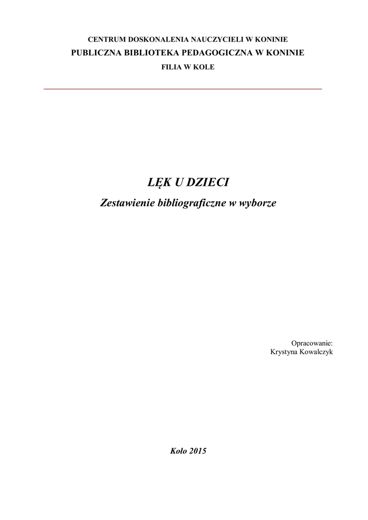 CENTRUM DOSKONALENIA NAUCZYCIELI W KONINIE PUBLICZNA BIBLIOTEKA PEDAGOGICZNA W KONINIE FILIA W KOLE ___________________________________________________________________________ LĘK U DZIECI Zestawienie bibliograficzne w wyborze Opracowanie: Krystyna Kowalczyk Koło 2015 Wydawnictwa zwarte: 1. Bajki terapeutyczne dla dzieci / Maria Molicka.- Leszno : Maria Molicka, 1998. Sygnatura: 30823 2. Bajki terapeutyczne dla dzieci / Maria Molicka.- Wyd. 2 popr. i uzup.- Poznań : Media Rodzina, [2006]. Sygnatura: 34823 3. Bajkoterapia : o lękach dzieci i nowej metodzie terapii / Maria Molicka.- Poznań : Media Rodzina, 2002. Sygnatura: 33563 4. Diagnoza i wspomaganie rozwoju dziecka : wybrane zagadnienia / Maria Piszczek.Warszawa : Centrum Metodyczne Pomocy Psychologiczno-Pedagogicznej, 2007. Sygnatura: 35675, 37317 5. Dzieci z zaburzeniami łączonymi : ADHD, trudności w nauce, zespół Aspergera, zespół Touretta, depresja dwubiegunowa i inne zaburzenia / Martin L. Kutscher, Tony Attwood, Robert R. Wolff.- Warszawa : Wydawnictwo K. E. Liber, 2007. Sygnatura: 35465 6. Dziecko z zaburzeniami lękowymi w szkole i przedszkolu : informacje dla pedagogów i opiekunów / Ida Derezińska, Monika Gajdzik.- Warszawa : Ośrodek Rozwoju Edukacji, 2010. Sygnatura: 1641 bp., 1648 bp. 7. Lęk i fobie nastolatków : jak pomóc dzieciom przezwyciężyć napady paniki / Sara G. Mattis, Thomas H. Ollendick.- Gdańsk : Gdańskie Wydawnictwo Psychologiczne, 2004. Sygnatura: 33815 8. Lęk społeczny / Mark Leary, Robin M. Kowalski.- Gdańsk : Gdańskie Wydawnictwo Psychologiczne, 2001. Sygnatura: 32229 9. Lęk u dziecka / Teresa Maria Bochwic.- Wyd. 2 uzup.- Warszawa : Państwowy Zakład Wydawnictw Lekarskich, 1991. Sygnatura: 35203 10. Lęk u dziecka / Teresa Maria Bochwic.- Warszawa : Państwowy Zakład Wydawnictw Lekarskich, 1985. Sygnatura: 22646 11. O dzieciach lękliwych, smutnych i niespokojnych : duchowe podstawy praktyki wychowawczej / Henning Köhler.- Kraków : Oficyna Wydawnicza "Impuls", 2009. Sygnatura: 36362 12. Obniżanie poziomu przemocy i lęku młodzieży gimnazjalnej / Agnieszka Lewicka-Zelent.- Lublin : Wydawnictwo Uniwersytetu Marii Curie-Skłodowskiej, 2012. Sygnatura: 37625 13. Psychologia rozwiązywania problemów szkoły / pod red. Jolanty Miluskiej.- Poznań : "Bonami" Wydawnictwo, 2001. Sygnatura: 33558 14. Psychoterapia dzieci i młodzieży : metody oparte na dowodach / red. Alan E. Kazdin, John R. Weisz.- Kraków : Wydawnictwo Uniwersytetu Jagiellońskiego, 2006. Sygnatura: 34778 15. Rozwijanie umiejętności społecznych dziecka : interwencje przez zabawę / Linda A. Reddy.- Warszawa : Wydawnictwo Naukowe PWN, 2014. Sygnatura: 38019 16. Trudne tematy dla mamy i taty czyli Jak wychować dziecko na człowieka / Anna Jankowska.- Kraków : Wydawnictwo Zielona Sowa, 2010. Sygnatura: 37204 Wydawnictwa ciągłe: 1. Ale wstyd! / Kinga Rusin // Głos Pedagogiczny . - 2014, nr 63, s. 17-19 2. Agresja i lękliwość w wieku przedszkolnym / Agata Celmer // Wychowanie na co Dzień. - 2008, nr 12, Wkładka s. I - VI 3. Ankieta badająca poziom stresu wśród uczniów / Katarzyna Droga // Głos Pedagogiczny . - 2010, nr 22, s. 42 4. Ankieta pomocna przy ocenie lęków ucznia pod kątem specyficznych fobii dziecięcych / Magdalena Alenowicz.// Głos Pedagogiczny. - 2013, nr 50, s. 39 5. Bajka jako metoda redukcji lęku u dzieci / Maria Molicka // Problemy Opiekuńczo Wychowawcze .-2001 , nr 1 , s. 40-44 6. Bajki nie-bajki i bajkoterapia / Wita Szulc // Życie Szkoły. - 2006, nr 6, s. 5-11 7. Bajki pomagają dzieciom oswoić lęk / Jadwiga Lubowiecka // Wychowanie w Przedszkolu . - 2011, nr 5, s. 12-17 8. Bariery psychiczne utrudniające naukę / Karolina K. Walczykowska // Edukacja i Dialog. - 2006, nr 7, s. 30-36 9. Boimy się zasnąć - książki, które pomagają rozwiać wieczorne lęki / Maria Kulik // Guliwer. - 2006, nr 2, s. 27-29 10. Dlaczego dziecko płacze za mamą? / Dagmara Kaczmarska // Wychowanie w Przedszkolu . - 2012, nr 8, s. 28-[31] 11. Dziecięce emocje / Anna Kałuba-Korczak ; rozm. przepr. Agata Klimaszewska // Życie Szkoły . - 2014, nr 11, s. 4-7 12. Dziewczynka z zapałkami - archetyp zrezygnowanej dziewczynki / Iwona Jędrusik // Remedium . - 2014, nr 9, s. 17-19 13. Fobia szkolna : co robić, kiedy dziecko boi się iść do szkoły? / Magdalena Pitala ; Ewa Srebro // Nauczanie Początkowe. - 2006/2007, nr 1, s. 43-54 14. Fobia szkolna - wymówka czy emocjonalny problem? / Magdalena Alenowicz // Głos Pedagogiczny . - 2012, nr 41, s. 51-53 15. Gdy potwór się śni : jak pomóc dzieciom w zasypianiu? / Agnieszka Bisz // Wychowanie w Przedszkolu . - 2010, nr 10, s. 42-46 16. Gdy strach ma wielkie oczy / Magdalena Alenowicz // Głos Pedagogiczny . - 2013, nr 50, s. 19-20 17. Kiedy boję się szkoły? : metody oddziaływań biblioterapeutycznych minimalizujących lęk i agresję wśród dzieci i młodzieży / Wanda Matras-Mastalerz // Poradnik Bibliotekarza. - 2009, nr 6, s. 36-39 18. Kiedy szkoła przestrasza... / Joanna Kułakowska // Psychologia w Szkole . - 2014, nr 2, s. 63-69 19. Konsekwencje lęku szkolnego / Aleksandra Plewińska // Edukacja i Dialog. - 2006, nr 3, s. 44-49 20. Lęk a zachowanie nieśmiałe nastolatków w sytuacji ekspozycji społecznej / Danuta Borecka-Biernat // Psychologia Wychowawcza .-1996 , nr 5 , s. 418-426 21. Lęk szkolny / Kinga Rusin // Głos Pedagogiczny . - 2014, nr 61, s. 47-49 22. Lęk szkolny dziecka na etapie wczesnej edukacji / Irena Stańczak // Nauczanie Początkowe : kształcenie zintegrowane . – 2010/2011, nr 1, s. 14-19 23. Lęki dzieci / Sylwia Gallos // Wychowanie w Przedszkolu . - 2011, nr 2, s. 53-55 24. Mam w sobie potwora... . Cz. 2 / Aleksandra Karasowska // Remedium . - 2012, nr 7/8, s. 10-11 25. Nie taki mrok straszny / Małgorzata Wróbel // Wychowanie w Przedszkolu . - 2010, nr 10, s. 48-49 26. Niwelowanie lęków u dzieci - propozycja zajęć w przedszkolu / Joanna Bawoł // Wychowanie na Co Dzień . - 2010, nr 1/2