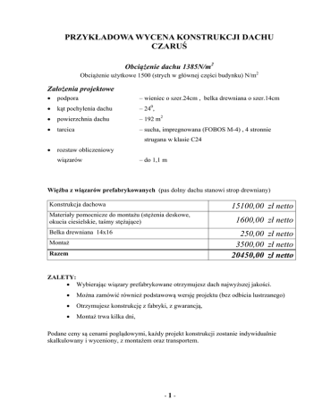 PRZYKŁADOWA WYCENA KONSTRUKCJI DACHU CZARUŚ Obciążenie dachu 1385N/m2 Obciążenie użytkowe 1500 (strych w głównej części budynku) N/m2 Założenia projektowe podpora – wieniec o szer.24cm , belka drewniana o szer.14cm kąt pochylenia dachu – 240, powierzchnia dachu – 192 m2 tarcica – sucha, impregnowana (FOBOS M-4) , 4 stronnie strugana w klasie C24 rozstaw obliczeniowy wiązarów – do 1,1 m Więźba z wiązarów prefabrykowanych (pas dolny dachu stanowi strop drewniany) Konstrukcja dachowa 15100,00 zł netto Materiały pomocnicze do montażu (stężenia deskowe, okucia ciesielskie, taśmy stężające) Belka drewniana 14x16 1600,00 zł netto 250,00 zł netto 3500,00 zł netto 20450,00 zł netto Montaż Razem ZALETY: Wybierając wiązary prefabrykowane otrzymujesz dach najwyższej jakości. Można zamówić również podstawową wersję projektu (bez odbicia lustrzanego) Otrzymujesz konstrukcję z fabryki, z gwarancją, Montaż trwa kilka dni, Podane ceny są cenami poglądowymi, każdy projekt konstrukcji zostanie indywidualnie skalkulowany i wyceniony, z montażem oraz transportem. -1-
