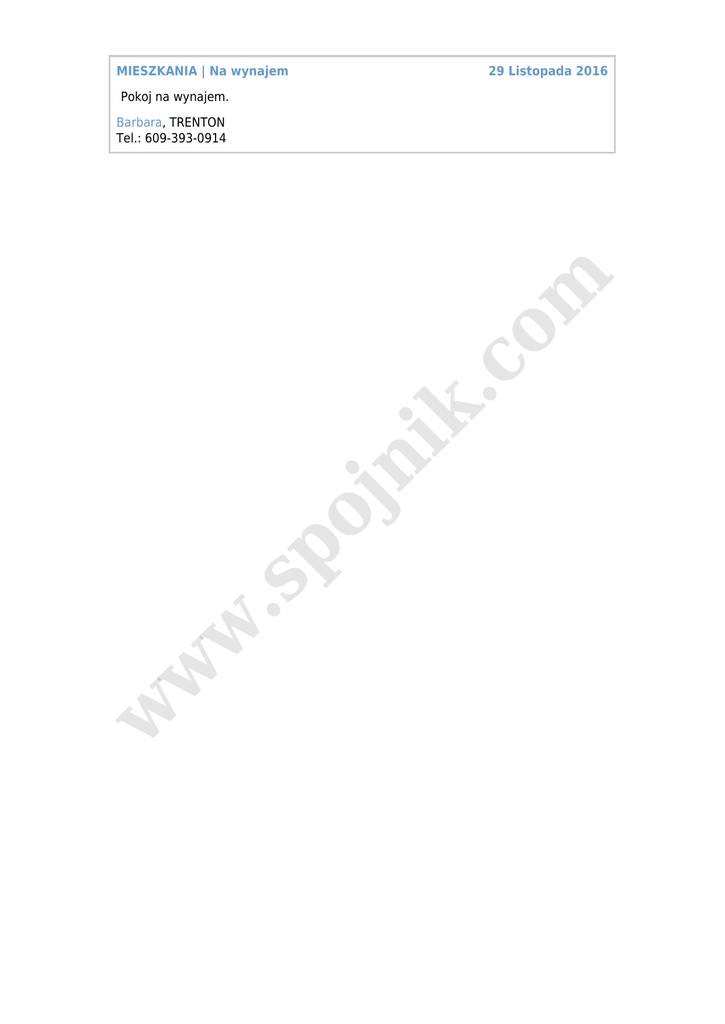 MIESZKANIA | Na wynajem 29 Listopada 2016 Pokoj na wynajem. w w w .s po jn ik .c o m Barbara, TRENTON Tel.: 609-393-0914