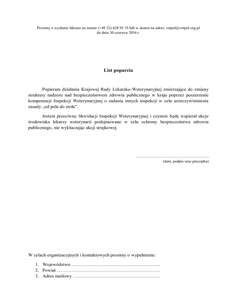 Prosimy o wysłanie faksem na numer (+48 22) 628 93 35 lub w skanie na adres: [email protected] do dnia 30 czerwca 2016 r. List poparcia Popieram działania Krajowej Rady Lekarsko-Weterynaryjnej zmierzające do zmiany struktury nadzoru nad bezpieczeństwem zdrowia publicznego w kraju poprzez poszerzenie kompetencji Inspekcji Weterynaryjnej o zadania innych inspekcji w celu urzeczywistnienia zasady „od pola do stołu”. Jestem przeciwny likwidacji Inspekcji Weterynaryjnej i czynnie będę wspierał akcje środowiska lekarzy weterynarii podejmowane w celu ochrony bezpieczeństwa zdrowia publicznego, nie wykluczając akcji strajkowej. ………………………………………. (data, podpis oraz pieczątka) W celach organizacyjnych i kontaktowych prosimy o wypełnienie: 1. Województwo ……………………………………………….. 2. Powiat ……………………………………………………….. 3. Adres mailowy ……………………………………………….