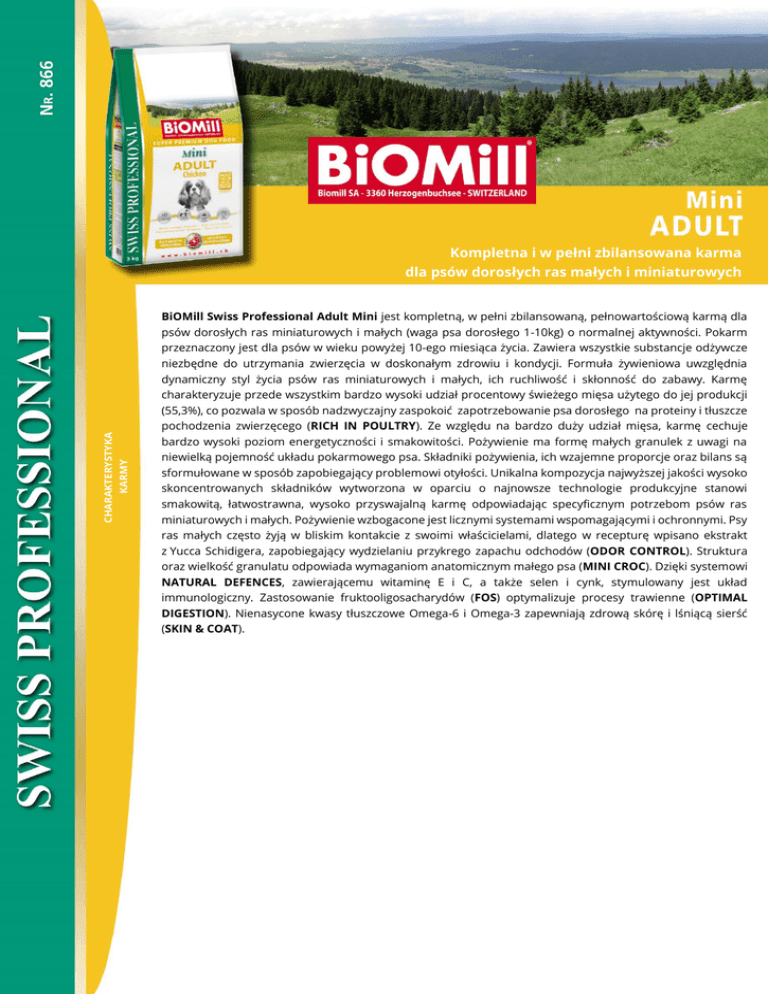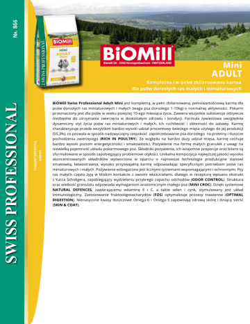 CHARAKTERYSTYKA KARMY Kompletna i w pełni zbilansowana karma dla psów dorosłych ras małych i miniaturowych BiOMill Swiss Professional Adult Mini jest kompletną, w pełni zbilansowaną, pełnowartościową karmą dla psów dorosłych ras miniaturowych i małych (waga psa dorosłego 1-10kg) o normalnej aktywności. Pokarm przeznaczony jest dla psów w wieku powyżej 10-ego miesiąca życia. Zawiera wszystkie substancje odżywcze niezbędne do utrzymania zwierzęcia w doskonałym zdrowiu i kondycji. Formuła żywieniowa uwzględnia dynamiczny styl życia psów ras miniaturowych i małych, ich ruchliwość i skłonność do zabawy. Karmę charakteryzuje przede wszystkim bardzo wysoki udział procentowy świeżego mięsa użytego do jej produkcji (55,3%), co pozwala w sposób nadzwyczajny zaspokoić zapotrzebowanie psa dorosłego na proteiny i tłuszcze pochodzenia zwierzęcego (RICH IN POULTRY). Ze względu na bardzo duży udział mięsa, karmę cechuje bardzo wysoki poziom energetyczności i smakowitości. Pożywienie ma formę małych granulek z uwagi na niewielką pojemność układu pokarmowego psa. Składniki pożywienia, ich wzajemne proporcje oraz bilans są sformułowane w sposób zapobiegający problemowi otyłości. Unikalna kompozycja najwyższej jakości wysoko skoncentrowanych składników wytworzona w oparciu o najnowsze technologie produkcyjne stanowi smakowitą, łatwostrawna, wysoko przyswajalną karmę odpowiadając specyficznym potrzebom psów ras miniaturowych i małych. Pożywienie wzbogacone jest licznymi systemami wspomagającymi i ochronnymi. Psy ras małych często żyją w bliskim kontakcie z swoimi właścicielami, dlatego w recepturę wpisano ekstrakt z Yucca Schidigera, zapobiegający wydzielaniu przykrego zapachu odchodów (ODOR CONTROL). Struktura oraz wielkość granulatu odpowiada wymaganiom anatomicznym małego psa (MINI CROC). Dzięki systemowi NATURAL DEFENCES, zawierającemu witaminę E i C, a także selen i cynk, stymulowany jest układ immunologiczny. Zastosowanie fruktooligosacharydów (FOS) optymalizuje procesy trawienne (OPTIMAL DIGESTION). Nienasycone kwasy tłuszczowe Omega-6 i Omega-3 zapewniają zdrową skórę i lśniącą sierść (SKIN & COAT). WITH FRESH CHICKEN – dieta wzbogacona w kawałki świeżego mięsa z kurczaka SKIN & COAT – Niezbędne, Nienasycone Kwasy Tłuszczowe Omega – 3 i Omega – 6, wspomagają pracę serca i układu krążenia oraz zapobiegają powstawaniu zmian miażdżycowych. NNKT optymalizują również pracę układu trawiennego, wzmagają pamięć i koncentrację a także perfekcyjnie odżywiają skórę i sierść zwierzęcia L-CARNITIN – L-Carnityna dla stymulacji efektywnego spalania tłuszczy w procesie trawienia Składniki analityczne Wartość Jednostka /kg 9.0 Białko surowe % 24.0 Witamina D3 /Ul Tłuszcz % 15.5 Witamina E /Ul Włókno surowe % 2.5 Popiół surowy % 6.5 Wapń % 1.2 Fosfor % 0.8 Potas % 0.6 Sód % 0.4 Magnez % Kwas tłuszczowy Omega-6 % Kwas tłuszczowy Omega-3 % 0.12 Wartość Witamina A /Ul Jednostka /kg 12.000 1.300 100 Witamina B1 /mg 10 Witamina B2 /mg 20 Witamina C /mg Kwas nikotynowy /mg Kwas pantotenowy /mg Witamina B6 /mg Witamina B12 /mcg 3.3 Biotyna /mcg 0.6 Kwas foliowy /mg Wartość Cholina /mg Suplementy żywieniowe Jednostka /kg Wilgotność % OGÓLNA ANALIZA CHEMICZNA NATURAL DEFENCES – kompozycja witamin A, E i C, a także selenu i cynku, wzmacniająca i stymulująca układ odpornościowy Drób (26%, dehydratyzowane mięso drobiowe i 4,5% świeżych kawałków kurczaka), ryż, kukurydza, pszenica, tłuszcz drobiowy, siemię lniane, mączka rybna, suszona pulpa buraka cukrowego, drożdże piwne, hydrolizowana wątróbka, koncentrat protein sojowych, sól, lignoceluloza, fruktooligosacharydy (FOS 0,2%), lecytyna, sproszkowana Yucca (0,1%), (surowce nie pochodzą z hodowli ekologicznych). Suplementy żywieniowe SKŁADNIKI ODOR CONTROL – ekstrakt z Yucca Shiedegera, eliminuje nieprzyjemny zapach odchodów, w tym moczu o +/- 30 % i kału o +/- 70% OPTIMAL DIGESTION – kompozycja probiotyków, fruktooligosacharydów (F.O.S.) i ekstraktów roślinnych dla wzbogacenia flory bakteryjnej i pobudzenia enzymów trawiennych układu pokarmowego zwierzęcia oraz unikalne włókno na bazie akacji afrykańskiej, dla oczyszczania, detoksykacji, i podniesienia kultury pracy układu pokarmowego. 40 30 1.300 DL-metionina /mg 300 L-karnityna /mg 100 Tauryna /mg Żelazo /mg 85 Miedź /mg 12 Mangan /mg 20 Cynk /mg 8 180 Jod /mg 100 2 Selen /mcg 800 2 200 Energia metaboliczna M.E. SUPLEMENTY MINI CROC (Mały Krokiet) – wielkość, kształt, struktura i twardość granulatu odpowiadają wymogom anatomicznym i fizjologicznym psa rasy małej i miniaturowej Kcal EM 3.826 TABELA DAWKOWANIA Dodatki technologiczne: Antyoksydanty Tabela racjonowania pożywienia znajduje się z tyłu opakowania w górnej jego części. Określa ona wielkość dziennego dawkowania karmy, w odniesieniu do aktualnej wagi i poziomu aktywności zwierzęcia. Stanowi ona wzorzec dziennej porcji żywieniowej, zapobiegając tym samym niedowadze lub nadwadze. Należy regularnie sprawdzać wagę psa ze względu na prawidłowe dopasowanie dawki pożywienia do faktycznego zapotrzebowania organizmu na substancje odżywcze. Zaleca się permanentną kontrolę wagi zwierzęcia w odniesieniu do standardów wagowych danej rasy. Karma jest wyprodukowana na 18 miesięcy przed datą przydatności do spożycia. Zaleca się zamykanie opakowania po otwarciu lub przechowywanie pokarmu w specjalistycznym pojemniku magazynującym BiOMill, chroniącym pożywienie przed destruktywnie wpływającymi na niego czynnikami zewnętrznymi, takimi jak: światło, wilgoć oraz powietrze. Karmę należy przechowywać w suchym i chłodnym miejscu (w temperaturze nie wyższej niż 25˚C). Zaleca się unikać bezpośredniego wpływu na karmę lub opakowanie promieni słonecznych oraz bezpośredniego kontaktu karmy lub opakowania z ziemią. Data przyda