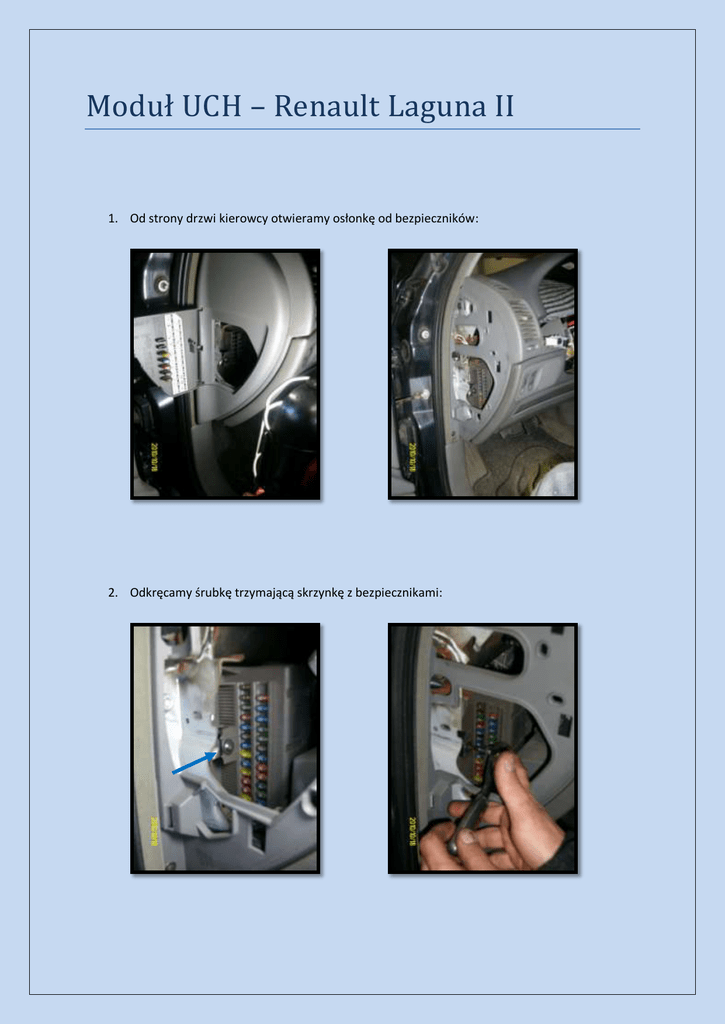 Moduł UCH – Renault Laguna II 1. Od strony drzwi kierowcy otwieramy osłonkę od bezpieczników: 2. Odkręcamy śrubkę trzymającą skrzynkę z bezpiecznikami: 3. Ściągamy osłonkę z nad pedałów: 4. Od dołu wyczepiamy skrzynkę z bezpiecznikami i ściągamy ją między pedały: 5. Z modułu wyczepamy wtyczki: 6. Teraz wyczepid z zatrzasków trzymających moduł z dwóch stron: 7. I mamy moduł wypięty POWODZENIA
